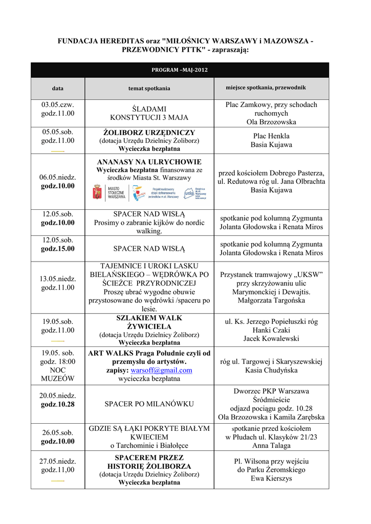 FUNDACJA HEREDITAS oraz "MIŁOŚNICY WARSZAWY i MAZOWSZA PRZEWODNICY PTTK" - zapraszają: PROGRAM –MAJ-2012 data temat spotkania 03.05.czw. godz.11.00 ŚLADAMI KONSTYTUCJI 3 MAJA 05.05.sob. godz.11.00 ŻOLIBORZ URZĘDNICZY (dotacja Urzędu Dzielnicy Żoliborz) Wycieczka bezpłatna miejsce spotkania, przewodnik Plac Zamkowy, przy schodach ruchomych Ola Brzozowska Plac Henkla Basia Kujawa ANANASY NA ULRYCHOWIE 06.05.niedz. godz.10.00 Wycieczka bezpłatna finansowana ze środków Miasta St. Warszawy przed kościołem Dobrego Pasterza, ul. Redutowa róg ul. Jana Olbrachta Basia Kujawa 12.05.sob. godz.10.00 SPACER NAD WISŁĄ Prosimy o zabranie kijków do nordic walking. spotkanie pod kolumną Zygmunta Jolanta Głodowska i Renata Miros 12.05.sob. godz.15.00 SPACER NAD WISŁĄ spotkanie pod kolumną Zygmunta Jolanta Głodowska i Renata Miros 19.05.sob. godz.11.00 TAJEMNICE I UROKI LASKU BIELAŃSKIEGO – WĘDRÓWKA PO ŚCIEŻCE PRZYRODNICZEJ Proszę ubrać wygodne obuwie przystosowane do wędrówki /spaceru po lesie. SZLAKIEM WALK ŻYWICIELA 19.05. sob. godz. 18:00 NOC MUZEÓW ART WALKS Praga Południe czyli od przemysłu do artystów. zapisy: [email protected] wycieczka bezpłatna róg ul. Targowej i Skaryszewskiej Kasia Chudyńska 20.05.niedz. godz.10.28 SPACER PO MILANÓWKU Dworzec PKP Warszawa Śródmieście odjazd pociągu godz. 10.28 Ola Brzozowska i Kamila Zarębska 26.05.sob. godz.10.00 GDZIE SĄ ŁĄKI POKRYTE BIAŁYM KWIECIEM o Tarchominie i Białołęce spotkanie przed kościołem w Płudach ul. Klasyków 21/23 Anna Talaga 27.05.niedz. godz.11,00 SPACEREM PRZEZ HISTORIĘ ŻOLIBORZA Pl. Wilsona przy wejściu do Parku Żeromskiego Ewa Kierszys 13.05.niedz. godz.11.00 (dotacja Urzędu Dzielnicy Żoliborz) Wycieczka bezpłatna (dotacja Urzędu Dzielnicy Żoliborz) Wycieczka bezpłatna Przystanek tramwajowy „UKSW” przy skrzyżowaniu ulic Marymonckiej i Dewajtis. Małgorzata Targońska ul. Ks. Jerzego Popiełuszki róg Hanki Czaki Jacek Kowalewski Koszt uczestnictwa w wycieczkach pieszych od 1 marca wynosi 5 zł / osobę W przypadku wejść do muzeów koszt nie obejmuje biletów wstępu i opłat dodatkowych. Programy są dostępne: - w biurze "Fundacji Hereditas" ul. Marszałkowska 4/4, - w PTTK ul. Podwale 23 - I p - http://spacerypowarszawie.republika.pl , spacerypowarszawie.bloog.pl http://spacery-po-warszawie-blog.onet.pl http://fundacja-hereditas.pl - oraz u przewodników podczas wycieczek. KONTAKT: 606-803-280 Osoby zainteresowane otrzymywaniem naszych programów za pośrednictwem internetu, prosimy o przesłanie swoich adresów mailowych do skrzynki [email protected]. www.fundacja-hereditas.pl