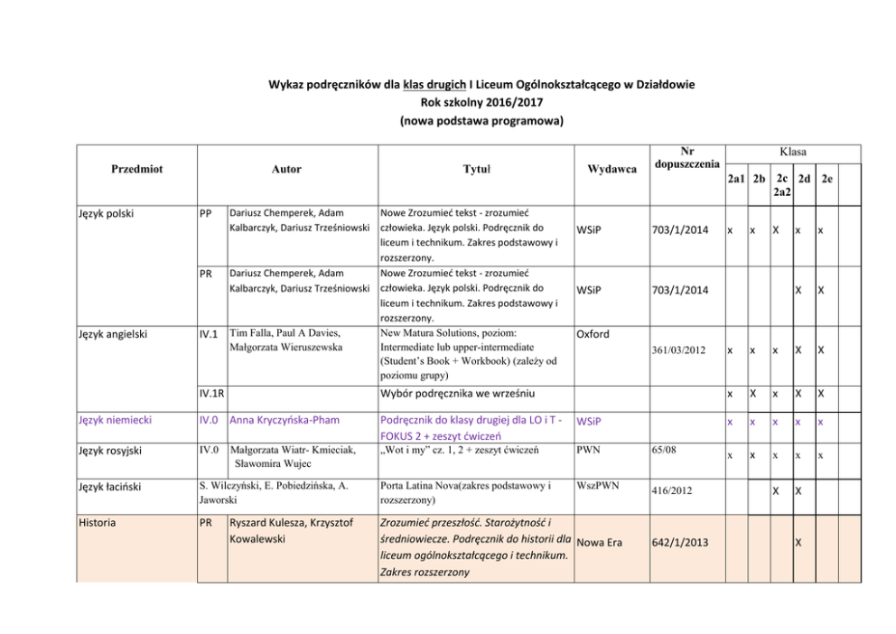 Wykaz podręczników dla klas drugich I Liceum Ogólnokształcącego