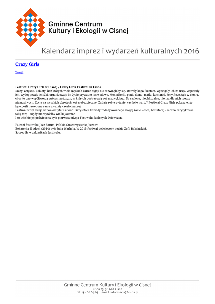 Crazy Girls Tweet Festiwal Crazy Girls w Cisnej / Crazy Girls Festival in Cisna Muzy, artystki, kobiety, bez których wiele męskich karier nigdy nie rozwinęłoby się. Dawały kopa facetom, wyciągały ich za uszy, wspierały ich, wydeptywały ścieżki, organizowały im życie prywatne i zawodowe. Menedżerki, panie domu, matki, kochanki, żony.Pozostają w cieniu, choć to one współtworzą sukces mężczyzn, w których dostrzegają coś niezwykłego. Są szalone, nieobliczalne, nie ma dla nich rzeczy niemożliwych. Życie na wysokich obrotach jest niebezpieczne. Zadają sobie pytanie: czy było warto? Festiwal Crazy Girls pokazuje, że było, jeśli nawet one same uważały często inaczej. Festiwal wziął swoją nazwę od tytułu utworu Krzysztofa Komedy zadedykowanego swojej żonie Zośce, bez której – można zaryzykować taką tezę – nigdy nie wyrósłby wielki jazzman. I to właśnie jej poświęcona była pierwsza edycja Festiwalu Szalonych Dziewczyn. Patroni festiwalu: Jazz Forum, Polskie Stowarzyszenie Jazzowe Bohaterką II edycji (2014) była Julia Warhola. W 2015 festiwal poświęcony będzie Zofii Beksińskiej. Szczegóły w zakładkach festiwalu.