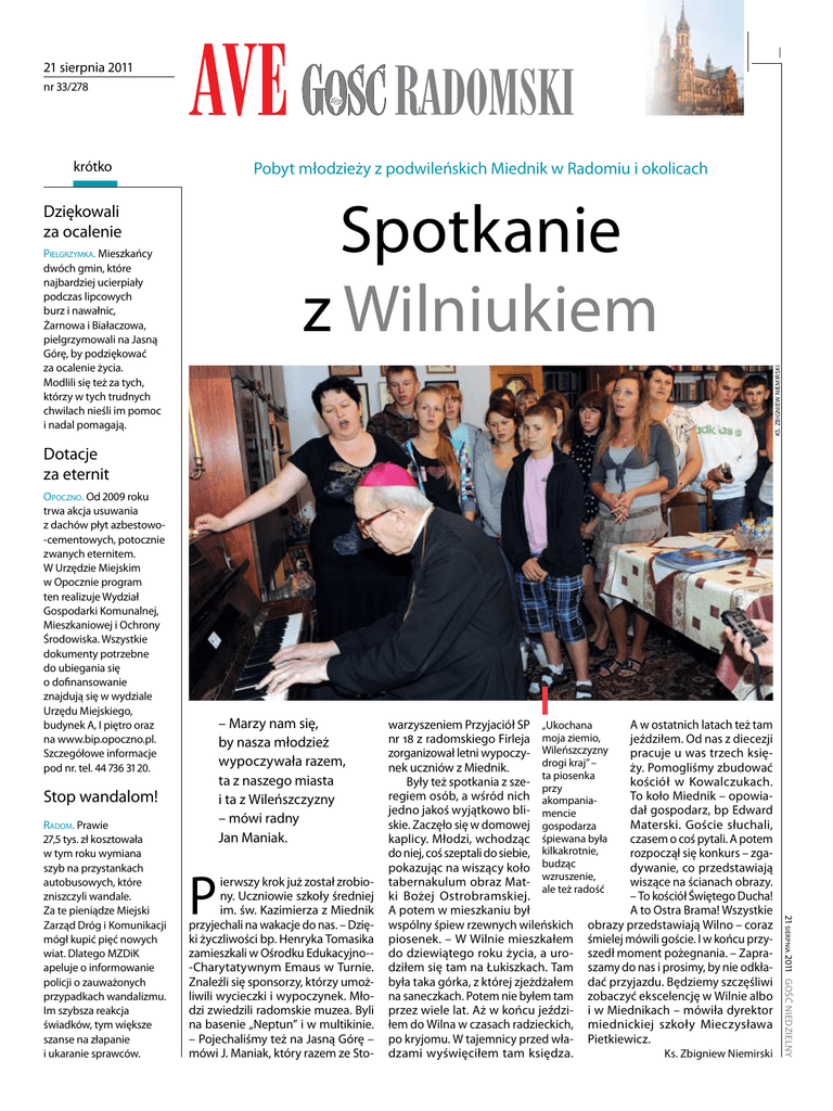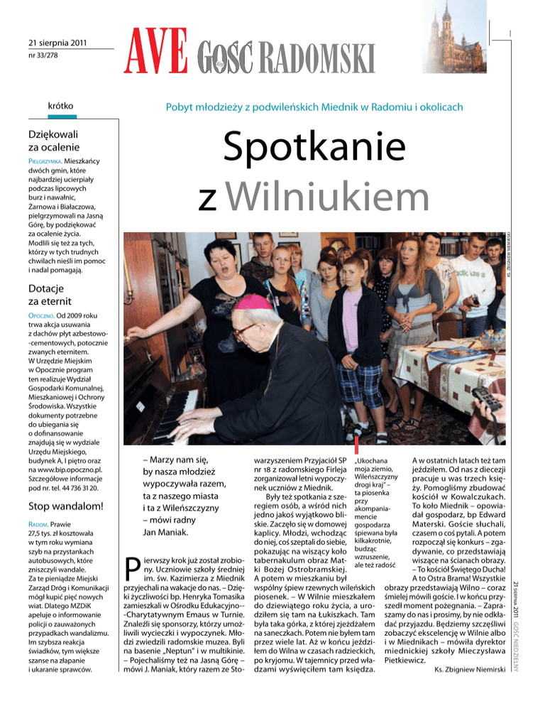 I 21 sierpnia 2011 nr 33/278 krótko Pobyt młodzieży z podwileńskich Miednik w Radomiu i okolicach Spotkanie z Wilniukiem Dziękowali za ocalenie Ks. Zbigniew Niemirski Pielgrzymka. Mieszkańcy dwóch gmin, które najbardziej ucierpiały podczas lipcowych burz i nawałnic, Żarnowa i Białaczowa, pielgrzymowali na Jasną Górę, by podziękować za ocalenie życia. Modlili się też za tych, którzy w tych trudnych chwilach nieśli im pomoc i nadal pomagają. Dotacje za eternit Opoczno. Od 2009 roku trwa akcja usuwania z dachów płyt azbestowo-cementowych, potocznie zwanych eternitem. W Urzędzie Miejskim w Opocznie program ten realizuje Wydział Gospodarki Komunalnej, Mieszkaniowej i Ochrony Środowiska. Wszystkie dokumenty potrzebne do ubiegania się o dofinansowanie znajdują się w wydziale Urzędu Miejskiego, budynek A, I piętro oraz na www.bip.opoczno.pl. Szczegółowe informacje pod nr. tel. 44 736 31 20. – Marzy nam się, by nasza młodzież wypoczywała razem, ta z naszego miasta i ta z Wileńszczyzny – mówi radny Jan Maniak. Stop wandalom! P ierwszy krok już został zrobiony. Uczniowie szkoły średniej im. św. Kazimierza z Miednik przyjechali na wakacje do nas. – Dzięki życzliwości bp. Henryka Tomasika zamieszkali w Ośrodku Edukacyjno--Charytatywnym Emaus w Turnie. Znaleźli się sponsorzy, którzy umożliwili wycieczki i wypoczynek. Młodzi zwiedzili radomskie muzea. Byli na basenie „Neptun” i w multikinie. – Pojechaliśmy też na Jasną Górę – mówi J. Maniak, który razem ze Sto- 21 sierpnia 2011 Gość Niedzielny Radom. Prawie 27,5 tys. zł kosztowała w tym roku wymiana szyb na przystankach autobusowych, które zniszczyli wandale. Za te pieniądze Miejski Zarząd Dróg i Komunikacji mógł kupić pięć nowych wiat. Dlatego MZDiK apeluje o informowanie policji o zauważonych przypadkach wandalizmu. Im szybsza reakcja świadków, tym większe szanse na złapanie i ukaranie sprawców. A w ostatnich latach też tam warzyszeniem Przyjaciół SP „Ukochana nr 18 z radomskiego Firleja moja ziemio, jeździłem. Od nas z diecezji zorganizował letni wypoczy- Wileńszczyzny pracuje u was trzech księdrogi kraj” – nek uczniów z Miednik. ży. Pomogliśmy zbudować ta piosenka Były też spotkania z sze- przy kościół w Kowalczukach. regiem osób, a wśród nich akompaniaTo koło Miednik – opowiajedno jakoś wyjątkowo bli- mencie dał gospodarz, bp Edward skie. Zaczęło się w domowej gospodarza Materski. Goście słuchali, kaplicy. Młodzi, wchodząc śpiewana była czasem o coś pytali. A potem do niej, coś szeptali do siebie, kilkakrotnie, rozpoczął się konkurs – zgapokazując na wiszący koło budząc dywanie, co przedstawiają tabernakulum obraz Mat- wzruszenie, wiszące na ścianach obrazy. ale też radość ki Bożej Ostrobramskiej. – To kościół Świętego Ducha! A potem w mieszkaniu był A to Ostra Brama! Wszystkie wspólny śpiew rzewnych wileńskich obrazy przedstawiają Wilno – coraz piosenek. – W Wilnie mieszkałem śmielej mówili goście. I w końcu przydo dziewiątego roku życia, a uro- szedł moment pożegnania. – Zapradziłem się tam na Łukiszkach. Tam szamy do nas i prosimy, by nie odkłabyła taka górka, z której zjeżdżałem dać przyjazdu. Będziemy szczęśliwi na saneczkach. Potem nie byłem tam zobaczyć ekscelencję w Wilnie albo przez wiele lat. Aż w końcu jeździ- i w Miednikach – mówiła dyrektor łem do Wilna w czasach radzieckich, miednickiej szkoły Mieczysława po kryjomu. W tajemnicy przed wła- Pietkiewicz. dzami wyświęciłem tam księdza. Ks. Zbigniew Niemirski Ave gość radomski Ave gość radomski Szkody po burzy On naprawdę rządzi pioruna – mówi proboszcz ks. kan. Marek Janas. Cztery lata temu gwałtowna wichura zerwała kilkadziesiąt metrów kwadratowych dachu. Obecny, murowany kościół to czwarta świątynia stojąca w tym miejscu. Trzy poprzednie były drewniane. Został zbudowany nieco ponad sto lat temu. md Archiwum wyprawy Stromiec. Kilkakrotne uderzenie pioruna uszkodziło instalację elektryczną kościoła parafialnego oraz instalację sterowania dzwonami i zegarem. Ocalała jedynie instalacja nagłośnieniowa. – Mimo że mamy bardzo dobrą instalację odgromową, to jednak nie sprostała kilkakrotnym uderzeniom Marta Deka Studenci zaplanowali również wzięcie udziału w Światowych Dniach Młodzieży w Madrycie Imponująca wieża kościoła jest najwyższym punktem w miejscowości Modlitwa o siłę i nadzieję Potworów. W tutejszym kościele bp Adam Odzimek przewodniczył Mszy św. sprawowanej w intencji mieszkańców gminy boleśnie dotkniętych skutkami lipcowej nawałnicy. – Chcę wam powiedzieć, abyście byli umacniani, umacniani życzliwością, ofiarnością i obecnością innych ludzi. W tej intencji będę się bar- dzo modlił wraz ze wszystkimi – mówił bp Odzimek. Z gospodarzami z Potworowa i pobliskich miejscowości modlili się także parlamentarzyści, samorządowcy oraz przedstawiciele instytucji rolniczych. W wyniku nawałnicy w gminie Potworów zniszczonych zostało 600 gospodarstw. mk Studenck a w yprawa . Pięcioro radomskich studentów wybrało się w 30-dniową podróż dookoła kontynentu. Swą wyprawę opatrzyli nazwą EuroTour 2011. Jakub Płokita, Rafał Mazurkiewicz, Sylwia Kopera, Tomasz Irzmański i Katarzyna Motyka jadą wyremontowanym 30-letnim volkswagenem busem. – Nie planujemy w detalach A kc ja chary tat y wna . Staraniem radomskich Kawalerów Maltańskich ze Sion w Szwajcarii wyjechały trzy TIR-y wiozące każdy po 42 elektryczne trójsilnikowe specjalistyczne łóżka szpitalne. Łóżka zostaną wykorzystane w warszawskim szpitalu św. Anny, w wypożyczalni Fundacji św. Kiliana w Skierbieszowie koło Zamościa, zaś część trafi do Wil- na jako wyposażenie pierwszego na Litwie stacjonarnego hospicjum tworzonego tam przez polskie siostry zakonne. – Wielkie podziękowania należą się płk. Guido Stoeckl