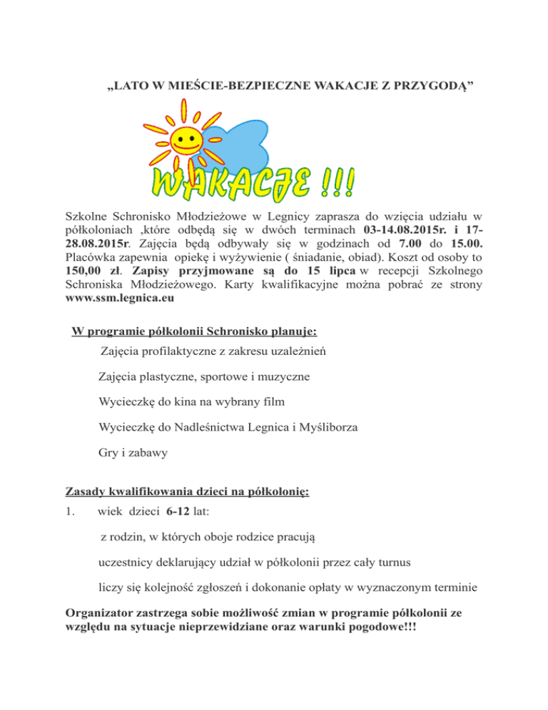 „LATO W MIEŚCIE-BEZPIECZNE WAKACJE Z PRZYGODĄ” Szkolne Schronisko Młodzieżowe w Legnicy zaprasza do wzięcia udziału w półkoloniach ,które odbędą się w dwóch terminach 03-14.08.2015r. i 1728.08.2015r. Zajęcia będą odbywały się w godzinach od 7.00 do 15.00. Placówka zapewnia opiekę i wyżywienie ( śniadanie, obiad). Koszt od osoby to 150,00 zł. Zapisy przyjmowane są do 15 lipca w recepcji Szkolnego Schroniska Młodzieżowego. Karty kwalifikacyjne można pobrać ze strony www.ssm.legnica.eu W programie półkolonii Schronisko planuje: Zajęcia profilaktyczne z zakresu uzależnień Zajęcia plastyczne, sportowe i muzyczne Wycieczkę do kina na wybrany film Wycieczkę do Nadleśnictwa Legnica i Myśliborza Gry i zabawy Zasady kwalifikowania dzieci na półkolonię: 1. wiek dzieci 6-12 lat: z rodzin, w których oboje rodzice pracują uczestnicy deklarujący udział w półkolonii przez cały turnus liczy się kolejność zgłoszeń i dokonanie opłaty w wyznaczonym terminie Organizator zastrzega sobie możliwość zmian w programie półkolonii ze względu na sytuacje nieprzewidziane oraz warunki pogodowe!!!