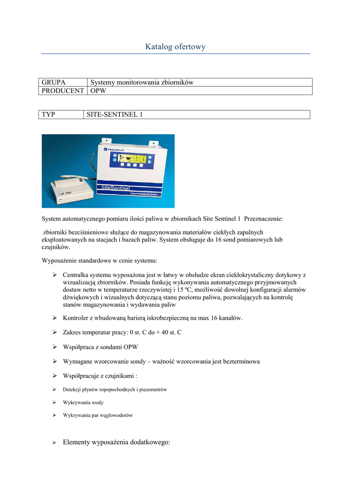 Katalog ofertowy GRUPA Systemy monitorowania zbiorników PRODUCENT OPW TYP SITE-SENTINEL 1 System automatycznego pomiaru ilości paliwa w zbiornikach Site Sentinel 1 Przeznaczenie: zbiorniki bezciśnieniowe służące do magazynowania materiałów ciekłych zapalnych eksploatowanych na stacjach i bazach paliw. System obsługuje do 16 sond pomiarowych lub czujników. Wyposażenie standardowe w cenie systemu: Centralka systemu wyposażona jest w łatwy w obsłudze ekran ciekłokrystaliczny dotykowy z wizualizacją zbiorników. Posiada funkcję wykonywania automatycznego przyjmowanych dostaw netto w temperaturze rzeczywistej i 15 ºC, możliwość dowolnej konfiguracji alarmów dźwiękowych i wizualnych dotyczącą stanu poziomu paliwa, pozwalających na kontrolę stanów magazynowania i wydawania paliw Kontroler z wbudowaną barierą iskrobezpieczną na max 16 kanałów. Zakres temperatur pracy: 0 st. C do + 40 st. C Współpraca z sondami OPW Wymagane wzorcowanie sondy – ważność wzorcowania jest bezterminowa Współpracuje z czujnikami : Detekcji płynów ropopochodnych i piezometrów Wykrywania wody Wykrywania par węglowodorów Elementy wyposażenia dodatkowego: funkcja raportowania sprzedaży, funkcja zewnętrznego alarmu sond i czujników, funkcja detekcji dostawy podczas tankowania.