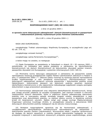 Dz.U.UE.L.2004.385.1 2009.06.26 zm. Dz.U.UE.L.2009.142.1 art. 1 ROZPORZĄDZENIE RADY (WE) NR 2252/2004 z dnia 13 grudnia 2004 r. w sprawie norm dotyczących zabezpieczeń i danych biometrycznych w paszportach i dokumentach podróży wydawanych przez Państwa Członkowskie (Dz.U.UE L z dnia 29 grudnia 2004 r.) RADA UNII EUROPEJSKIEJ, uwzględniając Traktat ustanawiający Wspólnotę Europejską, w szczególności jego art. 62 ust. 2 lit. a), uwzględniając wniosek Komisji(1), uwzględniając opinię Parlamentu Europejskiego(2), a także mając na uwadze, co następuje: (1) Rada Europejska na posiedzeniu w Salonikach w dniach 19 i 20 czerwca 2003 r. potwierdziła, że niezbędne jest spójne podejście w odniesieniu do identyfikatorów biometrycznych lub danych biometrycznych do dokumentów obywateli państw trzecich, paszportów obywateli Unii Europejskiej i systemów informacyjnych (VIS i SIS II). (2) Minimalne normy dotyczące zabezpieczeń w odniesieniu do paszportów zostały wprowadzone rezolucją przedstawicieli rządów Państw Członkowskich zebranych w Radzie w dniu 17 października 2000 r.(3). Obecnie należy rozwinąć tą rezolucję poprzez wprowadzenie środka wspólnotowego w celu określenia wzmocnionych, zharmonizowanych norm dotyczących zabezpieczeń służących ochronie paszportów i dokumentów podróży przed fałszerstwami. Jednocześnie paszport lub dokument podróży powinien zawierać identyfikatory biometryczne w celu zapewnienia niebudzącego wątpliwości związku pomiędzy dokumentem a jego prawowitym posiadaczem. (3) Harmonizacja zabezpieczeń oraz włączenie identyfikatorów biometrycznych, biorąc pod uwagę przyszłe ustalenia na szczeblu europejskim, jest ważnym krokiem w kierunku zastosowania nowych elementów, które w większym stopniu zabezpieczają dokumenty podróży oraz w wiarygodny sposób określają związek miedzy posiadaczem a jego paszportem oraz dokumentem podróży, co stanowi istotny czynnik w dziedzinie ochrony przed ich bezprawnym użyciem. Należy wziąć pod uwagę wymogi Międzynarodowej Organizacji Lotnictwa Cywilnego (ICAO), w szczególności zawarte w dokumencie 9303 dotyczącym dokumentów podróży nadających się do odczytu maszynowego. (4) Niniejsze rozporządzenie ogranicza się do harmonizacji zabezpieczeń, z uwzględnieniem identyfikatorów biometrycznych wprowadzanych do paszportów i dokumentów podróży Państw Członkowskich. Wyznaczenie władz i organów uprawnionych do dostępu do danych zawartych w nośniku pamięci dokumentów następuje na mocy przepisów krajowych z zastrzeżeniem stosownych przepisów prawa wspólnotowego, prawa Unii Europejskiej oraz umów międzynarodowych. (5) Niniejsze rozporządzenie powinno ustanowić jedynie te wymogi, które nie są niejawne. Należy je uzupełnić wymogami, które mogą pozostać tajne w celu uniknięcia ryzyka podrabiania i przerabiania dokumentów. Takie dodatkowe wymogi techniczne powinny zostać przyjęte zgodnie z decyzją Rady 1999/468/WE z dnia 28 czerwca 1999 r. ustanawiającą warunki wykonywania uprawnień wykonawczych przyznanych Komisji(4). (6) Komisja powinna być wspomagana przez Komitet ustanowiony na mocy art. 6 rozporządzenia Rady (WE) nr 1683/95 z dnia 29 maja 1995 r. ustanawiającego jednolity formularz wizowy(5). (7) W celu zagwarantowania, by informacje, o których mowa, nie były udostępniane większej liczbie osób niż jest to konieczne, istotne jest, aby każde Państwo Członkowskie wyznaczyło nie więcej niż jeden organ odpowiedzialny za sporządzanie paszportów i dokumentów podróży, przy czym, w razie potrzeby, Państwa Członkowskie mogą zmienić ten organ. Ze względów bezpieczeństwa każde Państwo Członkowskie powinno przekazać do wiadomości Komisji oraz pozostałych Państw Członkowskich nazwę właściwego organu. (8) W odniesieniu do danych osobowych, które podlegają przetwarzaniu w związku z paszportami i dokumentami podróży, zastosowanie ma dyrektywa 95/46/WE Parlamentu Europejskiego i Rady z dnia 24 października 1995 r. w sprawie ochrony osób fizycznych w zakresie przetwarzania danych osobowych i swobodnego przepływu tych danych(6). Należy zagwarantować, że w paszporcie nie będą zawarte żadne dodatkowe informacje, chyba że stanowi o tym niniejsze rozporządzenie, jego załącznik lub informację o tym umieszczono w stosownym dokumencie podróży. (9) Zgodnie z zasadą proporcjonalności, aby osiągnąć podstawowy cel wprowadzenia wspólnych norm dotyczących zabezpieczeń i interoperacyjnych identyfikatorów biometrycznych, konieczne i właściwe jest określenie zasad obowiązujących wszystkie Państwa Członkowskie stosujące Konwencję wykonawczą do Układu z Schengen z dnia 14 czerwca 1985 r.(7). Niniejsze rozporządzenie nie wykracza poza zakres tego, co jest niezbędne do osiągnięcia tego celu, zgodnie z art. 5 akapit trzeci Traktatu. (10) Zgodnie z art. 1 i 2 Protokołu w sprawie stanowiska Danii, załączonego do Traktatu o Unii Europejskiej oraz Traktatu ustanawiającego Wspólnotę Europejską, Dania nie uczestniczy w przyjęciu niniejszego rozporządzenia, nie jest nim związana, ani nie jest objęta jego stosowaniem. Zważywszy że niniejsze rozporządzenie oparte jest na dorobku Schengen, zgodnie z postanowieniami części trzeciej tytułu IV Traktatu ustanawiającego Wspólnotę Europejską, Dania, zgodnie z art. 5 powyższego Protokołu, w terminie sześciu miesięcy od przyjęcia przez Radę niniejszego rozporządzenia podejmie decyzję, czy włączy niniejsze rozporządzenie do swojego prawa krajowego. (11) Niniejsze rozporządzenie stanowi rozwinięcie przepisów dorobku Schengen, w którym Zjednoczone Królestwo nie uczestniczy, zgodnie z decyzją Rady 2000/365/WE z dnia 29 maja 2000 r., dotyczącą wniosku Zjednoczonego Królestwa Wielkiej Brytanii i Irlandii Północnej o zastosowanie wobec niego niektórych przepisów dorobku Schengen(8). Zjednoczone Królestwo nie bier