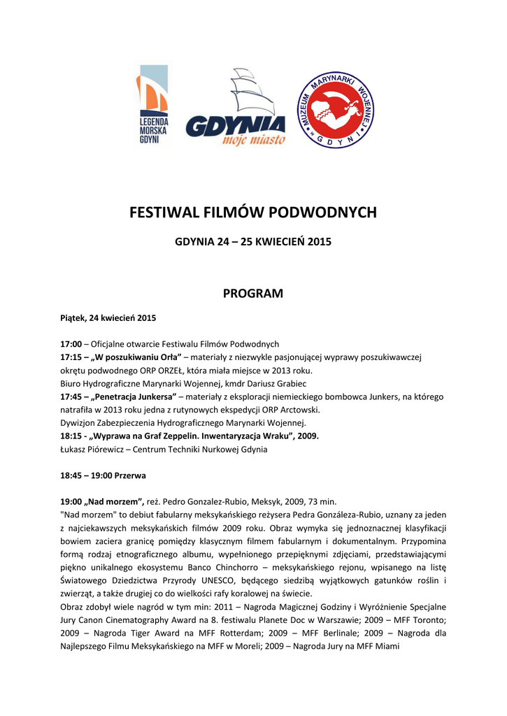 FESTIWAL FILMÓW PODWODNYCH GDYNIA 24 – 25 KWIECIEŃ 2015 PROGRAM Piątek, 24 kwiecień 2015 17:00 – Oficjalne otwarcie Festiwalu Filmów Podwodnych 17:15 – „W poszukiwaniu Orła” – materiały z niezwykle pasjonującej wyprawy poszukiwawczej okrętu podwodnego ORP ORZEŁ, która miała miejsce w 2013 roku. Biuro Hydrograficzne Marynarki Wojennej, kmdr Dariusz Grabiec 17:45 – „Penetracja Junkersa” – materiały z eksploracji niemieckiego bombowca Junkers, na którego natrafiła w 2013 roku jedna z rutynowych ekspedycji ORP Arctowski. Dywizjon Zabezpieczenia Hydrograficznego Marynarki Wojennej. 18:15 - „Wyprawa na Graf Zeppelin. Inwentaryzacja Wraku”, 2009. Łukasz Piórewicz – Centrum Techniki Nurkowej Gdynia 18:45 – 19:00 Przerwa 19:00 „Nad morzem”, reż. Pedro Gonzalez-Rubio, Meksyk, 2009, 73 min. "Nad morzem" to debiut fabularny meksykańskiego reżysera Pedra Gonzáleza-Rubio, uznany za jeden z najciekawszych meksykańskich filmów 2009 roku. Obraz wymyka się jednoznacznej klasyfikacji bowiem zaciera granicę pomiędzy klasycznym filmem fabularnym i dokumentalnym. Przypomina formą rodzaj etnograficznego albumu, wypełnionego przepięknymi zdjęciami, przedstawiającymi piękno unikalnego ekosystemu Banco Chinchorro – meksykańskiego rejonu, wpisanego na listę Światowego Dziedzictwa Przyrody UNESCO, będącego siedzibą wyjątkowych gatunków roślin i zwierząt, a także drugiej co do wielkości rafy koralowej na świecie. Obraz zdobył wiele nagród w tym min: 2011 – Nagroda Magicznej Godziny i Wyróżnienie Specjalne Jury Canon Cinematography Award na 8. festiwalu Planete Doc w Warszawie; 2009 – MFF Toronto; 2009 – Nagroda Tiger Award na MFF Rotterdam; 2009 – MFF Berlinale; 2009 – Nagroda dla Najlepszego Filmu Meksykańskiego na MFF w Moreli; 2009 – Nagroda Jury na MFF Miami Sobota, 25 kwiecień 2015 11:00 „Podwodne tajemnice Czarnogóry” – szereg materiałów dotyczący nurkowania w Śródziemnomorskich wodach Czarnogóry, przyroda, wraki, jaskinie. Wojciech Zgoła – DiveAdventure 11:30 „Lofoty oczami nurka” - prelekcja opatrzona zdjęciami podróżniczymi z lądu i spod wody, w tym również film o wrakach Hadsel i Gudrun prosto z Lofotów. Wojciech Zgoła – DiveAdventure 12:00 „Oko w oko z foką szarą” – opowieść o fokach w ich naturalnym środowisku. Wojciech Zgoła – DiveAdventure 12:30 „Foki Bałtyku” – Michał Bała, Stacja Morska Instytutu Oceanografii Uniwersytetu Gdańskiego w Helu 13:00 „Morświn – bałtycki krewniak delfina” – prelekcja poświęcona delfinom z Bałtyku – Morświnom - przepięknym stworzeniom, które znalazły się na skraju wyginięcia. Szacuje się, iż pozostało ich już zaledwie około 400 sztuk. Dowiemy się więcej o biologii i środowisku naturalnym tego ssaka, oraz gdzie się wybrać aby móc je obserwować. Aleksandra Botur – Fundacja WWF Polska 13:30 „Ryf Mew – Rafa” - forma filmowego raportu z przebiegu eksperymentu rafowego w wodach Zatoki Puckiej. Pokazano posadowienie na piaszczystym dnie unikalnej konstrukcji sztucznej rafy, zmiany na niej zachodzące oraz ponad półroczną pracę podwodnych badaczy. Dr Jarosław Samsel 14:00 – 14:15 Przerwa 14:15 „W wodach wokół Europy” - Filmowa relacja z nurkowań grupy płetwonurków, którzy pasję poznawania podwodnego świata realizują nurkując w różnych miejscach u brzegów naszego kontynentu. Poczynając od norweskich wybrzeży Atlantyku, poprzez Cieśniny Duńskie i Bałtyk, okolice półwyspu Monte Argentario, który otaczają wody Morza Tyrreńskiego, aż po czarnomorskie skaliste brzegi w okolicach bułgarskiego miasta Sozopol. Dr Jarosław Samsel 14:45 „Egipt Morza Czerwonego” – 3 filmy przedstawiające przyrodę Morza Czerwonego, w tym między innymi niezwykle kolorowe i tętniące życiem rafy koralowe. Zdjęcia i montaż Monika Borek. Centrum Nurkowania i Turystyki Aktywnej TICADA, Suchy Dwór k. Gdyni 15:15 „The Wrecks of Malta - Tugboat Rozi & P29”, relacja z wypraw do śródziemnomorskich wraków Malty, które odbyły się w październiku 2014 roku. Centrum Nurkowe SubMarine Reda, Michał Czermiński. 15:30 „Wraki Bałtyku – Franken, Bremenhaven, Terra…” – relacja z podwodnych eksploracji niemieckich wraków z okresu II Wojny Światowej spoczywających na dnie Bałtyku. Wojciech Jechna – Bałtycka Baza Nurkowa LITORAL, Gdynia. 16:00 – 16:15 PRZERWA 16:15 „Wraki z okresu I i II wojny światowej - podwodne cmentarzyska” – spoczywające na dnach mórz wraki statków i okrętów to bardzo często miejsca spoczynku setek a niekiedy nawet tysięcy ludzi, są tzw. „mokre groby”, owiane legendami i tajemnicami. Przedstawimy kilka takich mogił zarówno z północnych wód Europy jak i Śródziemnomorza. Andrzej W. Święch 17:15 Handel niewolnikami i związane z tym statki - Atlantyk, wybrzeża Zachodniej Afryki i wybrzeża Nowego Świata. Andrzej W. Swięch 18:15 – 18:25 PRZERWA 18:25 „Sea Austin. Głębinowe nurkowanie… w wózku inwalidzkim” – niesamowita historia Sue Austin, niepełnosprawnej artystki, która udowadnia że niepełnosprawność to niekoniecznie wyrok. Prelekcja została nagrana podczas sesji TEDxWomen 2012. 18:35 „Deep Love”, reż. Jan P. Matuszyński, Polska, 2013, 84 min. Historia miłości nieznającej granic, pasji większej niż strach i determinacji, aby ponownie zacząć żyć. Pewny siebie, bardzo aktywny pięćdziesięciolatek, zapalony nurek z wybitnymi osiągnięciami, doznaje udaru, w wyniku którego jest sparaliżowany i nie może mówić. Dzięki rehabilitacji i pomocy partnerki zaczyna się poruszać i coraz sprawniej funkcjonować. Nadal jednak ma poważne problemy z porozumiewaniem się, a jedyną osobą, która rozumie jego mowę jest partnerka, która także staje się tłumaczem między nim a światem. Tym, co go nakręca i motywuje do dalszej walki jest wielkie marzenie - chciałby ponownie nurkowa