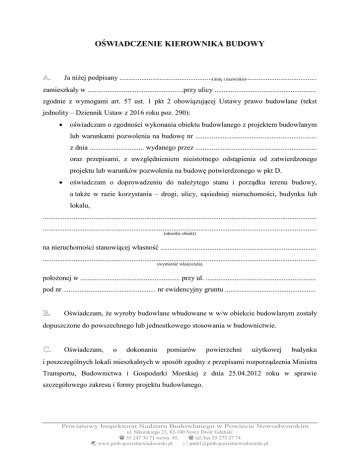 OŚWIADCZENIE KIEROWNIKA BUDOWY A. Ja niżej podpisany ...................................................(imię i nazwisko)....................................... zamieszkały w .....................................................przy ulicy ........................................................ zgodnie z wymogami art. 57 ust. 1 pkt 2 obowiązującej Ustawy prawo budowlane (tekst jednolity – Dziennik Ustaw z 2016 roku poz. 290): • oświadczam o zgodności wykonania obiektu budowlanego z projektem budowlanym lub warunkami pozwolenia na budowę nr ................................................................... z dnia .............................. wydanego przez ................................................................... oraz przepisami, z uwzględnieniem nieistotnego odstąpienia od zatwierdzonego projektu lub warunków pozwolenia na budowę potwierdzonego w pkt D. • oświadczam o doprowadzeniu do należytego stanu i porządku terenu budowy, a także w razie korzystania – drogi, ulicy, sąsiedniej nieruchomości, budynku lub lokalu, ....................................................................................................................................................... ....................................................................................................................................................... (określić obiekt) na nieruchomości stanowiącej własność ...................................................................................... ....................................................................................................................................................... (wymienić właściciela) położonej w ....................................................... przy ul. ............................................................. pod nr ................................................... nr ewidencyjny gruntu .................................................. B. Oświadczam, że wyroby budowlane wbudowane w w/w obiekcie budowlanym zostały dopuszczone do powszechnego lub jednostkowego stosowania w budownictwie. C. Oświadczam, o dokonaniu pomiarów powierzchni użytkowej budynku i poszczególnych lokali mieszkalnych w sposób zgodny z przepisami rozporządzenia Ministra Transportu, Budownictwa i Gospodarki Morskiej z dnia 25.04.2012 roku w sprawie szczegółowego zakresu i formy projektu budowlanego. Powiatowy Inspektorat Nadzoru Budowlanego w Powiecie Nowodworskim ul. Sikorskiego 23, 82-100 Nowy Dwór Gdański 55 247 36 71 wewn. 45, tel./fax 55 273 27 74 www.pinb-powiatnowodworski.pl [email protected] D. Wykonano zmiany nie odstępujące w sposób istotny od zatwierdzonego projektu lub warunków pozwolenia na budowę polegające na ........................................................................ (określić ilość i zakres zmian) ....................................................................................................................................................... ....................................................................................................................................................... ....................................................................................................................................................... ....................................................................................................................................................... ....................................................................................................................................................... ....................................................................................................................................................... ....................................................................................................................................................... ....................................................................................................................................................... ....................................................................................................................................................... ....................................................................................................................................................... ....................................................................................................................................................... ....................................................................................................................................................... ....................................................................................................................................................... ....................................................................................................................................................... ....................................................................................................................................................... ....................................................................................................................................................... które przedstawiono na kopiach rysunków wchodzących w skład zatwierdzonego projektu budowlanego, a także w razie potrzeby w uzupełniającym opisie. W takim przypadku niniejsze oświadczenie zostaje potwierdzone przez projektanta i inspektora nadzoru inwestorskiego, jeżeli został ustanowiony. ................................................................... ................................................................... (data i podpis projektanta) (data i podpis inspektora nadzoru inwestorskiego) ................................................................... (data i podpis kierownika budowy) Powiatowy Inspektorat Nadzoru Budowlanego w Powiecie Nowodworskim ul. Sikorsk