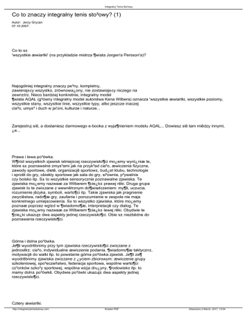 Integralny Tenis Sto³owy Co to znaczy integralny tenis sto³owy? (1) Autor: Jerzy Grycan 07.10.2007. Co to s± 'wszystkie æwiartki' (na przykladzie mistrza ¶wiata Jorgen'a Persson'a)? Najogólniej integralny znaczy pe³ny, kompletny, zawieraj±cy wszystko, zrównowa¿ony, nie zostawiaj±cy niczego na zewn±trz. Nieco bardziej konkretnie, integralny model ¶wiata AQAL (g³ówny integralny model autorstwa Kena Wilbera) oznacza 'wszystkie æwiartki, wszystkie poziomy, wszystkie stany, wszystkie linie, wszystkie typy, albo jeszcze inaczej cia³o, umys³ i duch w ja¼ni, kulturze i naturze... Zarejestruj siê, a dostaniesz darmowego e-booka z wyja¶nieniem modelu AQAL... Dowiesz siê tam miêdzy innymi, ¿e... Prawa i lewa po³ówka. W¶ród wszystkich zjawisk istniej±cej rzeczywisto¶ci mo¿emy wyró¿niæ te, które s± poznawalne zmys³ami jak na przyk³ad cia³o, æwiczenia fizyczne, zawody sportowe, dietê, organizacjê sportow±, bud¿et klubu, technologie i sprzêt do gry, obiekty sportowe jak sala do gry, si³ownia, p³ywalnia czy boisko itp. S± to wszystkie sensorycznie poznawalne zjawiska. Te zjawiska mo¿emy nazwaæ za Wilberem ¶cie¿k± prawej rêki. Druga grupa zjawisk to te zwi±zane z wewnêtrznym do¶wiadczeniem: my¶li, uczucia, rozumienie jêzyka, symboli, warto¶ci itp. Takie zjawiska jak pragnienie zwyciêstwa, rado¶æ gry, zaufanie i porozumienie w zespole nie maja konkretnego umiejscowienia. S± to wszystko zjawiska, które mo¿emy poznaæ poprzez wgl±d w ¶wiadomo¶æ, interpretacjê czy dialog. Te zjawiska mo¿emy nazwaæ za Wilberem ¶cie¿k± lewej rêki. Obydwie te ¶cie¿ki ukazuj± dwa aspekty jednej rzeczywisto¶ci. Obie s± niezbêdne do poznawania rzeczywisto¶ci. Górna i dolna po³ówka. Je¶li wyodrêbnimy przy tym zjawiska rzeczywisto¶ci zwi±zane z jednostk±: cia³o, indywidualne æwiczenie podania, ¶wiadomo¶æ taktyczn±, motywacjê do walki itp. to powstanie górna po³ówka zjawisk. Je¶li za¶ wyodrêbnimy zjawiska zwi±zane z ¿yciem zbiorowym: æwiczenie grupy szkoleniowej, spo³eczeñstwo, federacja sportowa, wspólne warto¶ci cz³onków szko³y sportowej, wspólna wizja dru¿yny, ¶rodowisko itp. to mamy doln± po³ówkê. Obydwie po³ówki ukazuj± dwa aspekty jednej rzeczywisto¶ci. Cztery æwiartki. http://integralnytenisstolowy.com Kreator PDF Utworzono 2 March, 2017, 13:54 Integralny Tenis Sto³owy Po³±czenie górnej i dolnej, oraz lewej i prawej po³ówek da nam na diagramie 4 æwiartki: prawa-górna, lewa-górna, prawa-dolna oraz lewa-dolna. Ka¿da z tych æwiartek reprezentuje inny aspekt rzeczywisto¶ci. PG, obiektywna, dotyczy organizmu i zachowania. LG, subiektywna, dotyczy intencjonalno¶ci (¶wiadomo¶ci). PD, interobiektywna, dotyczy spo³eczeñstwa, ekosystemu itp. LD, intersubiektywna, dotyczy kultury. Prawda, piêkno, dobro. Ka¿da æwiartka reprezentuje inny jêzyk. Jêzyk prawejgórnej po³ówki to jêzyk TO (TEN lub TA), tak zwanego ¶wiata obiektywnego. Na przyk³ad to cia³o, ta rêka, to zachowanie, to uderzenie, to æwiczenie, ta dieta. Jêzyk prawej dolnej æwiartki, to jêzyk TE. Na przyk³ad te zebrania, te ¶rodki finansowe, te warunki. Obie prawe æwiartki stosuj± jêzyk tradycyjnie rozumianej nauki, wyra¿aj±cy PRAWDê. Jêzyk lewej górnej æwiartki to jêzyk JA, tak zwanego ¶wiata subiektywnego, sztuki i PIêKNA. Jêzyk lewej-dolnej æwiartki to jêzyk MY, ¶wiata moralno¶ci, wyra¿aj±cy DOBRO... itd. Jak sie to ma do tenisa stolowego? Wszystkie æwiartki w szkoleniu sportowym. Ka¿da æwiartka odpowiada ró¿norodnym aspektom szkolenia w tenisie sto³owym... TRENING UMYS£U; TRENING CIA£A; ¦RODOWISKO KULTURALNE; ¦RODOWISKO SZKOLENIOWE. We?my teraz dla przyk³adu wywiad z Jorgenem Personem (jeden z wielu wywiadów który przeprowadza³em w ramach projektu 'modelowanie umys³ów mistrzów tenisa stolowego' w 1999 roku, studiuj±c NLP w Melbourne), pos³uchajmy go i pouk³adajmy jego ró¿ne wypowiedzi do poszczególnych æwiartek. Oto co otrzymamy: Lewa górna æwiartka (My¶li, uczucia J.Persona) -mia³em cel gdy by³em ma³y; -mia³em marzenie aby zostaæ mistrzem ¶wiata; http://integralnytenisstolowy.com Kreator PDF Utworzono 2 March, 2017, 13:54 Integralny Tenis Sto³owy -by³em bardzo uparty w d±¿eniu do swoich celów; -ca³y czas chcia³em graæ lepiej; -nauczy³em siê wcze¶nie podchodziæ do gry z celem wygrania, a nie 'aby nie przegrac', i tak by³em wcze¶nie przygotowany do gry w 'wielkich fina³ach'; -nauczylem siê graæ spokojnie, zw³aszcza gdy przegrywa³em, nauczy³em siê jak zachowaæ równowagê, w trudnych sytuacjach; -w najlepszych momentach swojej kariery (1989-92) mia³em poczucie, ¿e jestem 'nie do pokonania'; -mam wci±¿ poczucie, ¿e moge wygrywaæ du¿e turnieje, gdybym straci³ je, to zakoñczy³bym zawodowe granie w tenisa sto³owego; -gram w tenisa sto³owego, bo wiem, ¿e wci±¿ mogê byæ 'numer jeden' na ¶wiecie, i wiem, ¿e moge jeszcze znacznie udoskonaliæ swoja grê, -za ka¿dym razem gdy przychodzê na trening, to wiem, ¿e mogê udoskonaliæ wiele rzeczy, mogê stale poprawiæ to czy http://integralnytenisstolowy.com Kreator PDF Utworzono 2 March, 2017, 13:54 Integralny Tenis Sto³owy tamto w grze; -i to sta³e doskonalenie daje mi rado¶æ; i mam ochote dalej kontynuowaæ swoj± karierê zaodowego gracza; - robiê te¿ specjalny program treningu mentalnego, ktory pomaga mi siê lepiej skoncentrowaæ na grze; -przed wa¿n± gr± staram siê byæ zrelaksowany, staram siê przyj±æ pozytywn± postawê, aby 'i¶æ po zwyciêstwo' aby 'wzi±æ szansê', pamietaæ o swoich silnych stronach, wiedzieæ ¿e 'da³e¶ z siebie wszystko', ¿e 'skoro jeste¶ w finale, to znaczy ¿e pokona³e¶ wielu znakomitych zawodników', wyobra¿am sobie swoja grê; Prawa górna æwiartka (Cia³o, zachowanie J.Persona) -chyba siê urodzi³em siê z instynktem wygrywania; -mia³em instynkt wygrywania; -od najm³odszych lat uczy³em siê wygrywania w grze; -zacz±³em wygry