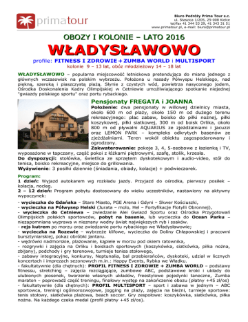 Biuro Podróży Prima Tour s.c. ul. Staszica 1/205, 25-008 Kielce tel/fax 41 344 53 29, 41 343 31 51 www.primatour.pl, e-mail: [email protected] OBOZY I KOLONIE – LATO 2016 WŁADYSŁAWOWO profile: FITNESS I ZDROWIE + ZUMBA WORLD i MULTISPORT kolonie 9 – 13 lat, obóz młodzieżowy 14 – 18 lat WŁADYSŁAWOWO – popularna miejscowość letniskowa pretendująca do miana jednego z głównych wczasowisk na polskim wybrzeżu. Położona u nasady Półwyspu Helskiego, nad piękną, szeroką i piaszczystą plażą. Słynie z czystych wód, powietrza nasyconego jodem, Ośrodka Doskonalenia Kadry Olimpijskiej w Cetniewie umożliwiającego spotkanie niejednej "gwiazdy polskiego sportu" oraz portu rybackiego. Pensjonaty FREGATA i JOANNA Położenie: dwa pensjonaty w willowej dzielnicy miasta, około 600 m od plaży, około 150 m od dużego terenu rekreacyjnego: plac zabaw, boisko do piłki nożnej, piłki koszykowej, piłki siatkowej, 300 m od boisk Orlika, około 800 m od pływalni AQUARIUS ze zjeżdżalniami i jacuzzi oraz LEMON PARK – kompleks odkrytych basenów ze zjeżdżalniami. Teren wokół obiektu zagospodarowany i ogrodzony. Zakwaterowanie: pokoje 3, 4, 5-osobowe z łazienką i TV, wyposażone w tapczany, część pokoi z łóżkami piętrowymi, szafę, stolik, krzesła. Do dyspozycji: stołówka, świetlica ze sprzętem dyskotekowym i audio-video, stół do tenisa, boisko rekreacyjne, miejsce do grillowania. Wyżywienie: 3 posiłki dziennie (śniadania, obiady, kolacje) + podwieczorek. Program: 1 dzień: Wyjazd autokarem wg rozkładu jazdy. Przyjazd do ośrodka, pierwszy posiłek – kolacja, nocleg. 2 – 12 dzień: Program pobytu dostosowany do wieku uczestników, nastawiony na aktywny wypoczynek: - wycieczka do Gdańska – Stare Miasto, PGE Arena i Gdyni – Skwer Kościuszki, - wycieczka na Półwysep Helski (Jurata – molo, Hel – Fortyfikacje Flotylli Obronnej), - wycieczka do Cetniewa – zwiedzanie Alei Gwiazd Sportu oraz Ośrodka Przygotowań Olimpijskich polskich sportowców, pobyt na basenie, lub wycieczka do Ocean Parku – niezapomniana wyprawa w nieznany wodny świat największych ryb i ssaków. - rejs kutrem po morzu oraz zwiedzanie portu rybackiego we Władysławowie; - wycieczka na Rozewie – wybrzeże klifowe, wycieczka do Doliny Chłapowskiej i pracowni bursztyniarskiej, pokaz obróbki jantaru. - wędrówki nadmorskie, plażowanie, kąpiele w morzu pod okiem ratownika, - rozgrywki i zajęcia na Orliku i boiskach sportowych (koszykówka, siatkówka, piłka nożna, zbijany), podchody i gry terenowe, turnieje tenisa stołowego, - zabawy integracyjne, konkursy, Neptunalia, bal przebierańców, dyskoteki, udział w licznych koncertach i imprezach sezonowych m.in.: Happy Events, Rybka we Władku. - fakultatywnie (dla chętnych): PROFIL FITNESS I ZDROWIE + ZUMBA WORLD – podstawy fitnessu, stretching – zajęcia rozciągające, zumbowe ABC, podstawowe kroki i układy do ulubionych piosenek, tworzenie własnych układów, freestylowe pojedynki taneczne, Zumba maraton – poprowadź część treningu, finałowy występ na zakończenie obozu (płatny +45 zł/os) - fakultatywnie (dla chętnych): PROFIL MULTISPORT – sport i zabawa w jednym – ABC sportowca, treningi ogólnorozwojowe, jogging na plaży, zajęcia na bieżni, turnieje sportowe: tenis stołowy, siatkówka plażowa, beach soccer. Gry zespołowe: koszykówka, siatkówka, piłka nożna. Na każdego czeka medal (profil płatny +45 zł/os). Biuro Podróży Prima Tour s.c. ul. Staszica 1/205, 25-008 Kielce tel/fax 41 344 53 29, 41 343 31 51 www.primatour.pl, e-mail: [email protected] 13 dzień: Ostatni posiłek – śniadanie, pobranie suchego prowiantu na drogę. Wyjazd z ośrodka około godz. 6.00. Powrót do poszczególnych miast wg rozkładu jazdy. termin cena 27.06 – 09.07.2016 1299 zł 10.07 – 22.07.2016 1399 zł 23.07 – 04.08.2016 1399 zł 05.08 – 17.08.2016 1319 zł 18.08 – 30.08.2016 1249 zł dodatkowo płatne (dla chętnych): Ubezpieczenie od kosztów rezygnacji +50 zł/os. Profil Fitness i zdrowie + Zumba World +45 zł/os. Profil Multisport +45 zł/os. Cena zawiera: - transport autokarem; - 12 noclegów; - wyżywienie 3 posiłki dziennie + podwieczorek, - suchy prowiant na drogę powrotną; - opiekę kadry pedagogicznej i ratownika wodnego; - ubezpieczenie NNW; - realizację programu; Dodatkowo płatne (dla chętnych): - profile; - ubezpieczenie od kosztów rezygnacji; - połączenia z różnych miast – szczegóły i rozkład jazdy na: www.primatour.pl; Uwagi: Proponujemy zabrać ze sobą około 100 zł kieszonkowego na własne potrzeby (pieniądze można zdeponować u wychowawców). Prosimy o zabranie: karty kolonijno-obozowej z numerem PESEL i legitymacji szkolnej, odpowiedniej odzieży i obuwia, kostiumu kąpielowego, klapek, nakrycia głowy, kremu z filtrem do opalania i przyborów higienicznych. Bagaż prosimy zapakować do miękkich toreb (wykluczone twarde walizki). Ilość bagażu ograniczona! (bagaż podręczny i jedna torba, które dziecko będzie w stanie same przenieść).
