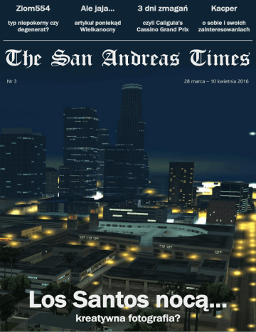 Ziom554 Ale jaja... 3 dni zmagań Kacper typ niepokorny czy degenerat? artykuł poniekąd Wielkanocny czyli Caligula's Cassino Grand Prix o sobie i swoich zainteresowaniach The San Andreas Times Nr 3 28 marca – 10 kwietnia 2016 Los Santos nocą... kreatywna fotografia? Trzy słowa wprowadzenia Witamy was ciepło, w nieco świątecznym wielkanocnym nastroju. W samym środku obchodów świąt Zmartwychwstania Pańskiego przychodzi nam opublikować trzeci numer naszej gazety – w związku z tym przygotowaliśmy szczególny artykuł o zabarwieniu nieco świątecznym. Ponadto w cyklu „Zakały FSa” przedstawimy wam sylwetkę Zioma552; w serii rozmów The San Andreas Times przed naszą reporterką stanął Kacper. Nie zabrakło oczywiście relacji z minionych zawodów i konkursów, w tym – Caligulla's Cassino LVBC Stadium Grand Prix oraz FullServer Creative Photo. Oprócz artykułów przygotowanych przez redakcję, w numerze trzecim znalazł się także artykuł nadesłany, autorstwa Kohta Hirano. Jako że po raz pierwszy publikujemy artykuł nadesłany pozostawiliśmy go w formie niezmienionej. Czy jest dobry? Oceńcie sami. Dołącz do twórców The San Andreas Times Lubisz opisywać swoje otoczenie? Relacjonować ciekawe wydarzenia? Chcesz zareklamować jakąś imprezę? Zapraszamy do współredagowania The San Andreas Times. Nasza redakcja czeka na wszystkie chętne osoby, które chciałyby dać coś od siebie. Chętne osoby zapraszamy na fullserver.eu – artykuły prosimy przesyłać na konto The San Andreas Times. Redakcja zastrzega sobie jednak prawo do oceny treści pod względem merytorycznym. Rozwiązanie KRZYŻÓWKI Z NAGRODĄ z numeru 2! Nasza redakcja otrzymała w sumie 4 odpowiedzi (z czego 3 były poprawne). Tym razem obyło się bez losowania i wszystkie osoby, które prawidłowo rozwiązały krzyżówkę otrzymują od nas po 100GP (poprosimy RCON by wkrótce przypisali nagrody do kont). Nagrody wędrują do: Bumcia, PinkFloyd oraz MrMaxi. Gratulujemy! FullServer Creative Photo Oskar odpowiada na pytania dotyczące kontrowersyjnego wyboru Konkurs FullServer Creative Photo wywołał niemałą dyskusję w środowisku serwerowym, czy mógłbyś nam przedstawić jaki jest jego zasadniczy cel? Odkąd pamiętam uwielbiałem oglądać fotograficzne prace konkursowe. Od czasu do czasu lubię brać udział w konkursach a w paru już byłem jury. Jeszcze nigdy nie spotkałem się z konkursem w grze na ciekawa fotografię. Można przez konkurs wynagrodzić i wyłonić kreatywnych graczy. W prywatnym życiu jestem zawodowym fotografem i chciałem dać innym coś od siebie - organizując konkurs jak i wynagradzając ich za udział. Jakimi priorytetami kierowali się jurorzy konkursu przy wyborze fotografii? Nad konkursem czuwało jury złożone z siedmiu osób. Postanowiłem rozrzutnie wybrać jury w celu różnych ocen prac. Po zakończeniu konkursu jury otrzymało link do ankiety w której oceniali każde pojedyncze zdjęcie w skali od 1 do 10. Czym kierowało się jury? Trudno odpowiedzieć. Mogę powiedzieć czym kierowałem się ja. Przede wszystkim na pierwszym miejscu - pomysł, zdjęcie bez pomysłu mimo świetnej realizacji może być po prostu nudne. Podsumowując - ile osób, tyle opinii. Różnica punktów była minimalna. Skoro możesz pisać tylko o swojej opinii - czy uważasz że zwycięska fotografia jest w rzeczywistości kreatywna? Opinie, które pojawiły się po publikacji wyników nie były zbyt pozytywne - uważasz tę krytykę za słuszną? W jakimś stopniu kreatywna jest na pewno, lecz sądzę iż bardziej przeważyła tutaj jakość wykonania pracy, która można ocenić celująco. Moim faworytem była fotografia autobusu między budynkami - nie realne teoretycznie ale bardzo ciekawe. Druga taka fotografia, to praca Vipera. Lecący w powietrzu motocykl "ustrzelony" podczas pięknego zachodu słońca. Dużo zdjęć mi się podobało i szczerze mówiąc zaskoczyła mnie frekwencja uczestników. Jurorzy mieli ciężki orzech do zgryzienia Obserwatorzy zarzucają jurorom wybór najładniejszej a nie najbardziej kreatywnej fotografii - nie uważasz że pośrednią przyczyną takie stanu rzeczy jest brak przedstawienia jurorom opisanych przeze mnie powyżej "priorytetów" jakimi powinni się kierować przy wyborze? Z twojej wypowiedzi wywnioskowałem że dano im całkowicie wolną rękę w wyborze nie nakreślając dokładniejszych zasad konkursu. Owszem, jury otrzymało wolną rękę w wyborze zwycięskiej pracy w marcowej edycji. W kolejnych edycjach nakreślę bardziej jury czym mają się kierować. Też warto spojrzeć, że to pierwsza edycja :) Pomyślałem także nad rozwiązaniem przesyłania prac przez formularz lecz w tej sytuacji mogłyby się zdarzać kradzieże fotografii. Lecz jeszcze przemyśle tą formę :) W tym systemie jury nie miałoby pojęcia kto jest autorem prac. Kiedy możemy spodziewać się startu kolejnej edycji? Start przewiduje na pierwszy tydzień kwietnia. Wzrosną nagrody więc mam nadzieję, że zainteresowanych będzie jeszcze więcej! Reklama Reklama Reklama Reklama Reklama Reklama Reklama Reklama Reklama Reklama Miejsce na twoją reklamę The San Andreas Times ©opy dostaniecie jak to skopiujecie okładka: k250 Redakcja: Pilgrim Street 12 , Las Venturas, San Andreas Sprzedaż egzemplarzy aktualnych i archiwalnych po cenie innej niż cena detaliczna ustalona przez wydawcę jest zabroniona i grozi odpowiedzialnością karną. Ewentualne pytania prosimy kierować na PM The San Andreas Times na fullserver.eu. The San Andreas Times 1 Kiedy rozpocząłeś przygodę z GTA oraz SAMP? Czy grasz tylko w serię San Andreas? Przygodę z GTA zaczynałem wręcz od najmłodszych lat. Gdy miałem 7 lat przyszedł do mnie kolega i oznajmił, że ma komputer i parę gier. Wśród nich były pierwsze 3 części GTA, w tym GTA III, które nam się bardzo spodobało. Nie minął miesiąc, a dostał on GTA Vice City. Po paru miesiącach spędzony