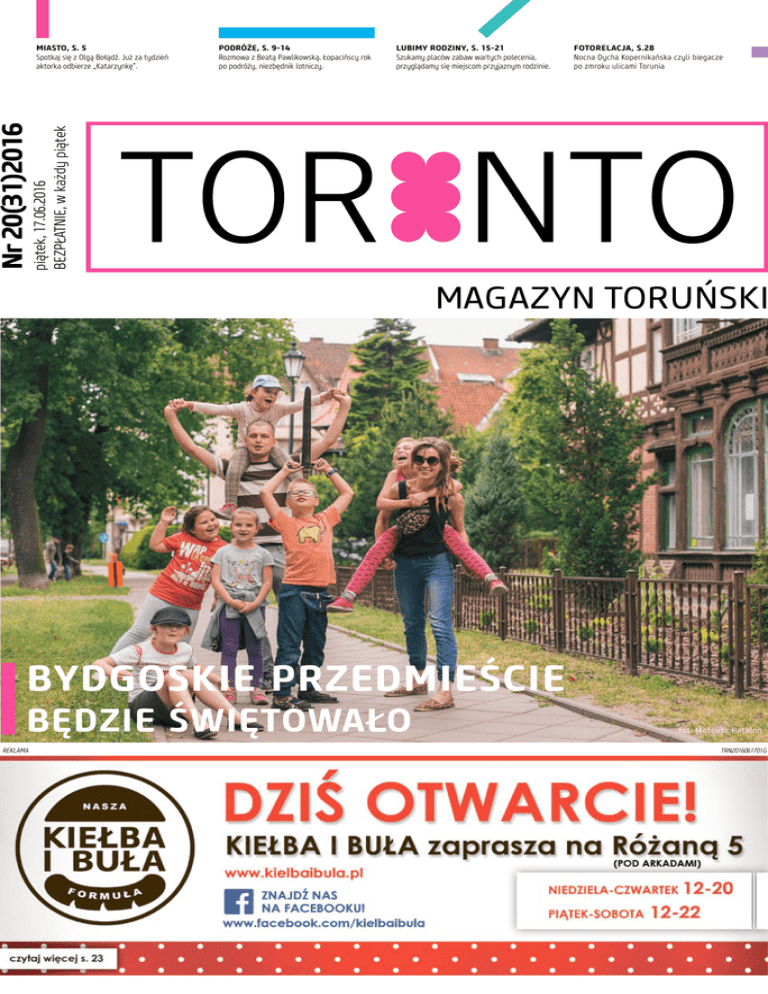 PODRÓŻE, s. 9-14 Rozmowa z Beatą Pawlikowską, Łopacińscy rok po podróży, niezbędnik lotniczy. Lubimy rodziny, s. 15-21 Szukamy placów zabaw wartych polecenia, przyglądamy się miejscom przyjaznym rodzinie. Fotorelacja, s.28 Nocna Dycha Kopernikańska czyli biegacze po zmroku ulicami Torunia piątek, 17.06.2016 BEZPŁATNIE, w każdy piątek Nr 20(31)2016 Miasto, s. 5 Spotkaj się z Olgą Bołądź. Już za tydzień aktorka odbierze „Katarzynkę”. Bydgoskie Przedmieście będzie świętowało REKLAMA fot. Mateusz Patalon TRN2016061701G LUDZIE TORONTO TORONTO magazyn toruński www.toronto-magazyn.pl [email protected] Adres: ul. Grudziądzka 79/6 tel. 789 191 070 red.nacz. Żaneta Lipińska-Patalon wydanie bezpłatne wydawca: Interactive-Press Żaneta Lipińska-Patalon MARCIN TREICHEL Reklama: [email protected] tel.789 223 013, tel.789 216 119, tel.789 223 339 Opracowanie graficzne: Anna Paula Szmeichel mruff design Rysowaniem i projektowaniem graficznym zajmuje się od wielu lat. Doświadczenie zdobył, pracując dla dzienników regionalnych oraz współpracując z agencjami reklamowymi przy wielu różnorodnych projektach. Nasze Bydgoskie Kila lat temu grupa przyjaciół związanych z Wydziałem Sztuki Pięknych w Toruniu rozpoczęła inicjatywę w obronie Bydgoskiego Przedmieścia. Właściwie wszyscy byliśmy napływowi, ale bardzo szybko dostrzegliśmy potencjał tego miejsca. Miejsca, które zauroczyło nas od pierwszego wejrzenia. Bo Bydgoskie jest specyficzne: albo się je kocha, albo nienawidzi. My stwierdziliśmy, że to nasze miejsce do życia. I mimo Sukiennice! Jednak czytacie moje felietony. Powiedziałbym to z radością, gdyby nie fakt, że akurat czytanie ostatniego przyniosło wielu ludziom sporo smutku. Pisałem tydzień temu o budowie Toruńskich Sukiennic na terenach przy targowisku na Chełmińskiej, znanym jako „Chełmionka”. Gdy dowiedziałem się, że ten projekt wrócił na obrady rady miasta, byłem nieco przerażony, bo z mojej wiedzy wynikało, że nowy obiekt pożre ukochane stra- Druk: Agora SA Redakcja nie ponosi odpowiedzialności za treść zamieszczonych reklam że minęło sporo czasu, wciąż tu mieszkamy. A wiele się zmieniło. Co? Przede wszystkim o Bydgoskim Przedmieściu zaczęło się mówić. Stowarzyszenie „Bydgoskie Przedmieście” zwróciło uwagę na problem dzielnicy i pokazało jej potencjał. Nagle zaczął się „boom” mieszkaniowy na Bydgoskim. Zaczęto dostrzegać atuty mieszkania tutaj, bo może parę osób wybrało się na wycieczkę na nieznane bliżej przedmieście i zobaczyło, jakie jest naprawdę. Że nie jest wcale niebezpieczne ani zamieszkałe przez podejrzanych typków. Ruch na rynku mieszkaniowym nie tylko sprawił, że kamienice zaczęły pięknieć, zyskiwały nowych mieszkańców i fundusze na remonty, ale także pojawiało się coraz więcej deweloperskich inwestycji. Każdy medal ma dwie strony. Impulsem do naszego działania sprzed laty była obrona budynków szkieletowych przy malowniczej Stromej. Dla jednych rudery, dla innych piękno wpisane w to miejsce. Przez kolejne lata przyglądaliśmy się wielu pożarom szkieletówek i kamienic. Prawo dżungli. Silniejszy wygrywa. Ale zmieniło się postrzeganie takich sytuacji, zaczęto rozumieć że każde pusty kwartał to dziura w spuściźnie tego miejsca. Zaczęto rozumieć, że nic tego nie wróci. Że Bydgoskie nie będzie już takie samo. I nie jest. Wkrótce zaczęło pojawiać się tu coraz więcej organizacji pozarządowych. Nowe projekty, nowe pomysły. Na rewitalizację, na zaangażowanie lokalnej społeczności, na szczęście… dla tej dzielnicy. I oby jak najdłużej pozostała taką, jaką ją pokochałam. A Państwa zapraszam już dziś 17 czerwca na debatę o przyszłości Bydgoskiego oraz dzień później na Święto Bydgoskiego Przedmieścia. Warto tu wpaść. Zachęcam. gany z warzywami. Na felieton zareagowali szybko kupcy z „Chełmionki”, którzy od ponad 6 lat starają się zbudować owe Sukiennice. Dzięki nim dowiedziałem się, że nie mam czego się bać – budowla nie ma zajmować terenu targowiskowego zieleniaka. Zobaczyłem też po raz pierwszy kupiecki projekt Sukiennic i przyznam, że mi się spodobał. Ciekawe połączenie spokojnego, nowoczesnego designu z odwołaniami do toruńskiego gotyku. Obiekt, który na pewno nie szpeciłby Chełmińskiego Przedmieścia. Co ważne, nie ma mowy o straganach z PCV i blachy falistej, ale o porządnych sklepikach. Po tej rozmowie byłem zupełnie uspokojony. No prawie, bo dowiedziałem się jeszcze czegoś. Niestety projekt wciąż tkwi w odmętach procedur. Mimo naprawdę pokaźnej teczki ekspertyz, wycen, wykresów i koncepcji (widziałem!), decy- zja o zgodzie na budowę nie zapadła. Zjawiskowa Moriah Moriah Woods – amerykańska wokalistka, instrumentalistka, autorka tekstów i kompozytorka. Swoją twórczością nawiązująca do najlepszych tradycji amerykańskiego folku, ale wykonywanego z wyraźnym indywidualnym piętnem. Z dużym wyczuciem łączy korzenne brzmienia z nowymi trendami. Sama artystka muzykę, którą gra, określa jako „folk noir, czyli coś starego, coś mrocznego, coś żarliwego i pełnego pasji”. Tyle tytułem krótkiego wstępu. Moja osobista refleksja wykracza daŻaneta Lipińska-Patalon leko poza tych kilka zdań. MoToronto riach Woods to indywidualność Niedługo rozstrzygnąć ma się konkurs na koncepcję zabudowy architektonicznej. Może to nada bieg sprawom. Cieszę się też, że trzymałem się w tej sprawie swoich zasad. Zawsze staram się bowiem rozmawiać z ludźmi, reagującymi na moje teksty. Z tymi wściekłymi, urażonymi i zasmuconymi szczególnie. Felietoniście nie wolno uciekać od takich spotkań, bo byłoby to tchórzostwo i brak odpowiedzialności za swoje słowa. Dzięki tej zasadzie, porozmawiałem z bardzo fajnymi, zaangażowanymi ludźmi, którzy mają dobrą dla miasta ideę. Dlatego bez chwili wątpienia, mówi