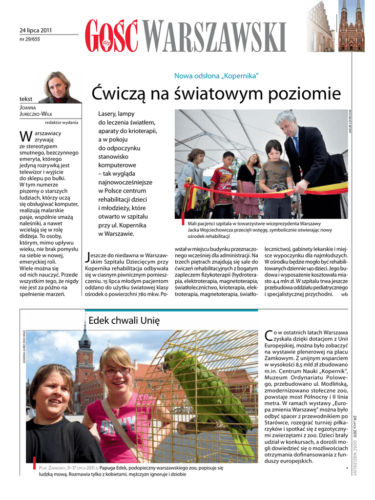 24 lipca 2011 nr 29/655 Nowa odsłona „Kopernika” Lasery, lampy do leczenia światłem, aparaty do krioterapii, a w pokoju do odpoczynku stanowisko komputerowe – tak wygląda najnowocześniejsze w Polsce centrum rehabilitacji dzieci i młodzieży, które otwarto w szpitalu przy ul. Kopernika w Warszawie. redaktor wydania W arszawiacy zrywają ze stereotypem smutnego, bezczynnego emeryta, którego jedyną rozrywką jest telewizor i wyjście do sklepu po bułki. W tym numerze piszemy o starszych ludziach, którzy uczą się obsługiwać komputer, realizują malarskie pasje, wspólnie smażą naleśniki, a nawet wcielają się w rolę didżeja. To osoby, którym, mimo upływu wieku, nie brak pomysłu na siebie w nowej, emeryckiej roli. Wiele można się od nich nauczyć. Przede wszystkim tego, że nigdy nie jest za późno na spełnienie marzeń. J eszcze do niedawna w Warszawskim Szpitalu Dziecięcym przy Kopernika rehabilitacja odbywała się w ciasnym piwnicznym pomieszczeniu. 15 lipca młodym pacjentom oddano do użytku światowej klasy ośrodek o powierzchni 780 mkw. Po- Jakub Szymczuk Ćwiczą na światowym poziomie tekst Joanna Jureczko-Wilk Mali pacjenci szpitala w towarzystwie wiceprezydenta Warszawy Jacka Wojciechowicza przecięli wstęgę, symbolicznie otwierając nowy ośrodek rehabilitacji wstał w miejscu budynku przeznaczonego wcześniej dla administracji. Na trzech piętrach znajdują się sale do ćwiczeń rehabilitacyjnych z bogatym zapleczem fizykoterapii (hydroterapia, elektroterapia, magnetoterapia, światłolecznictwo, krioterapia, elektroterapia, magnetoterapia, światło- Joanna Jureczko-Wilk Edek chwali Unię C o w ostatnich latach Warszawa zyskała dzięki dotacjom z Unii Europejskiej, można było zobaczyć na wystawie plenerowej na placu Zamkowym. Z unijnym wsparciem w wysokości 8,5 mld zł zbudowano m.in. Centrum Nauki „Kopernik”, Muzeum Ordynariatu Polowego, przebudowano ul. Modlińską, zmodernizowano stołeczne zoo, powstaje most Północny i II linia metra. W ramach wystawy „Europa zmienia Warszawę” można było odbyć spacer z przewodnikiem po Starówce, rozegrać turniej piłkarzyków i spotkać się z egzotycznymi zwierzętami z zoo. Dzieci brały udział w konkursach, a dorośli mogli dowiedzieć się o możliwościach otrzymania dofinansowania z funduszy europejskich. • 24 lipca 2011 Gość Niedzielny Plac Zamkowy, 9–17 lipca 2011 r. Papuga Edek, podopieczny warszawskiego zoo, popisuje się ludzką mową. Rozmawia tylko z kobietami, mężczyzn ignoruje i dziobie lecznictwo), gabinety lekarskie i miejsce wypoczynku dla najmłodszych. W ośrodku będzie mogło być rehabilitowanych dziennie 140 dzieci. Jego budowa i wyposażenie kosztowała miasto 4,4 mln zł. W szpitalu trwa jeszcze przebudowa oddziału pediatrycznego i specjalistycznej przychodni. wb gość warszawski gość warszawski Znowu pierwsze w Warszawie Anna Dziemska Świąt ynia O patrzności B ożej . Za wstawiennictwem bł. Jana Pawła II, w obecności jego relikwii co wtorek o godz. 18 w dolnym kościele Świątyni Opatrzności Bożej w Wilanowie, w Panteonie Wielkich Polaków odprawiane są Msze św. wieczyste w intencjach przekazanych przez darczyńców. Każdy, kto finansowo wesprze wznoszenie świątyni, otrzyma cegiełkę i dołączy do Wspólnoty Darczyńców w stolicy. Katolickie rozgłośnie zajmują jednak miejsca w drugiej dziesiątce najczęściej słuchanych. Warszawiacy najczęściej włączają Radio Zet oraz Program Trzeci i Jedynkę Polskiego Radia. Według badań Radia Track, Radia Maryja słucha 2,14 proc. odbiorców. Radio Warszawa na 106,2 FM uzyskało słuchalność na poziomie 1,06 proc. Trzecie jest Radio PLUS Warszawa z 0,43 proc. słuchaczy. gr Ile waży sztabka złota? Będzie można przekonać się w nowym muzeum szef NBP Sławomir Skrzypek, zmarły tragicznie w katastrofie smoleńskiej. jjw Niepokalanów. 18 lipca w bazylice niepokalanowskiej odbył się pogrzeb brata Jeremiasza – jednego uczniów św. o. Maksymiliana Kolbego. Mszę św. odprawił abp Tadeusz Pikus. Furtę klasztorną ojców franciszkanów br. Jeremiasz przekroczył pod koniec 1936 r. Był jednym z zakonników – świadków życia św. Maksymiliana. 40 lat pracował na stanowisku archiwisty w Archiwum Niepokalanowa, a całe 5 lat pod wodzą samego o. Kolbego. Swoje pierwsze spotkanie z wielkim świętym tak wspominał „(...) Poprzez swój pełen ojcowskiej dobroci czarujący uśmiech (...) wzbudził w moim sercu szczególne uczucie miłości względem Jego Osoby, które pozostało do końca mojego życia”. Brat Jere- 31.Warszawska Akademicka Pielgrzymka Metropolitalna „Pełna łaski”, 5–14 sierpnia. Jej trasa wynosi ok. 290 km i wymaga przejścia każdego dnia ok. 35 km w 5–6 etapach różnymi drogami, bez względu na warunki atmosferyczne. Uczestnicy nocują w stodołach lub biorą ze sobą namioty. Wspólna Msza św. na Jasnej Górze dla pielgrzymów zostanie odprawiona 14 sierpnia. Pątnicy, którzy rozpoczynają drogę uczestnictwem we Mszy św. 5 sierpnia w kościele św. Anny, są podzieleni na mniejsze grupy. Zapisy: 1–4 sierpnia od 9.00 do 19.30 w kościele akademickim św. Anny, ul. Krakowskie Przedmieście 68, tel. (22) 826 89 91, www.wapm.waw.pl. Warszawska Piesza Pielgrzymka Akademicka Grup „17” i „Kocham”, 6–14 sierpnia. Organizatorem jest Stowarzyszenie Apostolstwa Katolickiego (SAC). Z grupą „17” idzie około szesnastu grup pielgrzymów z kraju i zagranicy, tworzących cztery różnokolorowe legiony. Każdy legion może iść inną trasą do następnego, wspólnego postoju. Pielgrzymka posiada własną kuchnię i różne udogodnienia sanitarne. Trasa prowadzi przez lasy i drogi polne. Zapisy: 1–5 sierpnia od 10.00 do 19.00 w kościele akademickim św. Anny (sala A, przed sklepikiem przy wejściu do kościoła), www.17-ka.org.pl. 300. Jubileuszowa Warszawska Piesza Pielgrzymka na Jasną Górę, 6–14 sierpnia. Pielgrzymka organi