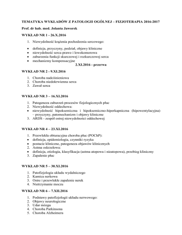 TEMATYKA WYKŁADÓW Z PATOLOGII OGÓLNEJ – FIZJOTERAPIA 2016-2017 Prof. dr hab. med. Jolanta Jaworek WYKŁAD NR 1 - 26.X.2016 1. Niewydolność krążenia pochodzenia sercowego: definicja, przyczyny, podział, objawy kliniczne niewydolność serca prawo i lewokomorowa zaburzenia funkcji skurczowej i rozkurczowej serca mechanizmy kompensacyjne 2.XI.2016 - przerwa WYKŁAD NR 2 - 9.XI.2016 1. Choroba nadciśnieniowa 2. Choroba niedokrwienna serca 3. Zawał serca WYKŁAD NR 3 – 16.XI.2016 1. Patogeneza zaburzeń procesów fizjologicznych płuc 2. Niewydolność oddechowa: niewydolność hipoksemiczna i hipoksemiczno-hiperkapniczna (hipowentylacyjna) – przyczyny, patomechanizm i objawy kliniczne 3. ARDS - zespół ostrej niewydolności oddechowej WYKŁAD NR 4 – 23.XI.2016 1. 2. 3. Przewlekła obturacyjna choroba płuc (POChP): definicja, epidemiologia, czynniki ryzyka postacie kliniczne, patogeneza objawów klinicznych Astma oskrzelowa: definicja, etiologia, klasyfikacja (astma atopowa i nieatopowa), przebieg kliniczny Zapalenie płuc WYKŁAD NR 5 – 30.XI.2016 1. 2. 3. 4. Patofizjologia układu wydalniczego Kamica nerkowa Ostre i przewlekłe zapalenie nerek Nietrzymanie moczu WYKŁAD NR 6 – 7.XII.2016 1. 2. 3. 4. 5. Podstawy patofizjologii układu nerwowego: Objawy neurologiczne Udar mózgu Choroba Parkinsona Choroba Alzheimera TEMATYKA SEMINARIUM – PATOLOGIA OGÓLNA FIZJOTERAPIA 2016-2017 SEMINARIUM NR 1 - 17 i 19.X. 2016 I Wprowadzenie do patologii 1. Pojęcia: zdrowie, choroba, etiologia, patogeneza, symptomatologia 2. Etapy i klasyfikacja chorób 3. Choroba wrodzona, a genetyczna (dziedziczna) 4. Czynniki chorobotwórcze i czynniki ryzyka II Zapalenie 1. Czynniki zapalne 2. Mechanizm zapalenia: zmiany naczyniowe, odpowiedź białokrwinkowa oraz mediatory zapalenia 3. Podział zapaleń, objawy miejscowe i ogólnoustrojowe SEMINARIUM NR 2 – 24 i 26.X.2016 I. Odporność 1. Pojęcia: antygen, przeciwciało 2. Odporność swoista i nieswoista, nabyta i wrodzona, wrodzone i nabyte niedobory odporności 3. Komórki układu immunologicznego: limfocyty, monocyty i makrofagi, komórki prezentujące antygen (APC) 4. Odpowiedź immunologiczna humoralna i komórkowa 5. Odpowiedź immunologiczna pierwotna i wtórna, komórki pamięci immunologicznej II. Nadwrażliwość 1. Typy reakcji nadwrażliwości (I – IV) i ich przykłady 2. Rodzaje chorób alergicznych, wstrząs anafilaktyczny III Autoimmunizacja 1. Autotolerancja immunologiczna i autoimmunizacja 2. Rodzaje chorób autoimmunizacyjnych SEMINARIUM NR 3 – 7 i 9.XI.2016 I Zaburzenia przemian aminokwasów: fenyloketonuria, alkaptonuria, albinizm II Zaburzenia przemian tłuszczów: 1. Metabolizm cholesterolu, lipoproteiny LDL i HDL 2. Pierwotne i wtórne dyslipidemie 3. Miażdżyca: przyczyny, czynniki ryzyka, mechanizm, etapy powstawania blaszki miażdżycowej, rodzaje blaszek miażdżycowych, objawy i następstwa miażdżycy III Zaburzenia przemian węglowodanów – cukrzyca 1. Kryteria diagnostyczne cukrzycy 2. Pojęcie, przyczyny, rodzaje cukrzycy (typ I, typ II, LADA, MODY, ciążowa) i objawy 3. Ostre powikłania cukrzycy – kwasica ketonowa 4. Przewlekłe powikłania cukrzycy: mikro i makroangiopatie, neuropatie cukrzycowe i stopa cukrzycowa SEMINARIUM NR 4 – 14 i 16.XI.2016 Choroby układu krążenia 1. Zaburzenia rytmu serca 2. Wady serca 3. Kardiomiopatie 4. Zapalenie mięśnia sercowego SEMINARIUM NR 5 – 21 i 23.XI.2016 Choroby układu oddechowego 1. Choroby restrykcyjne płuc 2. Nadciśnienie płucne 3. Zatorowość płucna 4. Serce płucne 5. Choroby zawodowe płuc 6. Gruźlica 7. Choroby opłucnej 8. Mukowiscydoza SEMINARIUM NR 6 – 28 i 30.XI.2016 Ból 1. Pojęcia: ból, analgezja, hiperalgezja, allodynia, parestezja 2. Nocycepcja, przewodzenie, percepcja i modulacja czucia bólu 3. Ból - etiopatogeneza, podział, cechy bólu, skale badania bólu 4. Ból przewlekły: definicja, patomechanizm, rodzaje, objawy i skutki 5. Przyczyny i charakterystyka bólu nowotworowego, zwyrodnieniowego, neuropatycznego, fantomowego, ośrodkowego 6. Zespoły bólowe: RSD, neuralgia, kauzalgia, fibromialgia 7. Bóle głowy: migrena, ból napięciowy, klasterowy, zespół szyjny górny 8. Reakcje ustroju na ból SEMINARIUM NR 7 – 5 i 7.XII.2016 Choroby układu nerwowego 1. Padaczka 2. SM 3. Choroby zapalne układu nerwowego: zapalenie opon mózgowo-rdzeniowych, zapalenie mózgu 4. Choroby złącza nerwowo-mięśniowego (zespół Lambert-Eatona, miastenia, botulizm) SEMINARIUM NR 8 – 12 i 14.XII.2016 Patologia nowotworów 1. Etapy karcinogenezy i rodzaje karcinogenów (chemiczne, fizyczne, biologiczne) 2. Rola genów w karcinogenezie 3. Cechy komórek nowotworowych 4. Symptomatologia nowotworów 5. Zespoły paraneoplastyczne 6. Markery nowotworowe SEMINARIUM NR 9 - 19 i 21.XII.2016 I Patofizjologia układu czerwonokrwinkowego: 1. Niedokrwistości: mikrocytowe (z niedoboru żelaza), normocytowe (z utraty krwi, hemolityczna), makrocytowe (megaloblastyczna) 2. Nadkrwistości: czerwienica prawdziwa, nadkrwistość wtórna II Patofizjologia układu białokrwinkowego: 1. Ostre białaczki 2. Przewlekłe zespoły mieloproliferacyjne: przewlekła białaczka szpikowa 3. Przewlekłe zepoły limfoproliferacyjne: przewlekłą białaczka limfocytowa, chłoniaki 4. Szpiczak mnogi III Zaburzenia krzepnięcia: 1. Skazy krwotoczne: osoczowe, płytkowe, naczyniowe 2. Zakrzepica 3. DIC SEMINARIUM NR 10 – 4 i 9. I. 2017 Choroby układu pokarmowego 1. GERD 2. Choroba wrzodowa żołądka i dwunastnicy 3. Choroby zapalne jelit, IBS, rak jelita grubego 4. Choroby wątroby: WZW, marskość wątroby 10.00 – 11.30 – F – PATOL gr I (17.X – 9.I, bez 31.X) 7.45 – 9.15 – F – PATOL gr II (19.X – 4.I, bez 2.XI) 9.30 – 11.00 – F – PATOL gr III (19.X – 4.I, bez 2.XI) 11.15 – 12.45 – F – PATOL gr IV (19.X – 4.I, bez 2.XI)