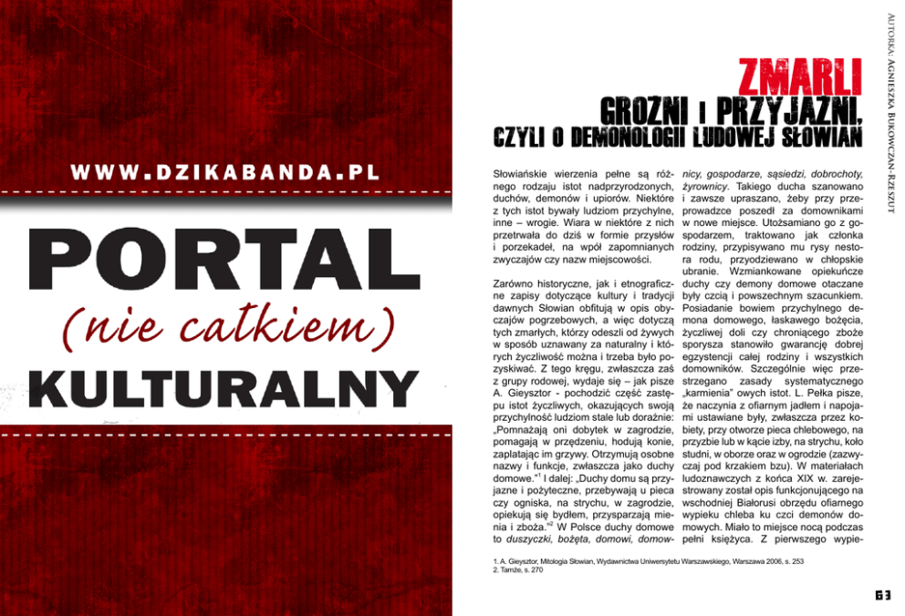 GroZni i przyjaZni, czyli o demonologii ludowej SLowian Słowiańskie wierzenia pełne są różnego rodzaju istot nadprzyrodzonych, duchów, demonów i upiorów. Niektóre z tych istot bywały ludziom przychylne, inne – wrogie. Wiara w niektóre z nich przetrwała do dziś w formie przysłów i porzekadeł, na wpół zapomnianych zwyczajów czy nazw miejscowości. Zarówno historyczne, jak i etnograficzne zapisy dotyczące kultury i tradycji dawnych Słowian obfitują w opis obyczajów pogrzebowych, a więc dotyczą tych zmarłych, którzy odeszli od żywych w sposób uznawany za naturalny i których życzliwość można i trzeba było pozyskiwać. Z tego kręgu, zwłaszcza zaś z grupy rodowej, wydaje się – jak pisze A. Gieysztor - pochodzić część zastępu istot życzliwych, okazujących swoją przychylność ludziom stale lub doraźnie: „Pomnażają oni dobytek w zagrodzie, pomagają w przędzeniu, hodują konie, zaplatając im grzywy. Otrzymują osobne nazwy i funkcje, zwłaszcza jako duchy domowe.”1 I dalej: „Duchy domu są przyjazne i pożyteczne, przebywają u pieca czy ogniska, na strychu, w zagrodzie, opiekują się bydłem, przysparzają mienia i zboża.”2 W Polsce duchy domowe to duszyczki, bożęta, domowi, domow- nicy, gospodarze, sąsiedzi, dobrochoty, żyrownicy. Takiego ducha szanowano i zawsze upraszano, żeby przy przeprowadzce poszedł za domownikami w nowe miejsce. Utożsamiano go z gospodarzem, traktowano jak członka rodziny, przypisywano mu rysy nestora rodu, przyodziewano w chłopskie ubranie. Wzmiankowane opiekuńcze duchy czy demony domowe otaczane były czcią i powszechnym szacunkiem. Posiadanie bowiem przychylnego demona domowego, łaskawego bożęcia, życzliwej doli czy chroniącego zboże sporysza stanowiło gwarancję dobrej egzystencji całej rodziny i wszystkich domowników. Szczególnie więc przestrzegano zasady systematycznego „karmienia” owych istot. L. Pełka pisze, że naczynia z ofiarnym jadłem i napojami ustawiane były, zwłaszcza przez kobiety, przy otworze pieca chlebowego, na przyzbie lub w kącie izby, na strychu, koło studni, w oborze oraz w ogrodzie (zazwyczaj pod krzakiem bzu). W materiałach ludoznawczych z końca XIX w. zarejestrowany został opis funkcjonującego na wschodniej Białorusi obrzędu ofiarnego wypieku chleba ku czci demonów domowych. Miało to miejsce nocą podczas pełni księżyca. Z pierwszego wypie- Autorka: Agnieszka Bukowczan-Rzeszut Zmarli 1. A. Gieysztor, Mitologia Słowian, Wydawnictwa Uniwersytetu Warszawskiego, Warszawa 2006, s. 253 2. Tamże, s. 270 63 czonego bochenka gospodarz odrywał sporą kromkę, posypywał grubo solą i zanosił do obory. Tu składał ją do żłobu, wypowiadając przy tym następującą modlitwę: „Domowy duchu! Przyjmij ode mnie chleb i sól, miłuj moje konie i bądź dla nich łaskaw. Ja też będę cię miłował i będę łaskaw dla ciebie.”3 Oczywiście nietrudno się domyślić, że Kościół katolicki nie patrzył przychylnie na tego typu praktyki. J. Strzelczyk cytuje kazanie z XV w, zgodnie z którym: „Są tacy [...], co składają ofiary demonom, co się zowią uboże, zostawiając im resztki jedzenia w czwartek po obiedzie [...]. Są niektórzy, co nie myją misek po obiedzie w uroczysty Wielki Czwartek, aby nakarmić dusze i inne duchy, co się nazywają uboże, głupio wierząc, co duch potrzebuje rzeczy cielesnych [...]. Niektórzy zostawiają resztki umyślnie na miskach po obiedzie, jakoby dla nakarmienia dusz czy to pewnego demona co się nazywa uboże, ale to śmiechu warte, ponieważ często myślą głupcy i lekkomyślni, że to co zostawili zjada wymienione uboże, które pielęgnują, bo jakoby przynosi szczęście [...].”4 Co ciekawe, wyraz uboże czy ubożę przetrwał w języku polskim w formie bożęta, bodziatki lub bożątki. Miejscowość Borzęta znajduje się przykładowo w gminie Myślenice (woj. małopolskie). Drugą grupę stanowiły istoty nadprzyrodzone wrogie ludziom, a więc zmory, duchy i upiory wszelkiej maści, których istnienie opierało się na określonym w wierzeniach pochodzeniu, mianowicie takim, które wiązało się ze śmiercią w sposób gwałtowny, nienaturalny lub przedwczesny. L. Stomma, który badał zapisy poświęcone wierzeniom w demony i duchy zmarłych z II poł. XIX wieku stwierdził, że na 500 zbadanych wypadków los taki spotykał 20,2% topielców, 18% nieochrzczonych dzieci, 16,6% samobójców i wisielców, 11% porońców, 8% zmarłych w dniu ślubu. Mniejszy udział miały osoby zmarłe śmiercią gwałtowną w inny sposób, zmarłe położnice czy narzeczeni zmarli przed ślubem.5 Stomma wyjaśnił także „rodowód” najpopularniejszych mitycznych istot, przewijających się przed podania ludowe. A więc na przykład: Baba Jaga lub mamuna to dusza zmarłej położnicy, błądzeń to dusza wisielca lub niechrzeńca, krasnoludek to dusza martwego płodu lub porońca, południcami stawali się narzeczeni zmarli podczas ślubu lub bezpośrednio przed nim, podobnie jak rusałkami (w tym przypadku - tylko narzeczone), zjawami – dusze zamordowanych, a topielcami - dusze utopionych6. Na szczególną uwagę zasługują tutaj porońce i dzieci zmarłe w trakcie porodu, którym przypisuje się w folklorze słowiańskim potężną moc. Chodzi o skumulowany potencjał niezrealizowanego życia. A. Szyjewski zaznacza, że narodziny były w wierzeniach Słowian okresem progowym, doświadczeniem, w którym związek pierwiastków duchowych z ciałem dopiero się ustala i może łatwo ulec przerwaniu7. 3. L. Pełka, Polska demonologia ludowa, Iskry, Warszawa 1987, s. 26 4. J. Strzelczyk, Mity, podania i wierzenia dawnych Słowian, Dom Wydawniczy REBIS, Poznań 1998, s. 64-65 5. L. Stomma, Antropologia kultury wsi polskiej XIX-XX w., Instytut Wydawniczy PAX, Warszawa 1986, s. 151-166 6. Tamże, s. 150-151 7. A. Szyjewski, Religia Słowian, Wydawnictwo WAM, Kraków 2003, s. 195 64 Co ciekawe, nie wsz