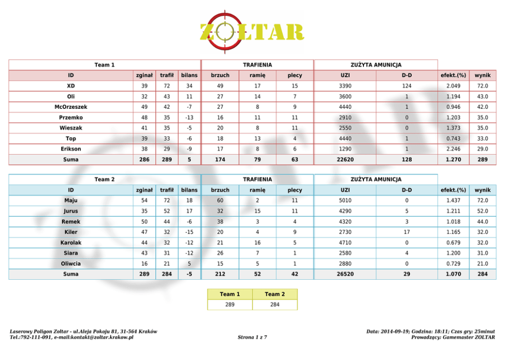 Team 1 TRAFIENIA ZUŻYTA AMUNICJA ID zginał trafił bilans brzuch ramię plecy UZI D-D efekt.(%) wynik XD 39 72 34 49 17 15 3390 124 2.049 72.0 Oli 32 43 11 27 14 7 3600 1 1.194 43.0 McOrzeszek 49 42 -7 27 8 9 4440 1 0.946 42.0 Przemko 48 35 -13 16 11 11 2910 0 1.203 35.0 Wieszak 41 35 -5 20 8 11 2550 0 1.373 35.0 Top 39 33 -6 18 13 4 4440 1 0.743 33.0 Erikson 38 29 -9 17 8 6 1290 1 2.246 29.0 Suma 286 289 5 174 79 63 22620 128 1.270 289 Team 2 TRAFIENIA ZUŻYTA AMUNICJA ID zginał trafił bilans brzuch ramię plecy UZI D-D efekt.(%) wynik Maju 54 72 18 60 2 11 5010 0 1.437 72.0 Jurus 35 52 17 32 15 11 4290 5 1.211 52.0 Remek 50 44 -6 38 3 4 4320 3 1.018 44.0 Kiler 47 32 -15 20 4 9 2730 17 1.165 32.0 Karolak 44 32 -12 21 16 5 4710 0 0.679 32.0 Siara 43 31 -12 26 7 1 2580 4 1.200 31.0 Oliwcia 16 21 5 15 5 1 2880 0 0.729 21.0 Suma 289 284 -5 212 52 42 26520 29 1.070 284 Laserowy Poligon Zoltar - ul.Aleja Pokoju 81, 31-564 Kraków Tel.:792-111-091, e-mail:[email protected] Team 1 Team 2 289 284 Strona 1 z 7 Data: 2014-09-19; Godzina: 18:11; Czas gry: 25minut Prowadzący: Gamemaster ZOLTAR Team 1 TRAFIENIA ZUŻYTA AMUNICJA ID zginał trafił bilans brzuch ramię plecy UZI D-D efekt.(%) wynik XD 42 52 10 33 11 11 6270 22 0.826 52.0 McOrzeszek 37 49 12 35 9 7 5100 11 0.959 49.0 Wieszak 43 48 6 35 12 4 4110 3 1.167 48.0 Top 49 47 -1 29 16 8 5610 3 0.837 47.0 Przemko 50 46 -4 29 7 12 5490 0 0.838 46.0 Erikson 44 30 -14 23 6 3 2070 0 1.449 30.0 Oli 48 26 -22 16 5 5 3810 1 0.682 26.0 Suma 313 298 -13 200 66 50 32460 40 0.917 298 Team 2 TRAFIENIA ZUŻYTA AMUNICJA ID zginał trafił bilans brzuch ramię plecy UZI D-D efekt.(%) wynik Jurus 32 67 35 49 21 5 5460 0 1.227 67.0 Maju 49 66 17 52 2 12 5250 0 1.257 66.0 Karolak 50 47 -3 27 24 6 4980 0 0.944 47.0 Oliwcia 27 39 12 34 2 3 3270 0 1.193 39.0 Remek 52 36 -16 32 2 3 6180 4 0.582 36.0 Siara 43 35 -8 19 16 4 3330 2 1.050 35.0 Kiler 45 21 -24 19 5 1 3780 3 0.555 21.0 Suma 298 311 13 232 72 34 32250 9 0.964 311 Laserowy Poligon Zoltar - ul.Aleja Pokoju 81, 31-564 Kraków Tel.:792-111-091, e-mail:[email protected] Team 2 Team 1 311 298 Strona 2 z 7 Data: 2014-09-19; Godzina: 19:06; Czas gry: 25minut Prowadzący: Gamemaster ZOLTAR Team 1 TRAFIENIA ZUŻYTA AMUNICJA ID zginał trafił bilans brzuch ramię plecy UZI D-D efekt.(%) wynik XD 39 67 28 52 17 3 5490 3 1.220 67.0 Top 46 50 5 42 4 7 3990 7 1.251 50.0 Przemko 43 44 1 27 9 11 3690 0 1.192 44.0 Oli 60 38 -22 23 10 9 2610 10 1.450 38.0 Wieszak 26 28 2 16 7 6 3060 0 0.915 28.0 McOrzeszek 33 19 -14 16 2 1 4020 0 0.473 19.0 Erikson 37 16 -21 10 4 3 1470 0 1.088 16.0 Suma 284 262 -21 186 53 40 24330 20 1.076 262 Team 2 TRAFIENIA ZUŻYTA AMUNICJA ID zginał trafił bilans brzuch ramię plecy UZI D-D efekt.(%) wynik Jurus 33 71 38 50 12 16 5070 0 1.400 71.0 Oliwcia 40 47 7 39 8 2 3060 0 1.536 47.0 Maju 41 47 6 43 0 5 4410 0 1.066 47.0 Karolak 37 44 7 23 20 6 4380 0 1.005 44.0 Siara 38 35 -3 27 5 4 2460 3 1.421 35.0 Remek 39 30 -9 20 2 8 4680 5 0.640 30.0 Kiler 34 9 -25 5 2 2 3120 0 0.288 9.0 Suma 262 283 21 207 49 43 27180 8 1.041 283 Laserowy Poligon Zoltar - ul.Aleja Pokoju 81, 31-564 Kraków Tel.:792-111-091, e-mail:[email protected] Team 2 Team 1 283 262 Strona 3 z 7 Data: 2014-09-19; Godzina: 19:34; Czas gry: 20minut Prowadzący: Gamemaster ZOLTAR Drużyny Miejsce Laserowy Poligon Zoltar - ul.Aleja Pokoju 81, 31-564 Kraków Tel.:792-111-091, e-mail:[email protected] Rozgrywki Nazwa 1 2 3 Suma Team 2 284 311 283 878 Team 1 289 298 262 849 Strona 4 z 7 Data: 2014-09-19 Prowadzący: Gamemaster ZOLTAR Zestawienie wg wyniku Miejsce TRAFIENIA ZUŻYTA AMUNICJA ID zginał trafił bilans brzuch ramię plecy UZI D-D efekt.(%) Jurus 86.60 166.20 79.60 114.80 40.80 28.80 12870.00 4.00 1.291 XD 103.80 166.20 62.40 117.60 39.40 23.80 13218.00 119.80 1.246 Maju 123.40 157.40 34.00 132.60 3.20 23.40 12618.00 0.00 1.247 157.40 Top 116.40 114.00 -2.40 79.60 27.20 16.60 12030.00 10.20 0.947 114.00 4 Przemko 121.40 108.80 -12.60 63.00 23.40 29.40 10410.00 0.00 1.045 108.80 5 Karolak 112.20 107.20 -5.00 61.40 52.00 14.80 12132.00 0.00 0.884 107.20 6 Oliwcia 74.40 95.00 20.60 78.20 13.60 5.20 7980.00 0.00 1.190 95.00 7 Wieszak 93.20 94.40 1.20 60.00 23.00 18.00 8388.00 2.40 1.125 94.40 8 Remek 120.60 94.00 -26.60 76.00 6.00 13.60 13080.00 10.60 0.718 94.00 9 Oli 124.00 93.20 -30.80 57.40 25.20 18.60 8538.00 11.60 1.090 93.20 10 McOrzeszek 101.80 91.80 -10.00 65.60 15.60 13.80 11652.00 9.60 0.787 91.80 11 Siara 106.80 87.80 -19.00 63.00 23.40 8.00 7188.00 7.80 1.220 87.80 12 Erikson 102.60 63.20 -39.40 42.00 15.20 10.20 4158.00 0.80 1.520 63.20 13 Kiler 107.60 51.40 -56.20 36.20 9.20 10.00 8328.00 16.00 0.616 51.40 Laserowy Poligon Zoltar - ul.Aleja Pokoju 81, 31-564 Kraków Tel.:792-111-091, e-mail:[email protected] Strona 5 z 7 wynik 166.20 Data: 2014-09-19 Prowadzący: Gamemaster ZOLTAR Zestawienie wg bilansu Miejsce TRAFIENIA ZUŻYTA AMUNICJA ID zginał trafił bilans brzuch ramię plecy UZI D-D efekt.(%) wynik Jurus 86.60 166.20 79.60 114.80 40.80 28.80 12870.00 4.00 1.291 166.20 XD 103.80 166.20 62.40 117.60 39.40 23.80 13218.00 119.80 1.246 166.20 Maju 123.40 157.40 34.00 132.60 3.20 23.40 12618.00 0.00 1.247 157.40 4 Oliwcia 74.40 95.00 20.60 78.20 13.60 5.20 7980.00 0.00 1.190 95.00 5 Wieszak 93.20 94.40 1.20 60.00 23.00 18.00 8388.00 2.40 1.125 94.40 6 Top 116.40 114.00 -2.40 79.60 27.20 16.60 12030.00 10.20 0.947 114.00 7 Karolak 112.20 107.20 -5.00 61.40 52.00 14.80 12132.00 0.00 0.884 107.20 8 McOrzeszek 101.80 91.80 -10.00 65.60 15.60 13.80 11652.00 9.60 0.787 91.80 9 Przemko 121.40 108.80 -12.60 63.00 23.40 29.40 10410.00 0.00 1.045 108.80 10 Siara 106.80 87.80 -19.00 63.00 23.40 8.00 7188.00 7.80 1.220 87.80 11 Remek 120.60 94.00 -26.60 76.00 6.00 13.60 13080.00 10.60 0.718 94.00 12 Oli 124.00 93.20 -30.80 57.40 25.20 18.60 8538.00 11.60 1.090 93.20 13 Erikson 102.60 63.20 -39.40 42.00 15.20 10.20 4158.00 0.80 1.520 63.20 14 Kiler 107.60 51.40 -56.20 36.20 9.20 10.00 8328.00 16.00 0.616 51.40 Laserowy Poligo