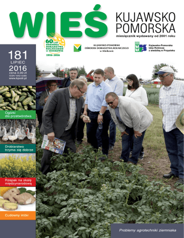 Proste, wszechstronne i sprawdzone narzędzie każdego gospodarza... Ciągnik Kubota serii M60 to niezastąpione narzędzie w Twoim gospodarstwie! | | | | Niskie spalanie Doskonała zwrotność Prosta konstrukcja Trwałość i niezawodność www.traktorykubota.pl Skontaktuj się z Twoim lokalnym dilerem i poznaj promocyjne oferty finansowania fabrycznego Kubota Finance Dobrze odżywiamy pomidory Produkcja rzepaku w skali całego świata w ciągu ostatnich trzydziestu lat zwiększyła się czterokrotnie. Generalnie tempo wzrostu produkcji roślin oleistych jest szybkie, ale w przypadku rzepaku szczególnie. Jego produkcja szybciej wzrasta nawet niż produkcja soi czy słonecznika. Pomidory gruntowe, tak jak każda roślina, wymagają odpowiednich składników pokarmowych dostarczonych w optymalnych ilościach w odpowiednim czasie. Dobrze wykarmione są mniej podatne na intensywne infekcje chorób grzybowych czy bakteryjnych. Odmiany typu HOLL W ynika to ze wzrostu zapotrzebowania na oleje roślinne, co jest spowodowane zarówno wzrostem demograficznym, jak i zmianami w nawykach żywieniowych, a także szerszym zastosowaniem tego typu substratów w przemyśle chemicznym. Ocenia się, iż do 2030 r. blisko o 5% rocznie będzie wzrastało wykorzystanie olei roślinnych przez koncerny chemiczne. Uprawa rzepaku z całą pewnością jest perspektywicznym biznesem, tym bardziej, iż aktualnie dysponujemy najniższymi od dekady zapasami, a różnica w cenie skupu pszenicy i rzepaku, jest korzystna dla rzepaku. Na europejskim rynku w ubiegłym roku za tonę płacono 361 euro, w tym roku, w analogicznym okresie cena skupu wynosi 371 euro. To mały, ale korzystny dla producentów wzrost. Niewątpliwie zapotrzebowanie na ten surowiec jest duże, a wszystko wskazuje na to, że będzie jeszcze wyższe. W jakim kierunku zatem będą postępowały prace hodowlane? Jakim wymaganiom rynku muszą sprostać firmy nasienne? Już w latach dziewięćdziesiątych ubiegłego stulecia większość wiodących firm wycofała się z hodowli odmian jednozerowych w kierunku dwuzerowych. Następnie nastąpił rozwój hodowli hybryd, które zdominowały ofertę dostępnych na rynku odmian. W tej chwili w Polsce mieszańce uprawia się na około ¾ powierzchni terenów przeznaczonych pod uprawę rzepaku. Hybrydy w ciągu kilkunastu lat zastąpiły odmiany liniowe. Wyżej i wierniej plonują oraz cechują się lepszą regeneracją po wystąpieniu czynników stresowych, takich jak: przymrozki, susze czy podtopienia. 4 Wieś Kujawsko-Pomorska Mniejsza jest też ich norma wysiewu. Uprawa hybryd daje też możliwość wprowadzania nowych technologii. Nadal trwają prace nad ich udoskonalaniem. W 2005 r. nastąpił przełom w hodowli odmian hybrydowych – zarejestrowano pierwszą odmianę odporną na suchą zgniliznę kapustnych. Obecnie na rynku dostępnych jest wiele odmian tolerancyjnych na najczęściej występujące w tej uprawie choroby. Ostatnio hodowcy wiele wysiłków włożyli w pracę nad odmianami odpornymi na kiłę kapusty – najgroźniejszą z chorób porażających rośliny rzepaku. W ofercie wiodących firm nasiennych znajdują się odmiany o podwyższonej odporności na pękanie łuszczyn i osypywanie się nasion. Wybór tego typu odmian to nie tylko redukcja strat podczas zbiorów, ale także zminimalizowanie problemu występowania samosiewów rzepaku w uprawach następczych. Według badań PDO COBORU przeprowadzonych w ubiegłym roku najlepiej plonujące odmiany – DK Excellium, DK Exstorm, DK Explicit posiadają cechy podwyższonej odporności na pękanie łuszczyn i osypywanie się nasion. W badaniach rozpoznawczych COBORU przeprowadzonych w 2015 r. numerem jeden była także odmiana posiadająca tę cechę. Aktualnie firmy nasienne skupiają wysiłki nad hodowlą odmian typu HOLL – o wysokiej zawartości kwasu oleinowego (HO) i niskiej zawartości kwasu linolenowego (LL). Powodem wyboru takiego kierunku prac są przede wszystkim walory prozdrowotne oleju pochodzącego z tego typu odmian. Cechuje się on jedną z najniższych zawartości kwasów nasyconych, występują w nim tylko śladowe P ilości kwasów typu trans, ma wysoką zawartość witaminy E i jest bardzo konkurencyjny do wysokooleinowego oleju słonecznikowego. Poza tym ten typ oleju posiada wyższą niż olej palmowy stabilność i wydłużony termin przydatności do smażenia. Hodowcy dążą do włączenia innych korzystnych cech charakterystycznych dla mieszańców do odmian typu HOLL (niska biomasa, podwyższona odporność na pękanie łuszczyn, tolerancja na suchą zgniliznę kapustnych). Efektem tych prac w przyszłości powinno być pojawienie się odmian o specyficznych profilach tłuszczowych, o bardzo wysokiej wartości dla przemysłu spożywczego i docelowych odbiorców. Celem firm nasiennych jest dostarczanie odmian zgodnych z potrzebami i wymaganiami europejskich rolników i oczekiwaniami przemysłu przetwórczego. Generalnie prace nastawione są na opracowanie wysoko plonujących odmian. Wysokość i jakość plonów to priorytet wszystkich graczy tego rynku. Tylko wysoko i wiernie plonujące odmiany będą znajdowały nabywców. Jeśli chodzi o inne cele hodowców, to z całą pewnością można wymienić badania nad kompozycją kwasów tłuszczowych, odpowiednią dla specyficznych zastosowań w żywieniu i przemyśle. Jednym z takich projektów są właśnie odmiany typu HOLL. Stanowią one odpowiedź na stale rosnące wymagania konsumentów, którzy oczekują coraz zdrowszych i bardziej wartościowych produktów. Anna Rogowska, Agencja Jatrejon Fot. W. Janiak lipiec 2016 roducenci warzyw gruntowych przy podejmowaniu decyzji o tym jakie nawozy wysieją kierują się często tylko własnym doświadczeniem, a nie wynikami analiz chemicznych i zaleceniami nawozowymi. W gospodarstwach prowadzących intensywną produkcję zwykle do gleby wprowadzany jest nadmiar składników pokarmowych. Z kolei gleby, na których dopiero rozp