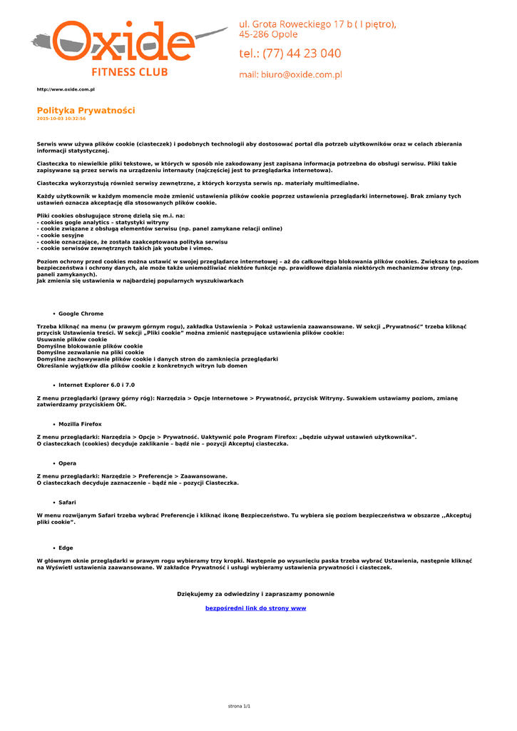 http://www.oxide.com.pl Polityka Prywatności 2015-10-03 10:32:56 Serwis www używa plików cookie (ciasteczek) i podobnych technologii aby dostosować portal dla potrzeb użytkowników oraz w celach zbierania informacji statystycznej. Ciasteczka to niewielkie pliki tekstowe, w których w sposób nie zakodowany jest zapisana informacja potrzebna do obsługi serwisu. Pliki takie zapisywane są przez serwis na urządzeniu internauty (najczęściej jest to przeglądarka internetowa). Ciasteczka wykorzystują również serwisy zewnętrzne, z których korzysta serwis np. materiały multimedialne. Każdy użytkownik w każdym momencie może zmienić ustawienia plików cookie poprzez ustawienia przeglądarki internetowej. Brak zmiany tych ustawień oznacza akceptację dla stosowanych plików cookie. Pliki cookies obsługujące stronę dzielą się m.i. na: - cookies gogle analytics – statystyki witryny - cookie związane z obsługą elementów serwisu (np. panel zamykane relacji online) - cookie sesyjne - cookie oznaczające, że została zaakceptowana polityka serwisu - cookie serwisów zewnętrznych takich jak youtube i vimeo. Poziom ochrony przed cookies można ustawić w swojej przeglądarce internetowej – aż do całkowitego blokowania plików cookies. Zwiększa to poziom bezpieczeństwa i ochrony danych, ale może także uniemożliwiać niektóre funkcje np. prawidłowe działania niektórych mechanizmów strony (np. paneli zamykanych). Jak zmienia się ustawienia w najbardziej popularnych wyszukiwarkach Google Chrome Trzeba kliknąć na menu (w prawym górnym rogu), zakładka Ustawienia > Pokaż ustawienia zaawansowane. W sekcji „Prywatność” trzeba kliknąć przycisk Ustawienia treści. W sekcji „Pliki cookie” można zmienić następujące ustawienia plików cookie: Usuwanie plików cookie Domyślne blokowanie plików cookie Domyślne zezwalanie na pliki cookie Domyślne zachowywanie plików cookie i danych stron do zamknięcia przeglądarki Określanie wyjątków dla plików cookie z konkretnych witryn lub domen Internet Explorer 6.0 i 7.0 Z menu przeglądarki (prawy górny róg): Narzędzia > Opcje Internetowe > Prywatność, przycisk Witryny. Suwakiem ustawiamy poziom, zmianę zatwierdzamy przyciskiem OK. Mozilla Firefox Z menu przeglądarki: Narzędzia > Opcje > Prywatność. Uaktywnić pole Program Firefox: „będzie używał ustawień użytkownika”. O ciasteczkach (cookies) decyduje zaklikanie – bądź nie – pozycji Akceptuj ciasteczka. Opera Z menu przeglądarki: Narzędzie > Preferencje > Zaawansowane. O ciasteczkach decyduje zaznaczenie – bądź nie – pozycji Ciasteczka. Safari W menu rozwijanym Safari trzeba wybrać Preferencje i kliknąć ikonę Bezpieczeństwo. Tu wybiera się poziom bezpieczeństwa w obszarze ,,Akceptuj pliki cookie”. Edge W głównym oknie przeglądarki w prawym rogu wybieramy trzy kropki. Następnie po wysunięciu paska trzeba wybrać Ustawienia, następnie kliknąć na Wyświetl ustawienia zaawansowane. W zakładce Prywatność i usługi wybieramy ustawienia prywatności i ciasteczek. Dziękujemy za odwiedziny i zapraszamy ponownie bezpośredni link do strony www strona 1/1 Powered by TCPDF (www.tcpdf.org)