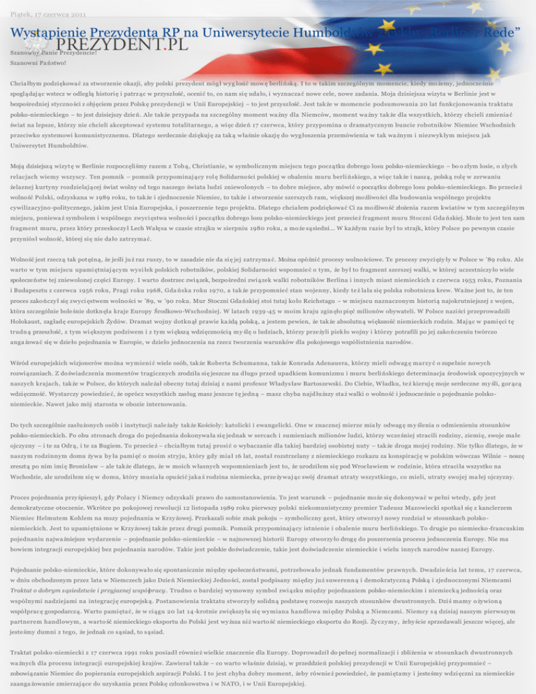 Piątek, 17 czerwca 2011 Wystąpienie Prezydenta RP na Uniwersytecie Humboldtów z cyklu „Berliner Rede” Szanowny Panie Prezydencie! Szanowni Pa ństwo! Chcia łbym podzi ękowa ć za stworzenie okazji, aby polski prezydent móg ł wyg łosić mow ę berli ńską. I to w takim szczególnym momencie, kiedy mo żemy, jednocze śnie spoglądając wstecz w odleg łą histori ę i patrz ąc w przysz łość, ocenić to, co nam si ę uda ło, i wyznacza ć nowe cele, nowe zadania. Moja dzisiejsza wizyta w Berlinie jest w bezpośredniej styczno ści z objęciem przez Polskę prezydencji w Unii Europejskiej – to jest przysz łość. Jest tak że w momencie podsumowania 20 lat funkcjonowania traktatu polsko-niemieckiego – to jest dzisiejszy dzie ń. Ale tak że przypada na szczególny moment wa żny dla Niemców, moment wa żny tak że dla wszystkich, którzy chcieli zmienia ć świat na lepsze, którzy nie chcieli akceptowa ć systemu totalitarnego, a wi ęc dzień 17 czerwca, który przypomina o dramatycznym buncie robotników Niemiec Wschodnich przeciwko systemowi komunistycznemu. Dlatego serdecznie dzi ękuj ę za tak ą właśnie okazj ę do wyg łoszenia przemówienia w tak wa żnym i niezwyk łym miejscu jak Uniwersytet Humboldtów. Moją dzisiejszą wizyt ę w Berlinie rozpocz ęliśmy razem z Tob ą, Christianie, w symbolicznym miejscu tego pocz ątku dobrego losu polsko-niemieckiego – bo o złym losie, o z łych relacjach wiemy wszyscy. Ten pomnik – pomnik przypominaj ący rol ę Solidarno ści polskiej w obaleniu muru berli ńskiego, a wi ęc tak że i naszą, polską rolę w zerwaniu żelaznej kurtyny rozdzielaj ącej świat wolny od tego naszego świata ludzi zniewolonych – to dobre miejsce, aby mówi ć o początku dobrego losu polsko-niemieckiego. Bo przecie ż wolność Polski, odzyskana w 1989 roku, to tak że i zjednoczenie Niemiec, to tak że i stworzenie szerszych ram, wi ększej możliwości dla budowania wspólnego projektu cywilizacyjno -politycznego, jakim jest Unia Europejska, i poszerzenie tego projektu. Dlatego chcia łem podziękowa ć Ci za możliwość złożenia razem kwiatów w tym szczególnym miejscu, poniewa ż symbolem i wspólnego zwyci ęstwa wolno ści i początku dobrego losu polsko -niemieckiego jest przecież fragment muru Stoczni Gda ńskiej. Może to jest ten sam fragment muru, przez który przeskoczy ł Lech Wa łęsa w czasie strajku w sierpniu 1980 roku, a mo że sąsiedni… W ka żdym razie by ł to strajk, który Polsce po pewnym czasie przyniós ł wolność, której si ę nie da ło zatrzyma ć. Wolność jest rzecz ą tak pot ężną, że jeśli ju ż raz ruszy, to w zasadzie nie da si ę jej zatrzyma ć. Można opóźnić procesy wolno ściowe. Te procesy zwyci ęży ły w Polsce w ’89 roku. Ale warto w tym miejscu upami ętniaj ącym wysi łek polskich robotników, polskiej Solidarno ści wspomnie ć o tym, że by ł to fragment szerszej walki, w której uczestniczy ło wiele społeczeństw tej zniewolonej cz ęści Europy. I warto dostrzec związek, bezpośredni zwi ązek walki robotników Berlina i innych miast niemieckich z czerwca 1953 roku, Poznania i Budapesztu z czerwca 1956 roku, Pragi roku 1968, Gda ńska roku 1970, a tak że przypomnie ć stan wojenny, kiedy te ż la ła się polska robotnicza krew. Wa żne jest to, że ten proces zakończy ł się zwyci ęstwem wolno ści w ’89, w ’90 roku. Mur Stoczni Gda ńskiej stoi tutaj ko ło Reichstagu – w miejscu naznaczonym histori ą najokrutniejszej z wojen, która szczególnie bole śnie dotkn ęła kraje Europy Środkowo-Wschodniej. W latach 1939 -45 w moim kraju zgin ęło pięć milionów obywateli. W Polsce nazi ści przeprowadzili Holokaust, zagładę europejskich Żydów. Dramat wojny dotkn ął prawie ka żdą polską, a jestem pewien, że tak że absolutn ą wi ększość niemieckich rodzin. Maj ąc w pami ęci t ę trudn ą przeszłość, z tym wi ększym podziwem i z tym wi ększą wdzięcznością m y ślę o ludziach, którzy prze żyli piek ło wojny i którzy potrafili po jej zako ńczeniu twórczo anga żowa ć się w dzieło pojednania w Europie, w dzie ło jednoczenia na rzecz tworzenia warunków dla pokojowego współistnienia narodów. Wśród europejskich wizjonerów mo żna wymieni ć wiele osób, tak że Roberta Schumanna, tak że Konrada Adenauera, którzy mieli odwag ę marzy ć o zupełnie nowych rozwi ązaniach. Z do świadczenia momentów tragicznych zrodziła się jeszcze na d ługo przed upadkiem komunizmu i muru berli ńskiego determinacja środowisk opozycyjnych w naszych krajach, tak że w Polsce, do których nale żał obecny tutaj dzisiaj z nami profesor Władys ław Bartoszewski. Do Ciebie, Władku, te ż kieruj ę moje serdeczne my śli, gor ącą wdzięczność. Wystarczy powiedzie ć, że oprócz wszystkich zasług masz jeszcze t ę jedn ą – masz chyba najd łuższy sta ż walki o wolność i jednocześnie o pojednanie polskoniemieckie. Nawet jako mój starosta w obozie internowania. Do tych szczególnie zas łużonych osób i instytucji nale żały tak że Kościoły: katolicki i ewangelicki. One w znacznej mierze mia ły odwag ę m y ślenia o odmienieniu stosunków polsko-niemieckich. Po obu stronach droga do pojednania dokonywa ła się jednak w sercach i sumieniach milionów ludzi, którzy wcze śniej stracili rodziny, ziemi ę, swoje ma łe ojczyzny – i te za Odr ą, i te za Bugiem. To przecie ż – chcia łbym tutaj prosi ć o wybaczanie dla takiej bardziej osobistej nuty – tak że droga mojej rodziny. Nie tylko dlatego, że w naszym rodzinnym domu żywa by ła pami ęć o moim stryju, który gdy mia ł 16 lat, zosta ł rozstrzelany z niemieckiego rozkazu za konspiracj ę w polskim wówczas Wilnie – noszę zresztą po nim imi ę Bronisław – ale tak że dlatego, że w moich w łasnych wspomnieniach jest to, że urodziłem si ę pod Wrocławiem w rodzinie, która straci ła wszystko na Wschodzie, ale urodziłe