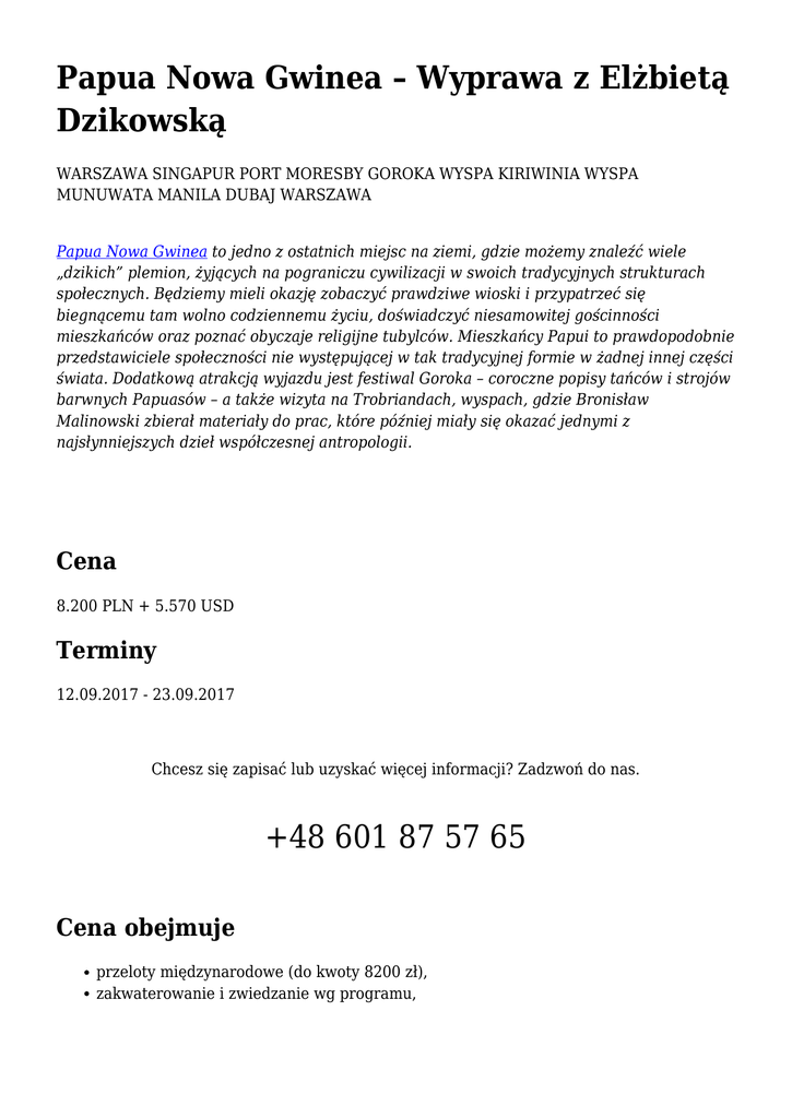 Papua Nowa Gwinea – Wyprawa z Elżbietą Dzikowską WARSZAWA SINGAPUR PORT MORESBY GOROKA WYSPA KIRIWINIA WYSPA MUNUWATA MANILA DUBAJ WARSZAWA Papua Nowa Gwinea to jedno z ostatnich miejsc na ziemi, gdzie możemy znaleźć wiele „dzikich” plemion, żyjących na pograniczu cywilizacji w swoich tradycyjnych strukturach społecznych. Będziemy mieli okazję zobaczyć prawdziwe wioski i przypatrzeć się biegnącemu tam wolno codziennemu życiu, doświadczyć niesamowitej gościnności mieszkańców oraz poznać obyczaje religijne tubylców. Mieszkańcy Papui to prawdopodobnie przedstawiciele społeczności nie występującej w tak tradycyjnej formie w żadnej innej części świata. Dodatkową atrakcją wyjazdu jest festiwal Goroka – coroczne popisy tańców i strojów barwnych Papuasów – a także wizyta na Trobriandach, wyspach, gdzie Bronisław Malinowski zbierał materiały do prac, które później miały się okazać jednymi z najsłynniejszych dzieł współczesnej antropologii. Cena 8.200 PLN + 5.570 USD Terminy 12.09.2017 - 23.09.2017 Chcesz się zapisać lub uzyskać więcej informacji? Zadzwoń do nas. +48 601 87 57 65 Cena obejmuje przeloty międzynarodowe (do kwoty 8200 zł), zakwaterowanie i zwiedzanie wg programu, przeloty wewnętrzne, wyżywienie zgodne z programem (S – śniadanie, L – lunch, K – kolacja), transfery oraz transport samochodowy i łodzią, opiekę lokalnych przewodników, opiekę polskiego pilota, opłaty za wstępy do odwiedzanych miejsc, ubezpieczenie KL i NNW. Cena nie obejmuje dopłaty do pokoju jednoosobowego – 750 USD, napiwków. Plan wyjazdu Dzień 1 Spotkanie na lotnisku, wylot z Warszawy do Singapuru via Dubaj. Dzień 2 Przylot do Singapuru. Transfer do hotelu. Następnie wizyta w dzielnicy chińskiej i rejs po rzece Singapur. Powrót do hotelu na nocleg. Dzień 3 Po śniadaniu zwiedzanie jednej z najstarszej części miasta: hinduskiej dzielnicy Little India. Spacer po wąskich uliczkach pełnych zgiełku, kolorów i zapachów, wśród tradycyjnych sklepików handlujących wszelkiego rodzaju produktami z Indii. Następnie, celem dopełnienie obrazu etnicznego zróżnicowania Singapuru, wizyta w Kamong Glam, dzielnicy arabsko-malajskiej (tam także lunch). Zwiedzanie Malay Heritage Centre, centrum kulturalnego prezentującego kulturową spuściznę malajskich Singapurczyków. Zwiedzanie Singapuru zakończymy na najsłynniejszej ulicy miasta, Orchard Road. Około 17:00 transfer na lotnisko i o 20:15 przelot do Port Moresby. Dzień 4 Przylot na lotnisko Moresby, następnie przelot do Goroka. Po przylocie spotkanie z lokalnym przewodnikiem, przejazd do hotelu i chwila odpoczynku. Ok. 13:00 wyjazd minibusem na zwiedzanie: wjazd na punkt obserwacyjny, skąd rozciąga się widok na Gorokę i Dolinę Asaro; wizyta w centrum kulturalnym z muzeum McCarthy’ego; wizyta na lokalnych targach i fabryce kawy, zaś na koniec przejazd trasa widokową Bena Bena meandrującą pośród klasów deszczowych, lokalnych wiosek i malowniczo wiszących mostów. Powrót do hotelu, nocleg. (S,K) Dzień 5 Śniadanie kontynentalne w motelu. Ok. 8:00 spotkanie z przewodnikiem i przejazd na Festiwal Goroka, będący niesamowitym pokazem tańca, muzyki i kostiumów ponad 100 rożnych plemion zamieszkujących Papuę. Po przybyciu zajęcie wyznaczonych miejsc siedzących (w pakiecie opieka przewodnika, miejsca z dobrą widocznością i specjalne przepustki turystyczne, dające możliwość podejścia do wykonawców celem zrobienia zdjęcia; dodatkowo specjalne toalety dla turystów oraz banany i butelki z wodą). Ok. 13:00 przejazd do lokalnej wioski na lunch (m.in. kurczak i warzywa owinięte w liście bananowca). Wizyta w wiosce, przyglądanie się codziennym czynnością Papuasów. Późnym popołudniem powrót do motelu, odpoczynek i nocleg. (S,L,K) Dzień 6 Śniadanie kontynentalne w motelu, następnie przejazd na Festiwal Goroka – czas na barwny pokaz tańców i poznawanie kultury Papuasów. Ok. 13:00 przejazd do wsi Asaro, zamieszkałej przez Błotnych Ludzi. Lunch, a następnie przedstawienie odtwarzające tradycyjną walkę papuaską wykonywaną przez błotnych wojowników Błotni ludzie (ang. mud men) to tradycyjni papuascy wojownicy. Przed walkami pokrywali swoje ciała błotem, a na głowę zakładali wielkie gliniane maski - to pomagało w odstraszeniu przeciwnika. Zyskali opinię silnych i odważnych. Błoto nakładane jest na twarz papuaskich kobiet również na znak żałoby. Po wizycie u Błotnych Ludzi przejazd krętą, wijącą się wśród mgieł i wodospadów drogą do przełęczy Daulo. Tam krótki spacer po lesie deszczowym pełnym kwitnących drzew, storczyków, imbirowców i paproci. Późnym popołudniem powrót do motelu, odpoczynek, kolacja i nocleg. (S,L,K) Dzień 7 Śniadanie, przejazd na lotnisko. Przelot do Port Moresby, powitanie i transfer do hotelu. Następnie lunch box i wycieczka z przewodnikiem po mieście: Muzeum Narodowe, Parlament (bez wstępu), ogród botaniczny. Czas na zakup pamiątek, pocztówek itp. Wieczorem kolacja w hotelu i nocleg. (S,L,K) Dzień 8 Po śniadaniu wylot na Wyspy Trobrianda – kilkanaście koralowych wysp na morzu Salomona, gdzie słynny polski antropolog Bronisław Malinowski badał „Życie seksualne dzikich”. Przywitanie przez lokalnego przewodnika i transfer do lodży. W hotelu obiad z owoców morza i miejscowych warzyw (m.in. jam). Następnie wycieczka po okolicy z lokalnym przewodnikiem. Nocleg w lodży z klimatyzacją i prywatną łazienką. (S,L,K) Dzień 9 Na śniadanie omlet krabowy – specjalność gospodarzy! Rejs motorówką na wyspę Munuwata, tam powitalna procesja na plaży z tancerzami, którzy odprowadzą grupę do samej wioski! (Nie jest to show dla turystów, ponieważ dla wszystkich gości tubylcy gotują takie powitanie). W centrum wioski społeczność przedstawi swój najciekawszy kulturalny pokaz – taniec tapioka (taniec o zabarwieniu seksualnym, symbolizujący tłuczen