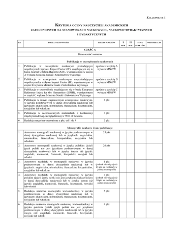 ZAŁĄCZNIK NR 1 KRYTERIA OCENY NAUCZYCIELI AKADEMICKICH ZATRUDNIONYCH NA STANOWISKACH NAUKOWYCH, NAUKOWO-DYDAKTYCZNYCH I DYDAKTYCZNYCH LP. RODZAJ AKTYWNOŚCI LICZBA PUNKTÓW CZĘŚĆ A DZIAŁALNOŚĆ NAUKOWA Publikacje w czasopismach naukowych 1. Publikacja w czasopiśmie naukowym posiadającym współczynnik wpływu Impact Factor (IF), znajdującym się w bazie Journal Citation Reports (JCR), wymienionym w części A wykazu Ministra Nauki i Szkolnictwa Wyższego zgodnie z częścią A wykazu MNiSW 2. Publikacja w czasopiśmie naukowym nieposiadającym współczynnika wpływu Impact Factor (IF), wymienionym w części B wykazu Ministra Nauki i Szkolnictwa Wyższego zgodnie z częścią B wykazu MNiSW 3. Publikacja w czasopiśmie znajdującym się w bazie European Reference Index for the Humanities (ERIH), wymienionym w części C wykazu Ministra Nauki i Szkolnictwa Wyższego zgodnie z częścią C wykazu MNiSW 4. Publikacja w innym zagranicznym czasopiśmie naukowym, w języku podstawowym w danej dyscyplinie naukowej lub językach: angielskim, niemieckim, francuskim, hiszpańskim, rosyjskim lub włoskim 4 pkt 5. Publikacja w recenzowanych materiałach z konferencji międzynarodowej, uwzględnionej w Web of Science. 4 pkt 6. Redakcja naczelna czasopisma z pkt. od 1 do 4 3 pkt Monografie naukowe i inne publikacje 1. Autorstwo monografii naukowej w języku podstawowym w danej dyscyplinie naukowej lub w językach: angielskim, niemieckim, francuskim, hiszpańskim, rosyjskim lub włoskim 25 pkt 2. Autorstwo monografii naukowej w języku polskim (jeżeli język polski nie jest językiem podstawowym w danej dyscyplinie naukowej) lub w języku innym niż języki: angielski, niemiecki, francuski, hiszpański, rosyjski lub włoski 20 pkt 3. Autorstwo rozdziału w monografii naukowej w języku podstawowym w danej dyscyplinie naukowej lub w językach: angielskim, niemieckim, francuskim, hiszpańskim, rosyjskim lub włoskim (jednak nie więcej niż 25 pkt za rozdziały w jednej monografii) Autorstwo rozdziału w monografii naukowej w języku polskim (jeżeli język polski nie jest językiem podstawowym w danej dyscyplinie naukowej) lub w języku innym niż języki: angielski, niemiecki, francuski, hiszpański, rosyjski lub włoski (jednak nie więcej niż 20 pkt za rozdziały w jednej monografii) 4. 5 pkt 4 pkt 5. Redakcja naukowa monografii wieloautorskiej w języku podstawowym w danej dyscyplinie naukowej lub w językach: angielskim, niemieckim, francuskim, hiszpańskim, rosyjskim lub włoskim 5 pkt 6. Redakcja naukowa monografii naukowej wieloautorskiej w języku polskim (jeżeli język polski nie jest językiem podstawowym w danej dyscyplinie naukowej) lub w języku innym niż: angielski, niemiecki, francuski, hiszpański, rosyjski lub włoski 4 pkt I II SUMA ROK ROK PUNKTÓW WERYFIKACJA LP. RODZAJ AKTYWNOŚCI LICZBA PUNKTÓW Osiągnięcia artystyczne 1. 12 pkt Autorstwo utworu muzycznego na dużą obsadę wykonawczą (orkiestra symfoniczna, chór), autorska realizacja i (działalność w Polsce) upublicznienie dzieła plastycznego (monumentalne realizacje 25 pkt w przestrzeni publicznej, realizacje multimedialne, cykle prac (działalność za granicą) malarskich, rzeźbiarskich), dzieło konserwatorskie wraz z dokumentacją, projekt konserwatorski, reżyseria lub zdjęcia do filmu pełnometrażowego, reżyseria premierowego spektaklu teatralnego, autorstwo scenariusza, autorstwo scenografii 2. 6 pkt Autorstwo utworu muzycznego na mniejszą obsadę wykonawczą (kameralny, solowy, realizowany środkami (działalność w Polsce) elektronicznymi), autorstwo mniejszych dzieł plastycznych i 12 pkt prac konserwatorskich, konserwacja i rekonstrukcja (działalność za granicą) zabytkowego instrumentu muzycznego, reżyseria lub zdjęcia do filmu krótkometrażowego lub dokumentalnego 3. 10 pkt Prawykonanie utworu muzycznego (dyrygent lub solista koncertu symfonicznego, spektaklu operowego lub (działalność w Polsce) baletowego - bez uwzględnienia partii solowych 20 pkt wykonywanych przez członków orkiestry), pierwszoplanowa (działalność za granicą) rola w filmie lub premierowym spektaklu, indywidualna, premierowa wystawa plastyczna 4. Prawykonanie utworu muzycznego (dyrygent lub solista koncertu kameralnego, kameralista), drugoplanowa rola w filmie lub premierowym przedstawieniu teatralnym 5. Recital muzyczny, dyrygowanie koncertem symfonicznym, spektaklem operowym lub baletowym 5 pkt (działalność w Polsce) 10 pkt (działalność za granicą) 5 pkt (działalność w Polsce) 10 pkt (działalność za granicą) 6. 2 pkt Udział w koncercie kameralnym (dyrygent, kameralista), udział w zbiorowej wystawie plastycznej, udział w realizacji (działalność w Polsce) dzieła konserwatorskiego, realizacja nagrania, rekonstrukcja 4 pkt filmu lub nagrania dźwiękowego, realizacja imprezy (działalność za granicą) artystycznej (reżyseria, muzyka, oprawa plastyczna, reżyseria światła i dźwięku) Patenty i prawa ochronne 1. Patent na wynalazek udzielony przez Urząd Patentowy Rzeczypospolitej Polskiej lub udzielony za granicą 25 pkt (za wdrożenie wynalazku dodatkowo 25 pkt) 2. Prawa ochronne na wzór użytkowy lub znak towarowy, 10 pkt prawa z rejestracji wzoru przemysłowego lub topografii (za zastosowanie wzoru dodatkowo 10 pkt) układu scalonego, udzielone przez Urząd Patentowy Rzeczypospolitej Polskiej lub udzielone za granicą 3. Zgłoszenie wynalazku poprzez KUL, przeniesienie prawa do patentu na rzecz innego podmiotu 5 pkt Prace naukowo-badawcze 1. Granty uzyskane w krajowych postępowaniach kierownik – 20 pkt konkursowych (NCN, NCBiR, MNiSW, FNP) wykonawca – 10 pkt (za uzyskanie grantu o wartości: większej niż 100.000 zł -premia 50% punktów większej niż 200.000 zł -premia 100% punktów) I II SUMA ROK ROK PUNKTÓW WERYFIKACJA LP. 2. RODZAJ AKTYWNOŚCI LICZBA PUNKTÓW Granty uzyskane w pozostałych krajowych postępowaniach konkursowych I II SUMA ROK ROK PUNKTÓW kierownik