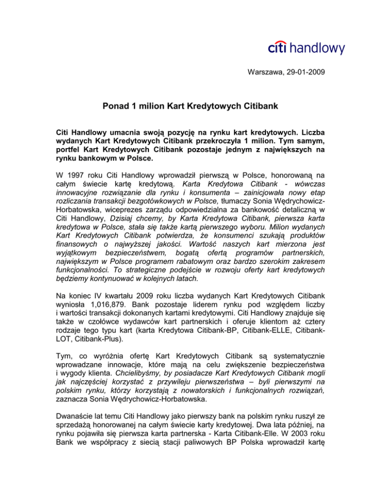 Warszawa, 29-01-2009 Ponad 1 milion Kart Kredytowych Citibank Citi Handlowy umacnia swoją pozycję na rynku kart kredytowych. Liczba wydanych Kart Kredytowych Citibank przekroczyła 1 milion. Tym samym, portfel Kart Kredytowych Citibank pozostaje jednym z największych na rynku bankowym w Polsce. W 1997 roku Citi Handlowy wprowadził pierwszą w Polsce, honorowaną na całym świecie kartę kredytową. Karta Kredytowa Citibank - wówczas innowacyjne rozwiązanie dla rynku i konsumenta – zainicjowała nowy etap rozliczania transakcji bezgotówkowych w Polsce, tłumaczy Sonia WędrychowiczHorbatowska, wiceprezes zarządu odpowiedzialna za bankowość detaliczną w Citi Handlowy, Dzisiaj chcemy, by Karta Kredytowa Citibank, pierwsza karta kredytowa w Polsce, stała się także kartą pierwszego wyboru. Milion wydanych Kart Kredytowych Citibank potwierdza, że konsumenci szukają produktów finansowych o najwyższej jakości. Wartość naszych kart mierzona jest wyjątkowym bezpieczeństwem, bogatą ofertą programów partnerskich, największym w Polsce programem rabatowym oraz bardzo szerokim zakresem funkcjonalności. To strategiczne podejście w rozwoju oferty kart kredytowych będziemy kontynuować w kolejnych latach. Na koniec IV kwartału 2009 roku liczba wydanych Kart Kredytowych Citibank wyniosła 1,016,879. Bank pozostaje liderem rynku pod względem liczby i wartości transakcji dokonanych kartami kredytowymi. Citi Handlowy znajduje się także w czołówce wydawców kart partnerskich i oferuje klientom aż cztery rodzaje tego typu kart (karta Kredytowa Citibank-BP, Citibank-ELLE, CitibankLOT, Citibank-Plus). Tym, co wyróżnia ofertę Kart Kredytowych Citibank są systematycznie wprowadzane innowacje, które mają na celu zwiększenie bezpieczeństwa i wygody klienta. Chcielibyśmy, by posiadacze Kart Kredytowych Citibank mogli jak najczęściej korzystać z przywileju pierwszeństwa – byli pierwszymi na polskim rynku, którzy korzystają z nowatorskich i funkcjonalnych rozwiązań, zaznacza Sonia Wędrychowicz-Horbatowska. Dwanaście lat temu Citi Handlowy jako pierwszy bank na polskim rynku ruszył ze sprzedażą honorowanej na całym świecie karty kredytowej. Dwa lata później, na rynku pojawiła się pierwsza karta partnerska - Karta Citibank-Elle. W 2003 roku Bank we współpracy z siecią stacji paliwowych BP Polska wprowadził kartę Citibank-BP. Dzisiaj program Citibank-BP pozostaje największym programem partnerskim kart kredytowych w Polsce. Sukcesem okazał się także Program Rabatowy Kart Kredytowych Citibank. Ponad 3200 punktów usługowo-handlowych oferujących rabaty dla posiadaczy Kart Kredytowych Citibank, sprawia, że oferta kart w Citi Handlowy pozostaje jedną z najbardziej atrakcyjnych na rynku. Dodatkowo, bank uruchomił innowacyjną usługę SMS-owej lokalizacji partnerów Programu Rabatowego dla posiadaczy Kart Kredytowych Citibank. Dzięki tej usłudze, klienci Banku wysyłając SMS-a na numer 70233, mogą szybko i wygodnie sprawdzić adresy najbliższych punktów usługowo-handlowych, w których płacąc Karta Kredytową Citibank otrzymają atrakcyjne rabaty. Bank jako jeden z pierwszych zaproponował też posiadaczom Karty Kredytowej Citibank możliwość dogodnego rozkładania na raty wydatków dokonanych kartą. Co więcej, posiadacze Kart Kredytowych Citibank, jako pierwsi na polskim rynku, od kilku już miesięcy mogą samodzielnie rozkładać na raty płatności w sklepach internetowych obsługiwanych przez eCard. Posiadacze Karty Kredytowej Citibank mogą także przy wykorzystaniu telefonu komórkowego na bieżąco kontrolować swoje finanse. Powiadomienia CitiAlerts wysyłane w formie komunikatu SMS na telefon komórkowy klienta mogą dotyczyć m.in. salda zadłużenia na karcie kredytowej, terminu spłaty zadłużenia lub transakcji dokonanych kartą. Dla zwiększenia bezpieczeństwa finansów posiadaczy Kart Kredytowych Citibank, Bank oferuje możliwość umieszczenia zdjęcia i podpisu na awersie karty. W przypadku tak zabezpieczonej karty kredytowej, Citi Handlowy przejmuje odpowiedzialność za transakcje bez użycia PIN dokonane bez wiedzy i zgody posiadacza karty na 72 godziny przed zgłoszeniem przez klienta zginięcia czy kradzieży karty. Dodatkowo, Citi Handlowy chroni finanse klienta poprzez system wczesnego ostrzegania. Bank monitoruje na bieżąco transakcje realizowane kartami kredytowymi i w przypadku tych, które wydają się nietypowe – natychmiast reaguje. Doradca CitiPhone kontaktuje się wtedy z posiadaczem karty, by potwierdzić poprawność transakcji. Szczegółowe informacje na temat oferty Kart Kredytowych Citibank oraz opisywanych usług dodatkowych można uzyskać na stronie www.onlinecitibank.pl lub dzwoniąc na numer dzwoniąc na: 0 801 66 66 66 lub (22) 692 2082 ### Dodatkowych informacji udziela: Paweł Zegarłowicz, Dyrektor Biura Prasowego, tel. (0-22) 657 72 97 E-mail: [email protected] Dorota Szostek-Rustecka, tel (0-22) 22 690 1049, E-mail:[email protected] Bank Handlowy w Warszawie S. A. to jedna z największych instytucji finansowych w Polsce, oferująca pod marką Citi Handlowy bogaty i nowoczesny asortyment produktów i usług bankowości korporacyjnej, inwestycyjnej i detalicznej. Bank obsługuje 20 tys. klientów korporacyjnych i 800 tys. klientów indywidualnych poprzez nowoczesne kanały dystrybucji oraz sieć ponad 200 oddziałów. W skład grupy kapitałowej Banku wchodzą takie podmioty jak: Dom Maklerski Banku Handlowego i Handlowy Leasing. Przynależność do Citi, jednej z największych instytucji finansowej na świecie, zapewnia klientom Citi Handlowy dostęp do usług finansowych w ponad 100 krajach. Dodatkowe informacje można uzyskać na stronie internetowej www.citihandlowy.pl. Citi (NYSE:C) to wiodąca globalna firma świadcząca usługi finansowe. Obsługuje około 200 milionów klientów indywidualnych, korporacyjnych, rządowych i instytucjonalnych w ponad 100 krajach. Zapewnia b