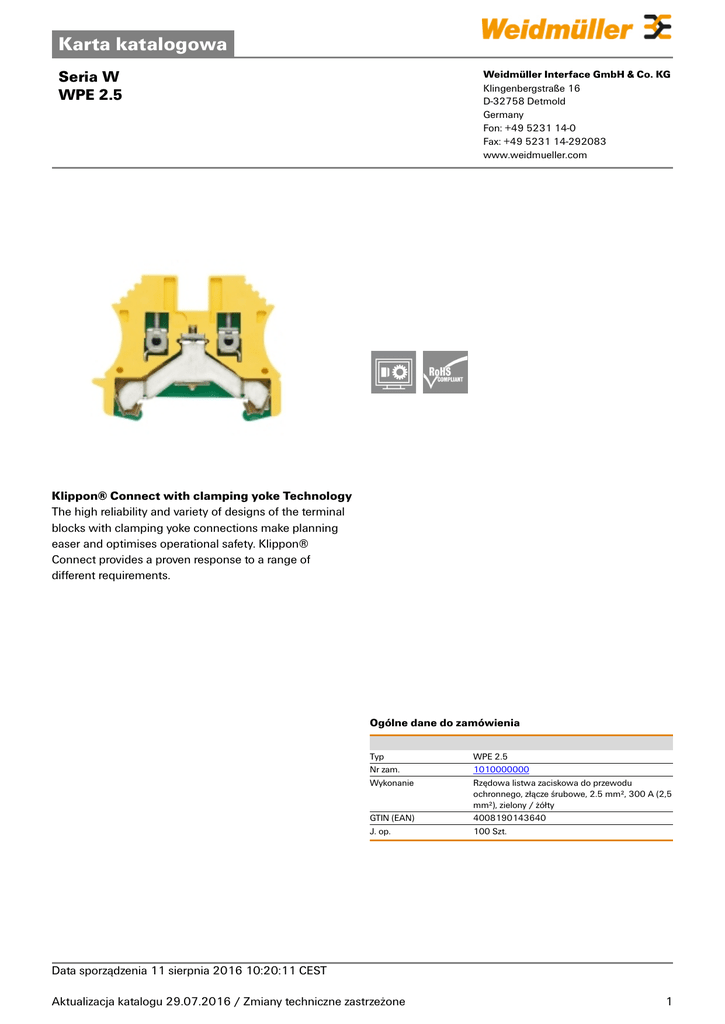 Karta katalogowa Seria W WPE 2.5 Weidmüller Interface GmbH & Co. KG Klingenbergstraße 16 D-32758 Detmold Germany Fon: +49 5231 14-0 Fax: +49 5231 14-292083 www.weidmueller.com Klippon® Connect with clamping yoke Technology The high reliability and variety of designs of the terminal blocks with clamping yoke connections make planning easer and optimises operational safety. Klippon® Connect provides a proven response to a range of different requirements. Ogólne dane do zamówienia Typ Nr zam. Wykonanie GTIN (EAN) J. op. WPE 2.5 1010000000 Rzędowa listwa zaciskowa do przewodu ochronnego, złącze śrubowe, 2.5 mm², 300 A (2,5 mm²), zielony / żółty 4008190143640 100 Szt. Data sporządzenia 11 sierpnia 2016 10:20:11 CEST Aktualizacja katalogu 29.07.2016 / Zmiany techniczne zastrzeżone 1 Karta katalogowa Seria W WPE 2.5 Weidmüller Interface GmbH & Co. KG Klingenbergstraße 16 D-32758 Detmold Germany Fon: +49 5231 14-0 Fax: +49 5231 14-292083 www.weidmueller.com Dane techniczne Wymiary i ciężary Szerokość Wysokość Głębokość Głębokość wraz z szyną DIN Waga netto Szerokość (cale) Wysokość (cale) Głębokość (cale) Ciężar długotrwała temperatura użytkowa, maks. KEMA98ATEX1683U 2.5 mm² Zakres temperatury stosowania, patrz Opis kontroli prototypu WE/ IECEx-Certificate of Conformity Nr certyfikatu (IECEX) Maks. przekrój przewodu (IECEX) IECEXULD14.0005U 2.5 mm² 300 A (2,5 mm²) Śruba środkowa przy zaciskach PE Funkcja PEN M 2,5 Wskazówka montażowa otwarte strony wersja przetestowana pod kątem eksplozji przykręcany z prawej strony Kolor zielony / żółty napięcie znamionowe do złącza sąsiedniego Rezystancja objętościowa wg IEC 60947-7-x Stopień zanieczyszczenia Min. przekrój przewodu (CSA) 5,1 mm 60 mm 46,5 mm 47 mm 16,22 g 0,201 inch 2,362 inch 1,831 inch 18,86 g Temperatury długotrwała temperatura użytkowa, min. -50 °C 120 °C Dane znamionowe IECEx/ATEX nr certyfikatu (ATEX) Maks. przekrój przewodu (ATEX) Zakres temperatury stosowania Dane pomiarowe PE Krótkotrwały prąd pomiarowy Zakres momentu dokręcającego śruby mocującej 0,4...0,8 Nm Nie dalsze dane techniczne Mocowanie liczba identycznych złączy rodzaj montażu przykręcane 1 przykręcany Tak dane tworzywa tworzywo Klasa palności wg UL 94 Wemid V-0 dane znamionowe Przekrój pomiarowy Normy znamionowe napięcie udarowe do złącza sąsiedniego 2,5 mm² IEC 60947-7-2 8 kV 800 V 1,33 mΩ 3 dane znamionowe wg CSA Maks. przekrój przewodu (CSA) Nr certyfikatu (CSA) 12 AWG 200039-1888378 26 AWG Data sporządzenia 11 sierpnia 2016 10:20:11 CEST Aktualizacja katalogu 29.07.2016 / Zmiany techniczne zastrzeżone 2 Karta katalogowa Seria W WPE 2.5 Weidmüller Interface GmbH & Co. KG Klingenbergstraße 16 D-32758 Detmold Germany Fon: +49 5231 14-0 Fax: +49 5231 14-292083 www.weidmueller.com Dane techniczne dane znamionowe wg UL Nr certyfikatu (UR) E60693 Wielkość przewodu Factory wiring min (UR) 26 AWG Wielkość przewodu Field wiring min (UR) 22 AWG Wielkość przewodu Factory wiring max (UR) 12 AWG Wielkość przewodu Field wiring max (UR) 12 AWG niezbędna płyta zamykająca liczba poziomów Liczba potencjałów w rzędzie Przyłącze PE Funkcja N Funkcja PEN Moment obrotowy dociągający, maks. 0,6 Nm Przekrój przyłącza przewodu, drobny drut AEH 8mm z kołnierzem z tworzywa sztucznego DIN 46228/4, przyłącze pomiarowe, maks. 2,5 mm² Przekrój przyłącza przewodu, wielodrutowy, przyłącze pomiarowe, max. 4 mm² Przekrój przyłącza przewodu, z cienkiego drutu, maks. 4 mm² Przekrój przyłącza przewodów, przewód jednodrutowy, min. znamionowy przekrój 0,5 mm² Strefa zacisku, przyłącze znamionowe, min. 0,05 mm² Zakres przyłączeniowy, przyłącze znamionowe, max. 4 mm² liczba przyłączeń 2 przekrój przyłącza przewodu, cienkodrutowe z AEH DIN 46228/1, złącze wymiarowane, maks. 2,5 mm² przekrój przyłącza przewodu, jednodrutowe maks. złącze wymiarowane 4 mm² sprawdzian trzpieniowy wg 60 947-1 A3 śruba dociskowa M 2,5 parametry systemu Wykonanie Liczba potencjałów liczba zacisków na poziom poziomy wewnętrznie zmostkowane Szyna nośna Funkcja PE Złącze śrubowe, Z przyłączem PE, wolne z jednej strony 1 2 Nie TS 35 Tak Tak 1 1 Tak Nie Nie przewody zaciskane (złącze wymiarowane) Długość odizolowania Moment obrotowy dociągający, min. 10 mm 0,4 Nm Przekrój przyłącza przewodu, drobny drut AEH 8mm z kołnierzem z tworzywa sztucznego DIN 46228/4, przyłącze pomiarowe, min. 0,5 mm² Przekrój przyłącza przewodu, wielodrutowy, przyłącze pomiarowe, min. 1,5 mm² Przekrój przyłącza przewodu, z cienkiego drutu, min. 0,5 mm² Rodzaj przyłącza złącze śrubowe Wielkość ostrza 0,6 x 3,5 mm kierunek podłączenia u góry przekrój przyłącza przewodu AWG, min. AWG 30 przekrój przyłącza przewodu, cienkodrutowe z AEH DIN 46228/1, złącze wymiarowane, min. 0,5 mm² przekrój przyłączeniowy przewodu AWG, maks. AWG 12 stopień momentu obrotowego z wkrętakiem elektrycznym Typ DMS 1 wymiary przesunięcie TS 35 32 mm Data sporządzenia 11 sierpnia 2016 10:20:11 CEST Aktualizacja katalogu 29.07.2016 / Zmiany techniczne zastrzeżone 3 Karta katalogowa Seria W WPE 2.5 Weidmüller Interface GmbH & Co. KG Klingenbergstraße 16 D-32758 Detmold Germany Fon: +49 5231 14-0 Fax: +49 5231 14-292083 www.weidmueller.com Dane techniczne Klasyfikacje ETIM 3.0 ETIM 5.0 UNSPSC eClass 6.2 eClass 8.1 eClass 9.1 EC000901 EC000491 30-21-18-11 27-14-03-05 27-14-11-41 27-14-11-41 ETIM 4.0 ETIM 6.0 eClass 5.1 eClass 7.1 eClass 9.0 EC000491 EC000901 27-14-03-05 27-14-03-05 27-14-11-41 certyfikaty Dopuszczenia ROHS Zgodny Pobieranie Deklaracja zgodności Engineering data Instrukcje obsługi Deklaracja zgodno?ci CFAT_WPE 2,5.pdf EPLAN, Zuken E3.S NTI_IECEx_WDU-WPE 2.5.pdf DE_PT1002_20160414_252_ISSUE01.pdf Data sporządzenia 11 sierpnia 2016 10:20:11 CEST Aktualizacja katalogu 29.07.2016 / Zmiany techniczne zastrzeżone 4 Addresses worldwide Let’s connect. AE United