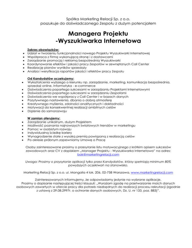 Spółka Marketing Relacji Sp. z o.o. poszukuje do doświadczonego Zespołu z dużym potencjałem Managera Projektu -Wyszukiwarka Internetowa Zakres obowiązków: Udział w tworzeniu funkcjonalności nowego Projektu Wyszukiwarki Internetowej Współpraca z Firmą wykonującą stronę i z dostawcami Zarządzanie promocją i reklamą bezpośrednią Wyszukiwarki Koordynowanie efektów i jakości pracy Zespołów w zewnętrznych Call Center Realizację planów wyników sprzedaży Analiza i weryfikacja raportów jakości i efektów pracy Zespołu Od Kandydatów oczekujemy: Wykształcenia wyższego o kierunku np. zarządzanie, marketing, komunikacja bezpośrednia, sprzedaż online, Informatyka - e-commerce Doświadczenia popartego sukcesami w zarządzaniu Projektami Internetowymi Doświadczenia popartego sukcesami w zarządzaniu Zespołami Doświadczenia we współpracy z Call Center i w bazach danych Pozytywnego nastawienia, dbania o dobrą atmosferę Kreatywnego myślenia, zdolności analitycznych i dokładności Motywacji do konsekwentnej realizacji ambitnych celów Dążenie do samorozwoju W zamian oferujemy: Zarządzanie unikalnym, dużym Projektem Możliwość poznania najnowszych światowych trendów w marketingu Pomoc w osobistym rozwoju Indywidualną ścieżkę kariery Wynagrodzenie stałe z wysoką premią powiązaną z realizacją celów Po okresie próbnym zapewniamy Umowę o Pracę Osoby zainteresowane prosimy o przesyłanie listu motywacyjnego z krótkim opisem sukcesów zawodowych oraz CV z dopiskiem „Manager Projektu - Wyszukiwarka Internetowa” na adres: [email protected] Uwaga: Prosimy o przysyłanie aplikacji tylko przez Kandydatów, którzy spełniają minimum 80% powyższych oczekiwań na stanowisko. Marketing Relacji Sp. z o.o. ul. Mangalia 4 lok. 206, 02-758 Warszawa, www.marketingrelacji.com Zainteresowanych informujemy, że odpowiadamy jedynie na wybrane aplikacje. Prosimy o dopisanie następującej treści klauzuli: „Wyrażam zgodę na przetwarzanie moich danych osobowych zawartych w ofercie pracy dla potrzeb niezbędnych do realizacji procesu rekrutacji (zgodnie z ustawą z 29.08.2997r. o ochronie danych osobowych, Dz. U. nr 133, poz. 883)”.