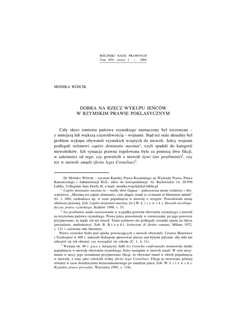 ROCZNIKI NAUK PRAWNYCH Tom XIV, zeszyt 1 − 2004 MONIKA WÓJCIK DOBRA NA RZECZ WYKUPU JEŃCÓW W RZYMSKIM PRAWIE POKLASYCZNYM Cały okres istnienia państwa rzymskiego naznaczony był toczonymi – z mniejsza˛ lub wie˛ksza˛ cze˛stotliwościa˛ – wojnami. Stad ˛ też stale aktualny był problem wykupu obywateli rzymskich wzie˛tych do niewoli. Jeńcy wojenni podlegali reżimowi capitis deminutio maxima1, czyli spadali do kategorii niewolników. Ich sytuacja prawna regulowana była za pomoca˛ dwu fikcji, w zależności od tego, czy powrócili z niewoli żywi (ius postliminii)2, czy też w niewoli zmarli (fictio legis Corneliae)3. Dr MONIKA WÓJCIK – asystent Katedry Prawa Rzymskiego na Wydziale Prawa, Prawa Kanonicznego i Administracji KUL; adres do korespondencji: Al. Racławickie 14, 20-950 Lublin, Collegium Jana Pawła II; e-mail: [email protected] 1 Capitis deminutio maxima to – wedle słów Gajusa – jednoczesna utrata wolności i obywatelstwa: „Maxima est capitis deminutio, cum aliquis simul et civitatem et libertatem amittit” (G. 1, 160), zachodzaca np. w razie popadnie˛cia w niewole˛ u wrogów. Powodowała utrate˛ zdolności prawnej. Zob. Capitis deminutio maxima, [w:] W. L i t e w s k i, Słownik encyklopedyczny prawa rzymskiego, Kraków 1998, s. 33. 2 Ius postliminii miało zastosowanie w wypadku powrotu obywatela rzymskiego z niewoli na terytorium państwa rzymskiego. Prawa jeńca pozostawały w zawieszeniu; po jego powrocie przyjmowano, że nigdy ich nie utracił. Temu reżimowi nie podlegały stosunki oparte na fakcie (posiadanie, małżeństwo). Zob. B. B i o n d i, Istituzioni di diritto romano, Milano 1972, s. 121 i cytowana tam literatura. Prawo cesarskie brało pod opieke˛ powracajacych ˛ z niewoli obywateli. Cesarze Honoriusz i Teodozjusz w 409 r. nakazali biskupom sprawować piecze˛ nad byłymi jeńcami, aby nikt nie odważył sie˛ ich obrażać czy wyrzadzić ˛ im szkode˛ (C. 1, 4, 11). 3 Wydana ok. 80 r. p.n.e z inicjatywy Sulli lex Cornelia confirmandis normowała skutki popadnie˛cia w niewole˛ obywatela rzymskiego, który naste˛pnie w niewoli zmarł. W celu utrzymania w mocy jego testamentu przyjmowano fikcje˛, że obywatel zmarł w chwili popadnie˛cia w niewole˛, a wie˛c jako człowiek wolny (fictio legis Corneliae). Fikcje˛ te˛ stosowano później również w razie dziedziczenia beztestamentowego po zmarłym jeńcu. Zob. W. L i t e w s k i, Rzymskie prawo prywatne, Warszawa 1995, s. 116). 156 MONIKA WÓJCIK I W czasach republiki wykup jeńców leżał w kompetencji państwa rzymskiego i był w zasadzie kwestia˛ polityczna. ˛ Senat nie zawsze decydował sie˛ na wszcze˛cie procedury wykupu, mimo istnienia takiej oferty po stronie państwa, które wzie˛ło Rzymian do niewoli4. W sytuacji, kiedy jeniec został wykupiony przez osobe˛ prywatna, ˛ powstawało zasadnicze pytanie co do jego statusu: czy korzysta natychmiast z dobrodziejstwa postliminium, czy dopiero po zwrocie sumy wykupu. Teksty źródłowe nie sa˛ w tej materii jednoznaczne5. Wydaje sie˛ jednak, że nie można uznać, iż redemptus stawał sie˛ niewolnikiem wykupujacego. ˛ Prawnicy rzymscy nie posune˛li sie˛ aż tak daleko w pogarszaniu sytuacji wykupionego. Z drugiej strony wykupieni nie korzystali z pełnej wolności, gdyż pozostawali w pewnej zależności od wykupujacego ˛ do czasu spłaty sumy wykupu. Słuszna wydaje sie˛ koncepcja uznajaca, ˛ że redempti byli w pozycji osób półwolnych; ich sytuacja była faktycznie podobna do położenia niewolników, ale nie zostali prawnie z nimi zrównani. Niektórzy autorzy uważaja, ˛ że wykupieni pozostawali w kategorii niewolników (byli własnościa˛ wykupujacego) ˛ do czasu zwrotu zapłaconych pienie˛dzy. Sytuacja zaostrzyła sie˛ zwłaszcza w III wieku, kiedy to, wobec prowadzenia wielu wojen, wielce pożadanym ˛ zjawiskiem był masowy wykup jeńców, dlatego też ustawodawstwo cesarskie szło w kierunku tworzenia mechanizmów zache˛cajacych ˛ do wykupu, co pociagało ˛ za soba˛ konieczność pogarszania sytuacji wykupionych6. 4 Zob. E. L e v y, Captivus redemptus, „Bulletino dell’Istituto di diritto romano”, 55-56 (1951), s. 71 n. W prawie justyniańskim znajduja˛ sie˛ nakazy dotyczace ˛ wykupu jeńców, skierowane np. do dzieci, które maja˛ obowiazek ˛ wykupienia swoich rodziców. W razie niedopełnienia obowiazku, ˛ jeżeli rodzice umra˛ w niewoli, dzieci be˛da˛ odsunie˛te od dziedziczenia, a majatek ˛ przypadnie Kościołowi, z obowiazkiem ˛ przeznaczenia dóbr na wykup jeńców (Nov. 115, 3, 13). 5 Statusu wykupionych z niewoli dotycza˛ m.in.: C. 8, 50, 12 – konstytucja dzieli wykupionych na „commercio redempti” oraz takich, którzy zostali „virtute militum nostrorum liberati”. Tylko ci drudzy powracaja˛ automatycznie do swojej pozycji sprzed niewoli; niewyjaśniona pozostaje sytuacja osób, które zostały uwolnione w wyniku zapłacenia okupu przez osobe˛ prywatna. ˛ Const. Sirm. 16 – osoba wykupiona może otrzymać wolność albo po spłacie sumy wykupu, albo po pie˛ciu latach pracy u wykupujacego. ˛ D. 49, 15, 16 i P. Sent. 2, 25, 1 – powracajacy ˛ z niewoli odzyskuje swoje prawa. 6 E. Levy (Captivus redemptus, s. 71 n.) uważa, że do III wieku nie można znaleźć przekonujacych ˛ dowodów na to, iż wykupiony jeniec był traktowany jako niewolnik; stało sie˛ tak dopiero w późnym prawie klasycznym. Zdaniem L. Amirante (Appunti per la storia della DOBRA NA RZECZ WYKUPU JEŃCÓW 157 Prawo klasyczne nie zajmowało sie˛ filozoficznym czy religijnym uzasadnieniem konieczności wykupu jeńców, regulowało jedynie kwestie˛ położenia prawnego wykupionych oraz uprawnień wykupujacego. ˛ Natomiast Kościół szybko podniósł problem wykupywania jeńców. Już z III wieku pochodza˛ przekazy dotyczace ˛ działań duchownych w tym zakresie, a nasilaja˛ sie˛ i staja˛ sie˛ obfitsze w naste˛pnych wiekach7. Wiktor z Wity podaje, że w cza