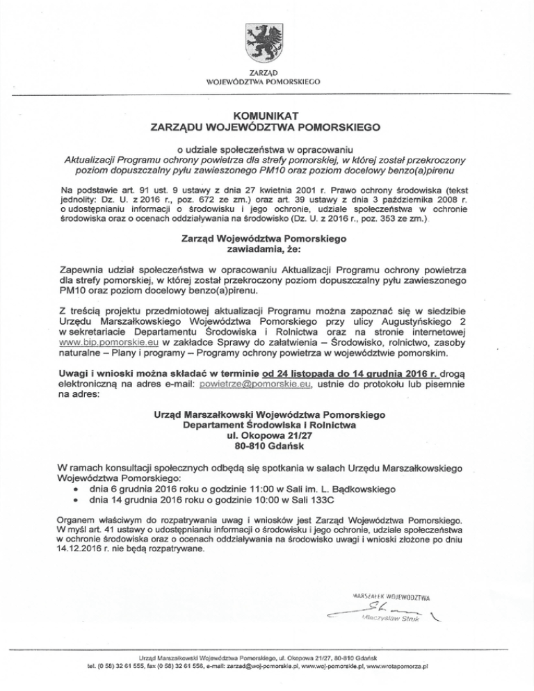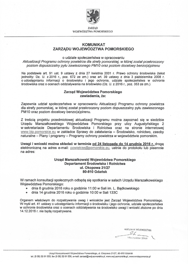 ZARZĄD WOJEWÓDZlWA POMORSKIEGO KOMUNIKAT ZARZĄDU WOJEWÓDZTWA POMORSKIEGO o udziale społeczeństwa w opracowaniu Aktualizacji Programu ochrony powietrza dla strefy pomorskiej, w której został przekroczony poziom dopuszczalny pyłu zawieszonego PM10 oraz poziom docelowy benzo(a)pirenu Na podstawie art. 91 ust. 9 ustawy z dnia 27 kwietnia 2001 r. Prawo ochrony środowiska (tekst jednolity: Dz. U. z 2016 r., poz. 672 ze zm.) oraz art. 39 ustawy z dnia 3 października 2008 r. o udostępnianiu informacji o środowisku i jego ochronie, udziale społeczeństwa w ochronie środowiska oraz o ocenach oddziaływania na środowisko (Dz. U. z 2016 r., poz. 353 ze zm.) Zarząd Województwa Pomorskiego zawiadamia, że: Zapewnia udział społeczeństwa w opracowaniu Aktualizacji Programu ochrony powietrza dla strefy pomorskiej, w której został przekroczony poziom dopuszczalny pyłu zawieszonego PM10 oraz poziom docelowy benzo(a)pirenu. Z treścią projektu przedmiotowej aktualizacji Programu można zapoznać się w siedzibie Urzędu Marszałkowskiego Województwa Pomorskiego przy ulicy Augustyńskiego 2 w sekretariacie Departamentu Środowiska i Rolnictwa oraz na stronie internetowej www.bip.pomorskie.eu w zakładce Sprawy do załatwienia - Środowisko, rolnictwo, zasoby naturalne - Plany i programy - Programy ochrony powietrza w województwie pomorskim. Uwagi i wnioski można składać w terminie od 24 listopada do 14 grudnia 2016 r. drogą elektroniczną na adres e-mail: [email protected], ustnie do protokołu lub pisemnie na adres: Urząd Marszałkowski Województwa Pomorskiego Departament Środowiska i Rolnictwa ul. Okopowa 21/27 80-810 Gdańsk W ramach konsultacji społecznych odbędą się spotkania w salach Urzędu Marszałkowskiego Województwa Pomorskiego: • dnia 6 grudnia 2016 roku o godzinie 11:00 w Sali im. L. Bądkowskiego • dnia 14 grudnia 2016 roku o godzinie 10:00 w Sali 133C Organem właściwym do rozpatrywania uwag i wniosków jest Zarząd Województwa Pomorskiego. W myśl art. 41 ustawy o udostępnianiu informacji o środowisku i jego ochronie, udziale społeczeństwa w ochronie środowiska oraz o ocenach oddziaływania na środowisko uwagi i wnioski złożone po dniu 14.12.2016 r. nie będą rozpatrywane. Urząd Marszałkowski Województwa Pomorskiego. ul. Okopowa 21/27. 80-810 Gdańsk leI. (O 58) 32 61 555. fax (O 58) 32 61 556. e-mail: [email protected]. www.woj-pomorskie.pl ••.••ww.wrotapomorza.pl