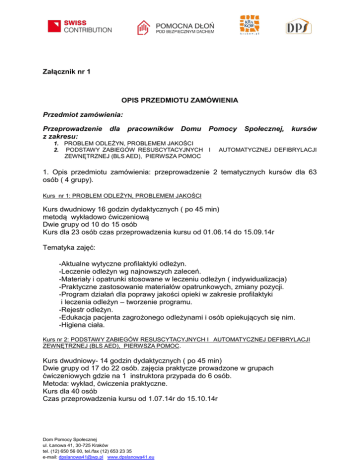 Załącznik nr 1 OPIS PRZEDMIOTU ZAMÓWIENIA Przedmiot zamówienia: Przeprowadzenie z zakresu: dla pracowników Domu Pomocy 1. PROBLEM ODLEŻYN, PROBLEMEM JAKOŚCI 2. PODSTAWY ZABIEGÓW RESUSCYTACYJNYCH I ZEWNĘTRZNEJ (BLS AED), PIERWSZA POMOC Społecznej, kursów AUTOMATYCZNEJ DEFIBRYLACJI 1. Opis przedmiotu zamówienia: przeprowadzenie 2 tematycznych kursów dla 63 osób ( 4 grupy). Kurs nr 1: PROBLEM ODLEŻYN, PROBLEMEM JAKOŚCI Kurs dwudniowy 16 godzin dydaktycznych ( po 45 min) metodą wykładowo ćwiczeniową Dwie grupy od 10 do 15 osób Kurs dla 23 osób czas przeprowadzenia kursu od 01.06.14 do 15.09.14r Tematyka zajęć: -Aktualne wytyczne profilaktyki odleżyn. -Leczenie odleżyn wg najnowszych zaleceń. -Materiały i opatrunki stosowane w leczeniu odleżyn ( indywidualizacja) -Praktyczne zastosowanie materiałów opatrunkowych, zmiany pozycji. -Program działań dla poprawy jakości opieki w zakresie profilaktyki i leczenia odleżyn – tworzenie programu. -Rejestr odleżyn. -Edukacja pacjenta zagrożonego odleżynami i osób opiekujących się nim. -Higiena ciała. Kurs nr 2: PODSTAWY ZABIEGÓW RESUSCYTACYJNYCH I AUTOMATYCZNEJ DEFIBRYLACJI ZEWNĘTRZNEJ (BLS AED), PIERWSZA POMOC. Kurs dwudniowy- 14 godzin dydaktycznych ( po 45 min) Dwie grupy od 17 do 22 osób. zajęcia praktycze prowadzone w grupach ćwiczeniowych gdzie na 1 instruktora przypada do 6 osób. Metoda: wykład, ćwiczenia praktyczne. Kurs dla 40 osób Czas przeprowadzenia kursu od 1.07.14r do 15.10.14r Dom Pomocy Społecznej ul. Łanowa 41, 30-725 Kraków tel. (12) 650 56 00, tel./fax (12) 653 23 35 e-mail: [email protected] www.dpslanowa41.eu Tematyka zajęć: – Podstawowe zabiegi resuscytacyjne (CPR) – Pozycja bezpieczna. – Bezpieczne użycie automatycznego defibrylatora zewnętrznego(AED)zgodnie z protokołem ERC. – Łańcuch przeżycia. – Przyczyny i mechanizmy nagłego zatrzymania krążenia u dorosłych. – Zasady prawidłowego nadania sygnału"na ratunek" i wzywania ambulansu. – Zasada bezpieczeństwa ratującego i ratowanego. – Ocena poszkodowanego. – Postępowanie z nieprzytomnym prawidłowo oddychającym.Metody bezprzyrządowego udrażniania dróg oddechowych, sztucznego oddychania i ucisków klatki piersiowej. – Sekwencja czynności resuscytacyjnych u dorosłych. – Ciało obce w drogach oddechowych u osoby dorosłej. – Przyczyny nagłego zatrzymania krążenia u dzieci i niemowląt -odmienność łańcucha ratowania życia. – Resuscytacja krążeniowo oddechowa dziecka. – Resuscytacja krążeniowo oddechowa niemowlęcia. – Nagłe zachorowania. – Zatrucia. – Wstrząs. – Wypadek komunikacyjny- zachowanie się w miejscu zdarzenia. – Urazy i obrażenia. – Działanie wysokiej i niskiej temperatury na organizm człowieka. – Podtopienie. – Porażenie prądem i piorunem. – Poród. – Półautomatyczna zewnętrzna defibrylacja. 2. Termin wykonania przedmiotu zamówienia: - od dnia podpisania umowy do 15.10.2014r.. 2.1. Zamawiający ustala następujące terminy realizacji szkoleń: Kurs nr 1 – od 01.06.2014r. do 15.09.2014r. Ilość godzin– 32 Kurs nr 2 – od 01.07.2014r. do 15.10.2014r. Ilość godzin - 28 3. Wykonawca zobowiązany jest do: 3.1 Zapewnienia dla potrzeb kursu przestronnej sali w obrębie miasta Krakowa, z dogodnym dojazdem, wyposażonej w sprzęt multimedialny, laptopa oraz flipcharta z pisakami, zapewnienie defibrylatora, manekinów, fantomów, zestawu do udzielenia pierwszej pomocy niezbędnych do prowadzenia kursu. 3.2 Oznakowania pomieszczeń, w których będą odbywać się kursy, materiałami promocyjnymi projektu pn. „Modernizacja DPS ul. Łanowa 41 – budynek 41b”, dostarczonymi uprzednio przez Zamawiającego. Dom Pomocy Społecznej ul. Łanowa 41, 30-725 Kraków tel. (12) 650 56 00, tel./fax (12) 653 23 35 e-mail: [email protected] www.dpslanowa41.eu 3.3 Przygotowania i wydania posiłków zgodnie z menu zatwierdzonym przez strony, obejmującym. a) 2 przerwy kawowe w każdym dniu kursu, obejmujące: kawę (także w wersji z mlekiem/śmietanką), herbatę, soki, napoje i drobne przekąski (np. ciasteczka, ciasto itp.) b) obiad w każdym dniu kursu składający się z przystawki lub zupy, drugiego dania, deseru, kompotu, czy innych napojów. 3.4 Zapewnienia obsługi korzystających z posiłków w trakcie trwania kursów. 3.5 Prowadzenia dokumentacji fotograficznej i raportów zawierających dane dot. przeprowadzonego kursu i przekazania jej Zamawiającemu. 3.6. Prowadzenia listy obecności, podpisywanych przez uczestników kursów na koniec każdych zajęć. 3.7.Przedkładania Zamawiającemu do akceptacji programów kursów na co najmniej 5 dni przed rozpoczęciem zajęć. 3.8.Przekazania Zamawiającemu materiałów dydaktycznych dot. każdego z opisanych w punkcie 1 kursów (z miejscem do notowania i długopisem) w wersji papierowej na co najmniej 2 dni przed rozpoczęciem zajęć w ilości odpowiadającej liczbie uczestników każdego kursu, oraz przesłania proponowanych materiałów w wersji elektronicznej na adres mailowy Zamawiającego na 5 dni przed rozpoczęciem zajęć. 3.9.Przeprowadzenia badania wiedzy uczestników na początku kursu i na końcu kursu celem wykazania wartości dodanej kursu, przy czym sposób badania wiedzy uczestników podlega akceptacji Zamawiającego najpóźniej na miesiąc przed planowanym terminem kursów; 3.10 Wykonawca zorganizuje i przeprowadzi egzamin końcowy, wyda uczestnikom zaświadczenie o ukończeniu kursu wg wzoru określonego w Rozporządzeniu Ministra Edukacji i Nauki z dnia 03.02.2006 r. w sprawie uzyskiwania i uzupełniania przez osoby dorosłe wiedzy ogólnej, umiejętności i kwalifikacji zawodowych w formach pozaszkolnych (Dz. U. Nr 31, poz. 216). 3.11.Przedłożenia Zamawiającemu „Raportu z przeprowadzonego kursu” do 7 dni od dnia zakończenia kursu, z tym, że akceptacja przez Zamawiającego jest podstawą do wystawienia faktury VAT z tytułu realizacji usługi; (zał. nr 6) 3.