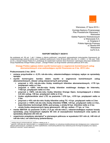 Warszawa, 27 lipca 2015 r. Komisja Nadzoru Finansowego Plac Powstańców Warszawy 1 Warszawa Giełda Papierów Wartościowych w Warszawie S.A. ul. Książęca 4 Polska Agencja Prasowa ul. Bracka 6/8 Warszawa CeTO S.A. RAPORT BIEŻĄCY 38/2015 Na podstawie art. 56 ust. 1 pkt 1 Ustawy o ofercie publicznej i warunkach wprowadzania instrumentów finansowych do zorganizowanego systemu obrotu oraz o spółkach publicznych z dnia 29 lipca 2005 roku (Dz. U. z 2005 r. nr 184, poz. 1539, ze zm.), Zarząd Orange Polska S.A. przekazuje do wiadomości wybrane dane finansowe i operacyjne dotyczące działalności Grupy Kapitałowej Orange Polska („Grupa”, „Orange Polska”) za drugi kwartał i pierwsze półrocze 2015 roku. Orange Polska ogłasza dobre wyniki komercyjne w segmencie komórkowych usług abonamentowych oraz zadowalające wyniki finansowe za 2 kw. 2015 roku Podsumowanie 2 kw. 2015: zmiana przychodów o -2,3% rok-do-roku, odzwierciedlająca mniejszy wpływ ze sprzedaży sprzętu wyniki komercyjne: bardzo dobre wyniki w segmencie komórkowych usług abonamentowych, obszar usług stacjonarnych pod presją przyrost o +6% rok-do-roku liczby mobilnych klientów abonamentowych, +170 tys. przyłączeń netto w 2 kw. przyrost o +29% rok-do-roku liczby klientów mobilnego dostępu do Internetu, +102 tys. przyłączeń netto w 2 kw. przyrost o +50% rok-do-roku liczby klientów Orange Open, korzystających z blisko 2,6 mln usług, +36 tys. przyłączeń netto w 2 kw. liczba użytkowników sieci LTE na poziomie 1 270 tys., +370 tys. przyłączeń netto w 2 kw. przyrost o +6% rok-do-roku liczby klientów usług TV, +5 tys. przyłączeń netto w 2 kw. przyrost o +100% rok-do-roku liczby klientów VHBB, +25 tys. przyłączeń netto w 2 kw., baza klientów technologii ADSL pod presją, z utratą 52 tys. klientów netto w 2 kw. utrata liczby stacjonarnych łączy głosowych: -88 tys. wobec -77 tys. w 1 kw. marża EBITDA na poziomie 31,8% (-1,9 pp rok-do-roku1), odzwierciedlająca wyższe koszty sprzedaży, przy korzystnym wpływie 85 mln zł oszczędności kosztowych oraz zysku ze sprzedaży aktywów (43 mln zł) organiczne przepływy pieniężne2 w pierwszym półroczu w wysokości 531 mln zł, +49 mln zł rok-do-roku; cel całoroczny potwierdzony 1 według danych porównywalnych, zgodnie z tabelą na str. 4 zgodnie z definicją celu całorocznego, tj. z uwzględnieniem nakładów na rozbudowę światłowodowej sieci dostępowej oraz z wyłączeniem zdarzeń jednorazowych: wydatków na nowe częstotliwości, ewentualnej płatności kary nałożonej przez Komisję Europejską oraz wpływu niektórych roszczeń i spraw sądowych 2 1 Kluczowe wskaźniki (w mln zł), MSSF 3 przychody Grupy 2 kw. 2015 2 kw. 2014 zmiana 1 poł. 2015 1 poł. 2014 zmiana 3 013 z wyłączeniem wpływu regulacji 3 084 3 -2,3% 5 943 6 064 -1,6% -2,0% -1,3% 3 959 1 040 -7,8% 1 919 1 987 -3,4% 3 31,8% 33,7% -1,9 pp 32,3% 32,8% -0,5 pp zysk netto 126 94 +34,0% 297 365 -18,6% organiczne przepływy pieniężne (zgodnie z definicją celu całorocznego) 379 325 +16,6% 531 482 +10,2% skorygowana EBITDA skorygowana EBITDA (jako % przychodów) Odnosząc się do wyników za 2 kw. 2015 roku, Bruno Duthoit, Prezes Zarządu, stwierdził: „Intensywne działania marketingowe w 2 kw. przełożyły się na znaczącą poprawę dynamiki działalności komercyjnej w segmencie mobilnych usług abonamentowych. Osiągnęliśmy wysoką liczbę przyłączeń netto we wszystkich grupach klientów: biznesowych, indywidualnych i telemetrii (M2M). Jednak w obszarze usług stacjonarnych utrzymywała się duża presja na usługi głosowe i dostępu do Internetu w technologii ADSL. Przeciwdziałając tej sytuacji, w uzupełnieniu podjętych wcześniej działań, zadecydowaliśmy o obniżeniu cen Neostrady na obszarach regulowanych. W efekcie, w całej Polsce obowiązują obecnie jednolite stawki na wszystkie dostępne prędkości tej usługi. Ponadto, w celu dodatkowego wsparcia oferty konwergentnej, po raz pierwszy wprowadziliśmy dedykowane plany mobilne dostępne tylko dla użytkowników usług stacjonarnych. Z uwagi na utrzymującą się dużą konkurencyjność rynku nasze plany na drugie półrocze obejmują kontynuację aktywnych działań marketingowych, w obszarze mobilnym i stacjonarnym. Zgodnie z naszymi założeniami, znacznie przyspieszy realizacja projektu budowy sieci światłowodowej. Potwierdzamy ogłoszone w lutym cele w zakresie liczby gospodarstw domowych w zasięgu tej sieci oraz wysokości nakładów inwestycyjnych. Jesteśmy przekonani, że długofalowo przełoży się to na znaczne zwiększenie przewagi konkurencyjnej Orange Polska.” Wyniki finansowe zmiana przychodów o -2,3% rok-do-roku (-1,6% rok-do-roku z wyłączeniem wpływu regulacji) Skonsolidowane przychody w 2 kw. wyniosły 3 013 mln zł i w ujęciu rocznym zmniejszyły się o 71 mln zł, tj. 2,3%. Wpływ decyzji regulacyjnych wyniósł 22 mln zł i był związany głównie z obniżkami stawek roamingowych w Unii Europejskiej. Z wyłączeniem wpływu regulacji, spadek przychodów wyniósł 49 mln zł, tj. 1,6% rok-do-roku, wobec 31 mln zł (1,0%) w poprzednim kwartale. To nieznaczne pogorszenie trendu wynikało z wolniejszego rok-do-roku wzrostu przychodów ze sprzedaży sprzętu, które w 2 kw. zwiększyły się o 39 mln zł wobec wzrostu o 95 mln zł w poprzednim kwartale. Czynnik ten został zrównoważony przez wzrost pozostałych przychodów o 62 mln zł rok-do-roku, wynikający ze wzrostu przychodów z usług ICT oraz realizacji infrastrukturalnych projektów sieci szerokopasmowych we współpracy z władzami samorządowymi. Całkowita liczba klientów mobilnych nie uległa znaczącej zmianie. Nastąpiła jednak istotna poprawa w segmencie mobilnych usług abonamentowych, w którym działania komercyjne w połączeniu z nowymi atrakcyjnymi planami taryfowymi przyczyniły się do osiągnięcia 170 tys. przyłączeń netto w 2 kw. Wzrost ten rozłożył się pomiędzy