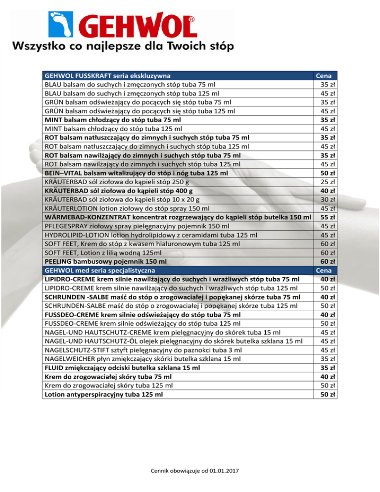 GEHWOL FUSSKRAFT seria ekskluzywna Cena BLAU balsam do suchych i zmęczonych stóp tuba 75 ml 35 zł BLAU balsam do suchych i zmęczonych stóp tuba 125 ml 45 zł GRÜN balsam odświeżający do pocących się stóp tuba 75 ml 35 zł GRÜN balsam odświeżający do pocących się stóp tuba 125 ml 45 zł MINT balsam chłodzący do stóp tuba 75 ml 35 zł MINT balsam chłodzący do stóp tuba 125 ml 45 zł ROT balsam natłuszczający do zimnych i suchych stóp tuba 75 ml 35 zł ROT balsam natłuszczający do zimnych i suchych stóp tuba 125 ml 45 zł ROT balsam nawilżający do zimnych i suchych stóp tuba 75 ml 35 zł ROT balsam nawilżający do zimnych i suchych stóp tuba 125 ml 45 zł BEIN–VITAL balsam witalizujący do stóp i nóg tuba 125 ml 50 zł KRÄUTERBAD sól ziołowa do kąpieli stóp 250 g 25 zł KRÄUTERBAD sól ziołowa do kąpieli stóp 400 g 40 zł KRÄUTERBAD sól ziołowa do kąpieli stóp 10 x 20 g 30 zł KRÄUTERLOTION lotion ziołowy do stóp spray 150 ml 45 zł WÄRMEBAD-KONZENTRAT koncentrat rozgrzewający do kąpieli stóp butelka 150 ml 55 zł PFLEGESPRAY ziołowy spray pielęgnacyjny pojemnik 150 ml 45 zł HYDROLIPID-LOTION lotion hydrolipidowy z ceramidami tuba 125 ml 45 zł SOFT FEET, Krem do stóp z kwasem hialuronowym tuba 125 ml 60 zł SOFT FEET, Lotion z lilią wodną 125ml 60 zł PEELING bambusowy pojemnik 150 ml 60 zł GEHWOL med seria specjalistyczna Cena LIPIDRO-CREME krem silnie nawilżający do suchych i wrażliwych stóp tuba 75 ml 40 zł LIPIDRO-CREME krem silnie nawilżający do suchych i wrażliwych stóp tuba 125 ml 50 zł SCHRUNDEN -SALBE maść do stóp o zrogowaciałej i popękanej skórze tuba 75 ml 40 zł SCHRUNDEN-SALBE maść do stóp o zrogowaciałej i popękanej skórze tuba 125 ml 50 zł FUSSDEO-CREME krem silnie odświeżający do stóp tuba 75 ml 40 zł FUSSDEO-CREME krem silnie odświeżający do stóp tuba 125 ml 50 zł NAGEL-UND HAUTSCHUTZ-CREME krem pielęgnacyjny do skórek tuba 15 ml 45 zł NAGEL-UND HAUTSCHUTZ-ÖL olejek pielęgnacyjny do skórek butelka szklana 15 ml 45 zł NAGELSCHUTZ-STIFT sztyft pielęgnacyjny do paznokci tuba 3 ml 45 zł NAGELWEICHER płyn zmiękczający skórki butelka szklana 15 ml 35 zł FLUID zmiękczający odciski butelka szklana 15 ml 35 zł Krem do zrogowaciałej skóry tuba 75 ml 40 zł Krem do zrogowaciałej skóry tuba 125 ml 50 zł Lotion antyperspiracyjny tuba 125 ml 50 zł Cennik obowiązuje od 01.01.2017 GEHWOL seria pielęgnacyjna BADESALZ sól do kąpieli stóp i ciała 10 x 25 g BALSAM Normale Haut balsam odświeżający do norm. skóry stóp 75 ml BALSAM Normal Haut balsam odświeżający do norm. skóry 125 ml BALSAM Trockene Sprode Haut balsam odświeżający do suchej skóry 75 ml BALSAM Trockene Sprode Haut balsam odświeżający do suchej skóry 125 ml SOFTENING BALSAM balsam zmiękczający 125ml BEIN-BALSAM balsam pielęgnacyjny do stóp i nóg tuba 125 ml FRISCHE-BALSAM odświeżający i chłodzący do stóp tuba 75 ml FUSSBAD sól ziołowa z lawendą do kąpieli stóp 250 g FUSSBAD sól ziołowa z lawendą do kąpieli stóp 400 g FUSSBAD sól ziołowa z lawendą do kąpieli stóp 10 x 20 g CREME-FUSSBAD płyn lawendowy do kąpieli stóp butelka 150 ml FUSSDEO tonik lawendowy do stóp spray 150 ml FUßSPRAY Pielęgnacyjny spray do stóp pojemnik 150 ml FUß + SCHUH DEO Dezodorant do stóp i butów pojemnik 150 ml Peeling z masy perłowej pojemnik 150 ml EXTRA krem tuba 75 ml FUSSKREM krem do stóp tuba 75 ml WÄRME BALSAM rozgrzewający tuba 75 ml HANDCREME krem do rąk tuba 75 ml Krem torfowo-witaminowy tuba 75 ml Krem aksamitna skóra do stóp tuba 75ml Limitowana edycja GEHWOL LIPIDRO-CREME krem silnie nawilżający do suchych i wrażliwych stóp 20 ml SCHRUNDEN-SALBE maść do stóp o zrogowaciałej i popękanej skórze 20 ml HORNHAUT-CREME krem do zrogowaciełej skóry 20ml FRISCHE-BALSAM odświeżający i chłodzący do stóp 20 ml WÄRME Balsam rozgrzewajacy 20ml SOFT FEET Krem do stóp z kwasem hialuronowym 20ml Krem aksamitna skóra do stóp tuba 20ml MOOR-VITAMIN-CREME Krem torfowo-witaminowy tuba 20 ml SOFTENING BALSAM, Balsam zmiękczający 20ml HANDCREME krem do rąk tuba 20 ml SOFT FEET Krem do stóp z kwasem hiaruronowym 40ml SOFT FEET Peeling 40ml Cennik obowiązuje od 01.01.2017 Cena 30 zł 35 zł 45 zł 35 zł 45 zł 60 zł 45 zł 35 zł 25 zł 30 zł 30 zł 35 zł 45 zł 45 zł 45 zł 65 zł 35 zł 35 zł 35 zł 40 zł 40 zł 40 zł Cena 10 zł 10 zł 10 zł 10 zł 10 zł 10 zł 10 zł 10 zł 10 zł 10 zł 40 zł 20 zł Produkty specjalistyczne - wrastające paznokcie Aplikator do opatrunków Octenisept Spray 50 ml Kompres włókninowy Produkty specjalistyczne - paznokcie Pilnik szklany do paznokci (szczególnie polecany dla diabetyków) Pilnik mineralny do paznokci Kopytko do osuwania oskórka Produkty specjalistyczne - zrogowacialy naskórek, modzele, odciski Tarka mineralna do zrogowaciałaego naskórka dwustronna Ortezy - modzele, ból przodostopia, ostroga piętowa, ból pięt Orteza odciążająca przodostopie 1 szt. Żelowa poduszka przeciwuciskowa do przodstopia 1 szt. Żelowa poduszka przeciwuciskowa do przodstopia mała 1 para Żelowa poduszka przeciwuciskowa do przodstopia duża 1 para Podpiętka - poduszka pod piętę mała 1 para Podpiętka - poduszkapod piętę średnia 1 para Ortezy - Hallux Opaska korekcyjna - leczenie Hallux valgus 1 szt. Opsaka Loryko - profilaktyka Hallux valgus 1 szt. Orteza ochronna na Hallux valgus 1 szt. Nastawiacz do palców stopy mały 1 szt. Nastawiacz do palców stopy średni 1 szt. Nastawiacz do palców stopy duży 1 szt. Poduszka na halluksy żelowa 2 szt. Poduszka przeciwuciskowa na Hallux valgus 1 szt. Ortezy - palce młoteczkowate Poduszka do palców młoteczkowych 1 para Poduszka do palców młoteczkowatych prawa 1 szt. Poduszka do palców młoteczkowatych lewa 1 szt. Ortezy - odciski i ochraniacze przeciwuciskowe Obrączka na odciski 1 szt. Obrączka ochronna do palców stopy mini 1 szt. Obrączka ochronna do