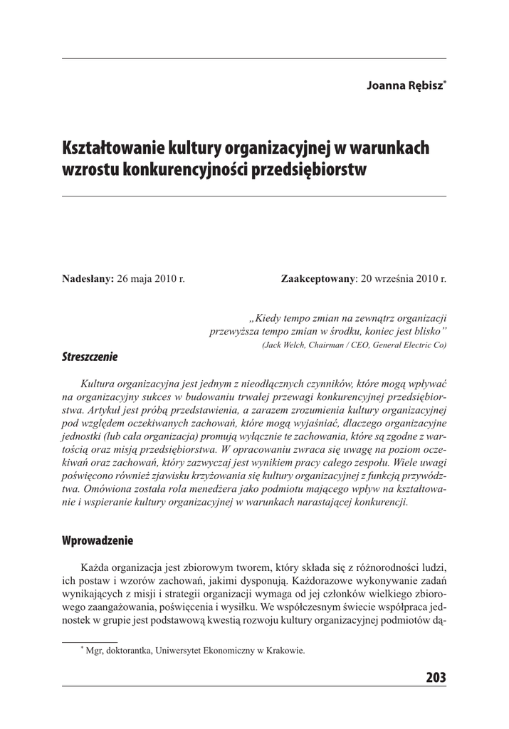 WS P Ó Ł C Z E S N A E K O N O M I A Nr 3/2010(15) Joanna Rębisz* Kształtowanie kultury organizacyjnej w warunkach wzrostu konkurencyjności przedsiębiorstw Nadesłany: 26 maja 2010 r. Zaakceptowany: 20 września 2010 r. „Kiedy tempo zmian na zewnątrz organizacji przewyższa tempo zmian w środku, koniec jest blisko” Streszczenie (Jack Welch, Chairman / CEO, General Electric Co) Kultura organizacyjna jest jednym z nieodłącznych czynników, które mogą wpływać na organizacyjny sukces w budowaniu trwałej przewagi konkurencyjnej przedsiębiorstwa. Artykuł jest próbą przedstawienia, a zarazem zrozumienia kultury organizacyjnej pod względem oczekiwanych zachowań, które mogą wyjaśniać, dlaczego organizacyjne jednostki (lub cała organizacja) promują wyłącznie te zachowania, które są zgodne z wartością oraz misją przedsiębiorstwa. W opracowaniu zwraca się uwagę na poziom oczekiwań oraz zachowań, który zazwyczaj jest wynikiem pracy całego zespołu. Wiele uwagi poświęcono również zjawisku krzyżowania się kultury organizacyjnej z funkcją przywództwa. Omówiona została rola menedżera jako podmiotu mającego wpływ na kształtowanie i wspieranie kultury organizacyjnej w warunkach narastającej konkurencji. Wprowadzenie Każda organizacja jest zbiorowym tworem, który składa się z różnorodności ludzi, ich postaw i wzorów zachowań, jakimi dysponują. Każdorazowe wykonywanie zadań wynikających z misji i strategii organizacji wymaga od jej członków wielkiego zbiorowego zaangażowania, poświęcenia i wysiłku. We współczesnym świecie współpraca jednostek w grupie jest podstawową kwestią rozwoju kultury organizacyjnej podmiotów dą* Mgr, doktorantka, Uniwersytet Ekonomiczny w Krakowie. 203 WS P Ó Ł C Z E S N A E K O N O M I A Nr 3/2010(15) żących do przewagi konkurencyjnej. Należy zatem zgodzić się z J. Kouzes’em i B. Posner’em, którzy sformułowali pogląd, że „zwycięska strategia musi opierać się na filozofii wspólnoty, a nie jednostki” (Penc, 2007: 278, [za:] Kouzes i Posner, 1998, [w:] Hesselbein, Goldsmith i Beckhard, 1997: 122). Wynik jest więc sumą zintegrowanych działań wszystkich członków organizacji, pomimo, że o zmianach w jej strukturze decydujące zdanie mają liderzy (przywódcy, menedżerowie). Jednak jak słusznie zauważył Z. Aycan (2000: 11), prawdziwy problem jest jednak nie w tym „czy”, ale „w jakim” rozmiarze jednostka i zjawiska grupowe wpływają na organizację. Dzisiejsze organizacje charakteryzowane są przez szybko zmieniające się środowisko i wewnętrzną rozmaitość siły roboczej. Dlatego istnieje potrzeba tworzenia silnych kultur organizacyjnych, wyjątkowych pod względem określonych szczególnych norm i zachowań. Ten pogląd ma swoje silne poparcie w wieloletnich badaniach przeprowadzonych przez J.C. Collins’a i J.I. Porras’a (1994), którzy uważają, że tylko silna kultura organizacyjna może inicjować trwały postęp w rozwoju innowacyjności firmy. Autorzy uznali, że kultura stwarza warunki do pewnych zachowań, z których niektóre powodować mogą niekonstruktywne interakcje utrudniające właściwe zarządzanie wiedzą i nieefektywną współpracę w grupie, a jak wiadomo przepływ wiedzy jest fundamentalny w inicjatywach skoncentrowanych na tworzeniu „pozytywnej” kultury opartej na współpracy, lojalności oraz zaangażowaniu. Celem artykułu jest zatem przybliżenie teorii o kulturze organizacyjnej. Omówienie zmian kultury organizacyjnej i ich wpływie na rozwój przedsiębiorstwa, a także przedstawienie w skrócie istniejących teoretycznych podejść do tego zjawiska w ujęciu nauki o zarządzaniu. Poruszając kwestie postmodernistycznych perspektyw rozwoju kultury organizacyjnej, ich zmiany i multiparadygmatowych podejść do nauk zajmujących się problematyką funkcjonowania organizacji skoncentrowanych na rozwój i innowacyjność, autor próbuje odpowiedzieć na pytanie, jaka jest rola przywódcy w kreowaniu kultury organizacyjnej przedsiębiorstwa. 1. Istota i znaczenie kultury organizacyjnej Mówienie o kulturze organizacyjnej stało się w ostatnich czasach modnym tematem wśród menedżerów i kadry zarządzającej. To nagłe zainteresowanie tym zagadnieniem było wywołane głównie sukcesami firm japońskich, które swoim dynamicznym postępem w rozwoju zrewolucjonizowały ten obszar nauki. Badania nad kluczem organizacyjnego i rynkowego sukcesu Japonii dostarczają pragmatycznych recept światowym przywódcom handlowym jak działać by przetrwać w obliczu wzrostu japońskiej konkurencji (Ouchi, 1981; Pascale i Athos, 1982). Z tego też powodu zaczęto kłaść nacisk na problem kultury organizacyjnej, który zmienił pogląd na niektóre obszary zarządzania wyraźnie nawiązujące do symbolicznych aspektów leżących u podstaw funkcjonowania organizacji oraz badania jej skuteczności działania. Pojęcie kultury organizacyjnej porusza strukturę firmy kładąc szczególny nacisk na stosunki międzyludzkie w organizacji. Pracownicy naukowi korzystają z tego terminu, jeśli chcą podkreślić indywidualistyczny charakter każdej organizacji. Skomplikowana na- 204 Nr 3/2010(15) WS P Ó Ł C Z E S N A E K O N O M I A tura kultury organizacyjnej powoduje wielopłaszczyznowe podejścia. Stwarza to przeszkody do spójnego zdefiniowania i pomiaru tego pojęcia. Stąd też istnieje tak szeroki zakres wymiarów jej badań. Aby oddać istotę i złożoność natury kultury organizacyjnej warto na wstępie rozważyć ją w szerokim i wąskim znaczeniu. W szerokim ujęciu kultura organizacyjna to zbiór przekonań, wartości i symboli kształtowany w długofalowych procesach pozwalających dopasować się organizacji do otoczenia poprzez celowe oddziaływanie jej kluczowego personelu, który łączy ją w jeden skutecznie funkcjonujący system i tworzy warunki dla licznych procesów w niej zachodzących. Innymi słowy, jest to kolekc