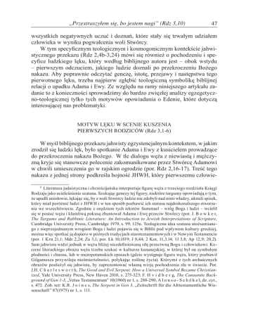 „Przestraszyłem się, bo jestem nagi” (Rdz 3,10) 47 wszystkich negatywnych uczuć i doznań, które stały się trwałym udziałem człowieka w wyniku pogwałcenia woli Stwórcy. W tym specyficznym teologicznym i kosmogonicznym kontekście jahwistycznego przekazu (Rdz 2,4b-3,24) mówi się również o pochodzeniu i specyfice ludzkiego lęku, który według biblijnego autora jest – obok wstydu – pierwszym odczuciem, jakiego ludzie doznali po przekroczeniu Bożego nakazu. Aby poprawnie odczytać genezę, istotę, przejawy i następstwa tego pierwotnego lęku, trzeba najpierw zgłębić teologiczną symbolikę biblijnej relacji o upadku Adama i Ewy. Ze względu na ramy niniejszego artykułu zadanie to z konieczności sprowadzimy do bardzo zwięzłej analizy egzegetyczno-teologicznej tylko tych motywów opowiadania o Edenie, które dotyczą interesującej nas problematyki. MOTYW LĘKU W SCENIE KUSZENIA PIERWSZYCH RODZICÓW (Rdz 3,1-6) W myśl biblijnego przekazu jahwisty egzystencjalnym kontekstem, w jakim zrodził się ludzki lęk, było spotkanie Adama i Ewy z kusicielem prowadzące do przekroczenia nakazu Bożego. W tle dialogu węża z niewiastą i mężczyzną kryje się stanowcze polecenie zakomunikowane przez Stwórcę Adamowi w chwili umieszczenia go w rajskim ogrodzie (por. Rdz 2,16-17). Treść tego nakazu z jednej strony podkreśla hojność JHWH, który pierwszemu człowie8 Literatura judaistyczna i chrześcijańska interpretuje figurę węża z trzeciego rozdziału Księgi Rodzaju jako ucieleśnienie szatana. Szukając genezy tej figury, niektóre targumy opowiadają o tym, że upadli aniołowie, lękając się, by z woli Stwórcy ludzie nie zdobyli nad nimi władzy, uknuli spisek, który miał poróżnić ludzi z JHWH i w ten sposób pozbawić ich statusu najdoskonalszego stworzenia we wszechświecie. Zgodnie z orędziem tych tekstów Sammael – wróg Boga i ludzi – wcielił się w postać węża i kłamliwą pokusą zbuntował Adama i Ewę przeciw Stwórcy (por. J. B o w k e r, The Targums and Rabbinic Literature: An Introduction to Jewish Interpretations of Scripture, Cambridge University Press, Cambridge 1979, s. 99, 125n. Teologiczna idea szatana utożsamianego z nieprzejednanym wrogiem Boga i ludzi pojawia się w Biblii pod wpływem kultury greckiej, można więc spotkać ją dopiero w późnych tradycjach starotestamentowych i w Nowym Testamencie (por. 1 Krn 21,1; Mdr 2,24; Za 3,1; por. Łk 10,1819; J 8,44; 2 Kor, 11,3.14; 1J 3,8; Ap 12,9; 20,2). Sam jahwista widzi jednak w wężu bliżej niezdefiniowaną siłę przeciwną Bogu i człowiekowi. Korzeni literackiego obrazu węża trzeba szukać w kulturze kananejskiej, w której był on symbolem płodności i chaosu, lub w mezopotamskich eposach (gdzie występuje figura węża, który pozbawił Gilgamesza przywileju nieśmiertelności, połykając roślinę życia). Którymś z tych archaicznych obrazów posłużył się jahwista, by zaprezentować własną wizję pochodzenia zła w świecie. Por. J.H. C h a r l e s w o r t h, The Good and Evil Serpent: How a Universal Symbol Became Christianized, Yale University Press, New Haven 2010, s. 275-323; F. H v i d b e r g, The Canaanite Background of Gen 1-3, „Vetus Testamentum” 10(1960) nr 1, s. 288-290; A l o n s o - S c h ö k e l, dz. cyt., s. 472. Zob. też: K.R. J o i n e s, The Serpent in Gen 3, „Zeitschrift für die Alttestamentliche Wissenschaft” 87(1975) nr 1, s. 111. 48 Ks. Dariusz DZIADOSZ kowi daje we władanie zasadzony na wschodzie rajski ogród i udziela mu nieograniczonego prawa do korzystania z jego niezmierzonych zasobów (por. Rdz 2,8-15)9, z drugiej zaś przypomina człowiekowi o jego statusie stworzenia, radykalnie różniącym się od natury Stwórcy (por. Rdz 2,17), oraz obliguje go do wdzięcznego posłuszeństwa woli Boga i akceptacji ustanowionych przez Niego (ze względu na dobro Adama) reguł pobytu w Edenie. Klarowna treść tych reguł oraz kategoryczna forma ich komunikacji mają jedynie wskazać na niebezpieczeństwo, jakie czyha na człowieka w przypadku przekroczenia Bożej woli. JHWH chce, aby Adam wiedział, że sięgając po zakazane owoce, wystąpi nie tylko przeciw troszczącemu się o niego Bogu, ale też przeciw samemu sobie, ponieważ aktem nieposłuszeństwa i pychy uwolni z uwięzi złowrogie misterium zła, które Stwórca dla jego dobra ukrył w drzewie poznania dobra i zła10. Zupełnie inaczej intencje Stwórcy przedstawia wąż, który podczas dialogu z pierwszymi ludźmi w wyrachowany i na wskroś fałszywy sposób prezentuje Boga jako zazdrosnego o swą niezależność i potęgę Władcę. Według relacji węża JHWH tylko pozornie troszczy się o dobro i szczęście człowieka, w rzeczywistości zaś lęka się o to, by nie stał się on taki jak Bóg i nie pozbawił Go pozycji i przywilejów, i tylko z tego powodu, poprzez surowy nakaz, JHWH nie dopuszcza Adama i Ewy do drzewa poznania dobra i zła (por. Rdz 3, 1b.4-5). Pierwszym kontekstem, w którym w jahwistycznej relacji o ogrodzie Eden pojawia się lęk, jest zatem scena pokusy, gdy wąż cynicznymi intrygami i podstępnymi kłamstwami pragnie zniekształcić obraz Stwórcy w oczach ludzi. W swych kolejnych dwuznacznych i fałszywych interwencjach kusiciel przedstawia obraz zalęknionego Boga, który świadomie, ale też z pewną obawą broni swego wyjątkowego miejsca w świecie, które będzie zagrożone, jeśli tylko Adam i Ewa przekroczą Jego nakaz i sięgną po tajemnicze owoce poznania dobra i zła. Jak informuje dalsza część opowiadania, podstępne insynuacje węża okazują się całkowicie nieprawdziwe. Bóg przestrzegał Adama przed sięgnięciem po zakazane owoce, kierując się szczerą troską o dobro pierwszych ludzi, nie zaś zazdrością i lękiem o własną autonomię, której i tak nikt ani nic nie mo9 O wspaniałomyślności Stwórcy świadczy także Jego późniejsza troska o jak najlepsze warunki życia Adama w raju, przejawiaj