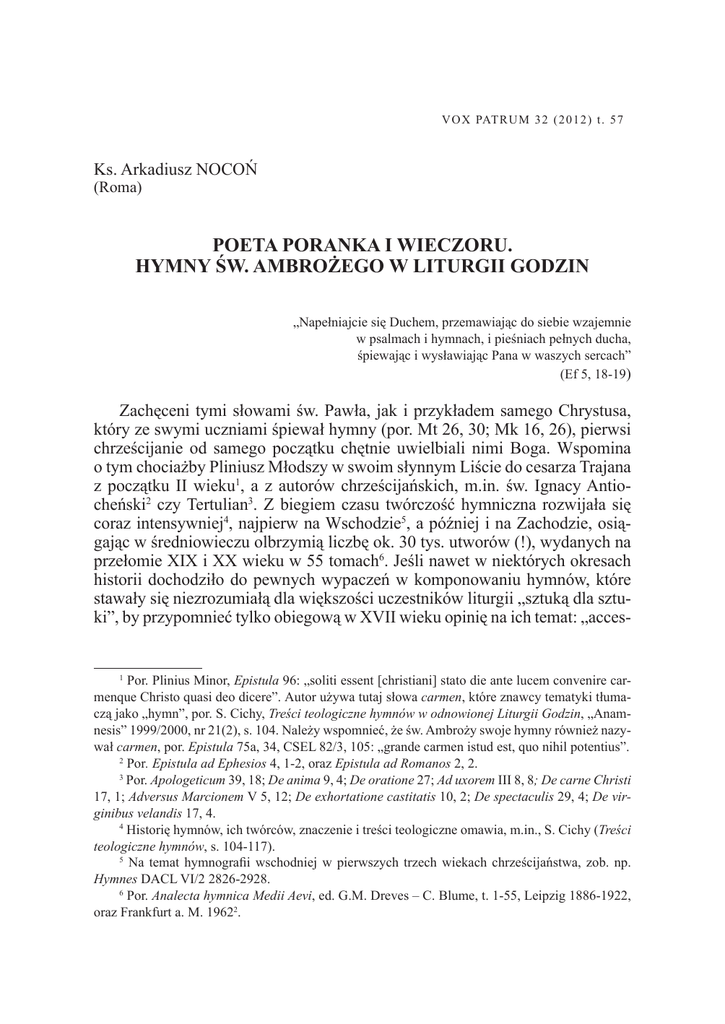 V O X PAT R U M 3 2 ( 2 0 1 2 ) t . 5 7 Ks. Arkadiusz NOCOŃ (Roma) POETA PORANKA I WIECZORU. HYMNY ŚW. AMBROŻEGO W LITURGII GODZIN „Napełniajcie się Duchem, przemawiając do siebie wzajemnie w psalmach i hymnach, i pieśniach pełnych ducha, śpiewając i wysławiając Pana w waszych sercach” (Ef 5, 18-19) Zachęceni tymi słowami św. Pawła, jak i przykładem samego Chrystusa, który ze swymi uczniami śpiewał hymny (por. Mt 26, 30; Mk 16, 26), pierwsi chrześcijanie od samego początku chętnie uwielbiali nimi Boga. Wspomina o tym chociażby Pliniusz Młodszy w swoim słynnym Liście do cesarza Trajana z początku II wieku1, a z autorów chrześcijańskich, m.in. św. Ignacy Antiocheński2 czy Tertulian3. Z biegiem czasu twórczość hymniczna rozwijała się coraz intensywniej4, najpierw na Wschodzie5, a później i na Zachodzie, osiągając w średniowieczu olbrzymią liczbę ok. 30 tys. utworów (!), wydanych na przełomie XIX i XX wieku w 55 tomach6. Jeśli nawet w niektórych okresach historii dochodziło do pewnych wypaczeń w komponowaniu hymnów, które stawały się niezrozumiałą dla większości uczestników liturgii „sztuką dla sztuki”, by przypomnieć tylko obiegową w XVII wieku opinię na ich temat: „acces1 Por. Plinius Minor, Epistula 96: „soliti essent [christiani] stato die ante lucem convenire carmenque Christo quasi deo dicere”. Autor używa tutaj słowa carmen, które znawcy tematyki tłumaczą jako „hymn”, por. S. Cichy, Treści teologiczne hymnów w odnowionej Liturgii Godzin, „Anamnesis” 1999/2000, nr 21(2), s. 104. Należy wspomnieć, że św. Ambroży swoje hymny również nazywał carmen, por. Epistula 75a, 34, CSEL 82/3, 105: „grande carmen istud est, quo nihil potentius”. 2 Por. Epistula ad Ephesios 4, 1-2, oraz Epistula ad Romanos 2, 2. 3 Por. Apologeticum 39, 18; De anima 9, 4; De oratione 27; Ad uxorem III 8, 8; De carne Christi 17, 1; Adversus Marcionem V 5, 12; De exhortatione castitatis 10, 2; De spectaculis 29, 4; De virginibus velandis 17, 4. 4 Historię hymnów, ich twórców, znaczenie i treści teologiczne omawia, m.in., S. Cichy (Treści teologiczne hymnów, s. 104-117). 5 Na temat hymnografii wschodniej w pierwszych trzech wiekach chrześcijaństwa, zob. np. Hymnes DACL VI/2 2826-2928. 6 Por. Analecta hymnica Medii Aevi, ed. G.M. Dreves – C. Blume, t. 1-55, Leipzig 1886-1922, oraz Frankfurt a. M. 19622. 438 KS. ARKADIUSZ NOCOŃ sit latinitas, recessit pietas”7, Kościół traktował je zawsze jako integralną i bardzo istotną część Liturgii Godzin: „Hymny bowiem bardziej niż inne części oficjum, ukazują od razu charakter poszczególnych Godzin i obchodów oraz pobudzają wiernych do pobożnego uczestnictwa w liturgii”8. Istotnie, o tym że wywołują one „uczucie pobożnego oddania (affectus pietatis), zaświadcza sam św. Augustyn opisując w Wyznaniach swoje emocje, jakie towarzyszyły mu w czasie słuchania śpiewu hymnów, ułożonych przez Ambrożego: „Ileż razy płakałem słuchając hymnów... wstrząśnięty błogim śpiewem Twego Kościoła. Głosy te wlewały się do moich uszu, a gdy Twoja prawda ściekała kroplami do serca, parowało z niego gorące uczucie pobożnego oddania. Z oczu płynęły łzy i dobrze mi było z nimi”9. I. „WIELKI JEST TEN ŚPIEW [HYMNÓW], OD KTÓREGO NIE MA NIC POTĘŻNIEJSZEGO”10 Właśnie Ambrożemu, twórcy łacińskiego hymnu kościelnego11 i jego obecności w aktualnej Liturgii Godzin, chcemy poświęcić naszą uwagę. Wprawdzie pierwszym autorem hymnów liturgicznych na Zachodzie był św. Hilary z Poitiers († 367)12, który w czasie swego wygnania na Wschodzie spotkał się z twórczością ojca hymnografii – św. Efrema (zm. 373)13, jednak poezja Galijczyka okazała się zbyt wymagająca dla przeciętnego odbiorcy, tak pod względem treści jak i zastosowanej metryki; nie wiemy więc, czy kiedykolwiek została użyta w liturgii14. Hilary ponadto, mimo że był równie dobrze wykształcony jak Ambroży, nie posiadał, jak się wydaje, owego geniuszu twórczego, owej artystycznej kreatywności pozwalającej „przekładać” pojęcia teologiczne na sugestywne poetyckie obrazy. Biskupa Mediolanu słusznie więc można uważać za pierwszego hymnologa chrześcijańskiego na Zachodzie15, który poza Por. Cichy, Treści teologiczne hymnów, s. 104. Ogólne Wprowadzenie do Liturgii Godzin 173, w: Liturgia Godzin. Codzienna modlitwa Ludu Bożego, t. 1, Poznań 1982, 75. 9 Augustinus Hipponensis, Confessiones IX 6, 14, CCL 27, 141, tłum. Z. Kubiak: Św. Augustyn, Wyznania, Warszawa 19822, 161. 10 Ambrosius, Epistula 75a, 34, tłum. P. Nowak: Ambroży z Mediolanu, Listy, t. 3: Listy 70-76 i Listy poza zbiorem. Akta Synodu w Akwilei, BOK 28, Kraków 2012. 11 Por. Muza łacińska. Antologia poezji wczesnochrześcijańskiej i średniowiecznej (III-XIV/ XV w.), red. M. Starowieyski, BN II 255, Wrocław – Warszawa – Kraków 2007, s. XXII. 12 Por. S. Longosz, Hymny św. Hilarego i Kolumby, SACh 15 (2001) 271-292. 13 Por. Leksykon liturgii, red. B. Nadolski, Poznań 2006, 524. 14 Por. Muza łacińska, s. XXIII. B. Nadolski (Leksykon liturgii, s. 524), stwierdzi wprost: „Żaden z hymnów Hilarego nie wszedł do liturgii”. 15 Por. C. Riggi, Lineamenti della personalità di s. Ambrogio nel ricordo agostiniano w: tegoż, Epistrophe. Tensione verso la divina armonia. Scritti di filologia patristica, Biblioteca di Scienze Religiose 70, Roma 1985, 281. 7 8 POETA PORANKA I WIECZORU 439 komponowaniem hymnów, zaprowadził także zwyczaj ich śpiewania w czasie liturgii16. Same hymny powstały, jak się wydaje, dość przypadkowo, aby dodać ducha obrońcom jednej z mediolańskich bazylik, którą władza świecka zamierzała przekazać arianom. Biskup Ambroży zamknięty z liczną grupą wiernych w środku kościoła ułożył dla oblężonych specjalne modlitwy, proste w formie, ale bogate w treści, i co najważniejsze, zdolne w tamtej dramatyczn