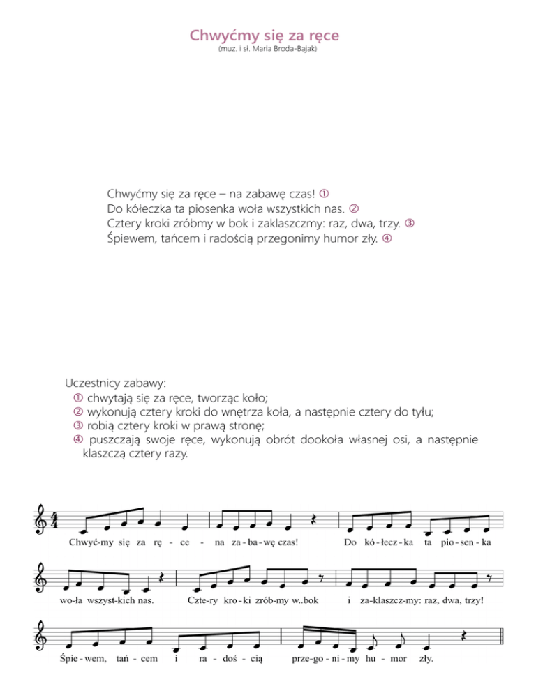 Chwyćmy się za ręce (muz. i sł. Maria Broda-Bajak) Chwyćmy się za ręce – na zabawę czas! Do kółeczka ta piosenka woła wszystkich nas. Cztery kroki zróbmy w bok i zaklaszczmy: raz, dwa, trzy. Śpiewem, tańcem i radością przegonimy humor zły. Uczestnicy zabawy: chwytają się za ręce, tworząc koło; wykonują cztery kroki do wnętrza koła, a następnie cztery do tyłu; robią cztery kroki w prawą stronę; puszczają swoje ręce, wykonują obrót dookoła własnej osi, a następnie klaszczą cztery razy.