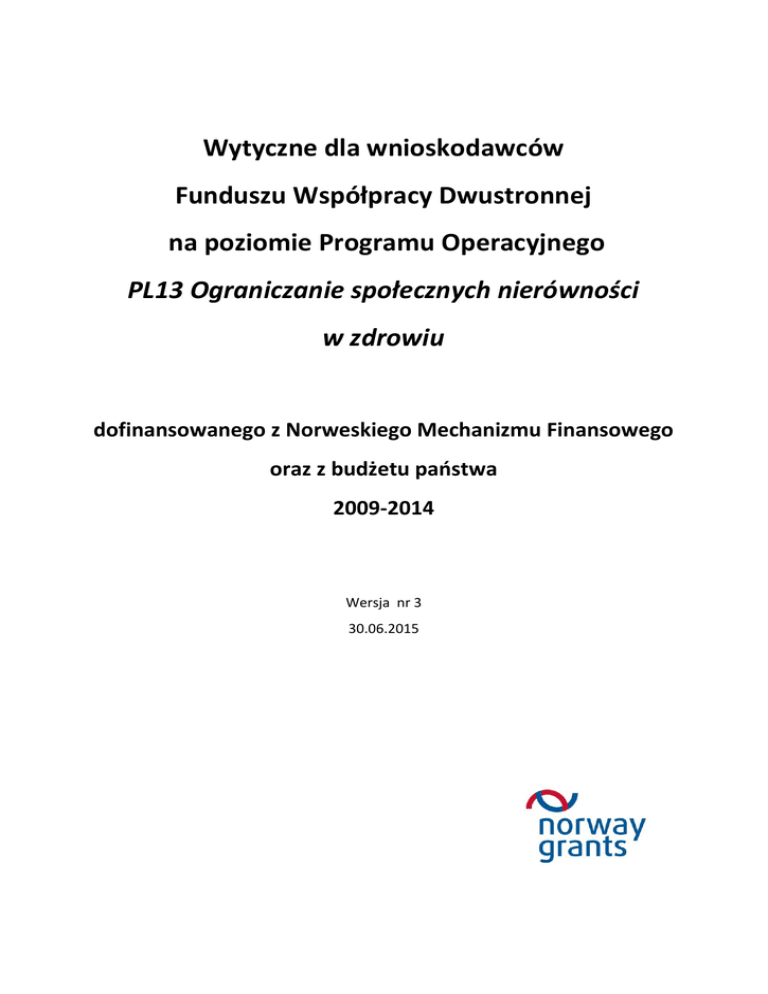 Wytyczne dla wnioskodawców Funduszu Współpracy Dwustronnej na poziomie Programu Operacyjnego PL13 Ograniczanie społecznych nierówności w zdrowiu dofinansowanego z Norweskiego Mechanizmu Finansowego oraz z budżetu państwa 2009-2014 Wersja nr 3 30.06.2015 Spis treści: 1. Ramy prawne Funduszu Współpracy Dwustronnej ............................................................ 4 2. Operator Programu ............................................................................................................. 5 3. Cel i zakres Funduszu Współpracy Dwustronnej ................................................................ 5 4. Grant dla beneficjentów i potencjalnych beneficjentów programu operacyjnego ........... 6 4.1. Wnioskodawcy ........................................................................................................... 6 4.2. Partnerzy .................................................................................................................... 7 4.3. Termin naboru ............................................................................................................ 7 4.4. Alokacje roczne .......................................................................................................... 7 4.5. Działania kwalifikowalne podejmowane przez beneficjentów .................................. 8 4.6. Nabór i ocena wniosków FWD ................................................................................... 8 4.7. Umowa w sprawie projektu FWD ............................................................................ 10 4.8. Zasady finansowe ..................................................................................................... 10 4.8.1. Ogólne zasady kwalifikowalności wydatków ....................................................... 10 4.8.2. Wydatki kwalifikowalne w ramach projektu FWD ............................................... 11 5. Wdrażanie projektu FWD .................................................................................................. 13 5.1. Okres realizacji projektu FWD .................................................................................. 13 5.2. Rozliczanie projektu FWD......................................................................................... 13 5.2.1. Składanie sprawozdania FWD .............................................................................. 13 5.2.2. Weryfikacja sprawozdania FWD........................................................................... 14 5.3. Refundacja i przekazywanie środków finansowych ................................................. 15 5.4 Kontrola realizowanych projektów FWD ........................................................................ 15 6. Seminaria służące nawiązaniu kontaktów ........................................................................ 15 6.1. Informacje ogólne .................................................................................................... 16 Zasady udziału w seminariach .............................................................................................. 16 6.2. 7. Obowiązki wynikające z uczestnictwa w seminarium .............................................. 17 Strona internetowa www.fbr.zdrowie.gov.pl ................................................................... 17 2 Wykaz skrótów FWD PO Fundusz Współpracy Dwustronnej na poziomie Programu Operacyjnego MZ Ministerstwo Zdrowia NMSZ Norweskie Ministerstwo Spraw Zagranicznych OP Operator Programu PL13 Program Operacyjny Ograniczanie społecznych nierówności w zdrowiu KMF Komitet Mechanizmów Finansowych KPK Krajowy Punkt Kontaktowy 3 1. Ramy prawne Funduszu Współpracy Dwustronnej a) Umowa pomiędzy Królestwem Norwegii a Unią Europejską w sprawie Norweskiego Mechanizmu Finansowego na lata 2009-2014, zawarta w dniu 28 lipca 2010 roku. b) Memorandum of Understanding wdrażania Norweskiego Mechanizmu Finansowego na lata 2009-2014 zawarte przez Królestwo Norwegii i Rzeczpospolitą Polską w dniu 17 czerwca 2011 roku. c) Regulacje w sprawie wdrażania Norweskiego Mechanizmu Finansowego na lata 2009- 2014 z dnia 11 lutego 2011 roku z późn. zmianami. d) Umowa w sprawie programu Ograniczanie społecznych nierówności w zdrowiu, zawarta między Norweskim Ministerstwem Spraw Zagranicznych a Ministerstwem Rozwoju Regionalnego (KPK) w dniu 20 grudnia 2012 r. z późn. zmianami. e) Porozumienie w sprawie realizacji programu PL13 Ograniczanie społecznych nierówności w zdrowiu, zawarte między Ministrem Rozwoju Regionalnego a Ministrem Zdrowia w dniu 29 stycznia 2013 r. z późn. zmianami. f) Wszelkie wytyczne przyjęte przez NMSZ, KMF i KPK, w tym wytyczne Darczyńców w sprawie wzmacniania stosunków dwustronnych. 4 2. Operator Programu Operator Programu (OP) jest jednostką odpowiedzialną za przygotowanie i wdrożenie Funduszu Współpracy Dwustronnej na poziomie programu. Funkcję OP pełni Minister Zdrowia. Działania wynikające z pełnienia przez Ministra Zdrowia funkcji Operatora Programu wykonuje Departament Funduszy Europejskich MZ. Operator Programu odpowiedzialny jest za nabór, wybór oraz rozliczanie projektów realizowanych w ramach Funduszu. Wszelka komunikacja w odniesieniu do projektów jest kierowana do OP na adres: Departament Funduszy Europejskich Ministerstwo Zdrowia Ul. Miodowa 15 00-952 Warszawa e-mail: [email protected] 3. Cel i zakres Funduszu Współpracy Dwustronnej Celem Funduszu Współpracy Dwustronnej jest nawiązywanie partnerstw, ich rozwój i ułatwienie tworzenia sieci, wymiany, dzielenia się i przekazywania wiedzy, technologii, doświadczeń i dobrych praktyk między beneficjentami i podmiotami z Norwegii. Działania podejmowane w ramach Funduszu odnoszą się do celu programu PL13, którym jest poprawa stanu zdrowia społeczeństwa polskiego poprzez ograniczanie nierówności w zdrowiu wywołanych czynnikami społecznymi. W ramach Funduszu realizowane będą następuj