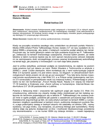 Biuletyn EBIB, nr 2 (129)/2012, Koniec 2.0? Dział artykuł y te matyczne Marcin Wilkowski Historia i Media Świat końca 2.0 Streszczenie: Artykuł omawia funkcjonowanie pojęć związanych z koncepcją 2.0 w różnych aspektach: estetycznym, retorycznym, terapeutycznym, ich marketingowy charakter i brak zakorzenienia w lokalnej rzeczywistości. W konkluzji zwraca uwagę na ograniczający charakter języka posługującego się ideologią 2.0 i proponuje jego odrzucenie. Słowa kluczowe: krytyka idei 2.0, serwisy społecznościowe, innowacje Kiedy na początku września zeszłego roku umieściłem na stronach portalu Historia i Media (HiM) artykuł Piotra Tafiłowskiego Koniec świata 2.01 od razu wysłałem do redakcji EBIB-u propozycję, aby jeden z kolejnych numerów podjął właśnie ten temat. Przyznam się, że moim głównym celem nie było poddanie krytyce tez P. Tafiłowskiego, zwłaszcza na łamach branżowego czasopisma, chociaż byłem pewien, że wiele tekstów w takim numerze będzie się do nich wprost merytorycznie odnosić Zależało mi na zainicjowaniu dość szczególnego procesu pewnej środowiskowej autorefleksji na temat tego, jak piszemy o innowacjach i co nam daje takie pisanie. Jest to próba wstydliwa, ponieważ podjęta ze świadomością, że zejście na poziom meta powinno być już dawno za nami. Robin Wauters z Techcruncha w artykule z 2009(!) r. pisał: Liczba startupów, które kontaktują się z nami wykorzystując pojęcie Web 2.0 wyraźnie spada (i to jest dobra rzecz), na blogach i w aktualnościach technologicznych także prawie nie da się go już zauważyć 2. Trzy lata temu biznes rozpoczął proces wycofywania się z idei Web 2.0, a w Polsce wciąż dyskutujemy nad tym, co 2.0 oznacza(ło) w perspektywie nauki czy instytucji kultury. Potwierdzają to planowane na ten rok konferencje: „Forum Nowej Nauki. Nauka 2.0: więcej niż Internet” 17-18 kwietnia w Krakowie oraz „Zwrot cyfrowy w humanistyce. Internet-Nowe media-Kultura 2.0” 25-26 października w Lublinie. Pytania o faktyczną treść i znaczenie tak ogólnych pojęć jak nauka 2.0, Web 2.0, crowdsourcing, wikinomia czy otwarty dostęp (żeby zredukować już ten katalog wyłącznie do terminów pojawiających się w tekście P. Tafiłowskiego) nie zostaną przeze mnie w ogóle podjęte, podobnie jak pytanie o zasadność poruszenia tego tematu. Dostatecznie argumentuje ją fakt, że swój artykuł zamiast na łamach EBIB-u z powodzeniem mógłbym opublikować w każdym innym, publicznie dostępnym punkcie Sieci, a jego potencjalny zasięg w żadnym stopniu nie zależałby od adresu URL, nazwy wydawcy, lub jego braku, czy narzędzia, za pomocą którego jest wyświetlany. Kiedy istotna staje się jedynie dostępność on-line i możliwość błyskawicznego powielenia czy skomentowania — a nie numer ISSN czy dotacja ministra — nawet największy 1 TAFIŁOWSKI, P. Koniec świata 2.0. W: Historia i Media [on-line]. 11.09.2011 [Dostęp 28.02.2012]. Dostępny w World Wide Web: http://historiaimedia.org/2011/09/11/koniec-swiata-2-0/. 2 WAUTERS, R. The death of "Web 2.0". W: Techcrunch [on-line]. 14.10.2009 [Dostęp 28.02.2012]. Dostępny w World Wide Web: http://techcrunch.com/2009/02/14/the-death-of-web-20/. 1 Biuletyn EBIB, nr 2 (129)/2012, Koniec 2.0? Dział artykuł y te matyczne sceptyk musi dostrzec, że system prawdziwie ewoluuje. Chciałbym krótko zastanowić się, w jaki sposób i na jakich zasadach definiujemy kierunek tej ewolucji i co nam daje pisanie o innowacjach w perspektywie permanentnego kryzysu. 2.0 jako estetyka innowacji Problem polega na tym, by skrajnie technologiczne i nowoczesne idee odnosić do rzeczywistości dostępnej, a nie wyobrażonej. Premier Waldemar Pawlak postulujący rozdanie iPadów wszystkim uczniom w Polsce 3 (chociaż analogiczna akcja w Korei Południowej kosztować ma 2 mld dolarów4, co w polskich warunkach, choćby ze względów finansowych, jest nierealne) może być doskonałym przykładem takiego działania, w tym wypadku motywowanym wymogami marketingu politycznego. Paradygmat, w którym kopiowanie rozwiązań z Zachodu jest jedyną albo dominującą formą wykorzystania cyfrowej rewolucji technologicznej, jest nie tylko ogromnym wyzwaniem dla budżetów polskich instytucji, ale też przejawem czegoś w rodzaju postkolonialnej mentalności. W tego typu myśleniu wszystko to, co przychodzi z zewnątrz, wydaje się być najskuteczniejszym rozwiązaniem naszych wewnętrznych kłopotów i uzupełnieniem braków. Czasem jest po prostu zbyt atrakcyjną perspektywą, żeby można było z niej zrezygnować. W 2007 r. Agnieszka Koszowska z Biblioteki 2.0 pisała: Za jakiś czas na pewno znajdą się w SL [Second Life] także polskie biblioteki, a awatary naszych bibliotekarzy będą udzielać informacji, prezentować regionalne materiały i promować globalnie rodzimą kulturę5. Dziś widzimy, że ta wizja nie została zrealizowana — przynajmniej jeśli chodzi o polskie biblioteki. Organizacyjne i kompetencyjne koszty zaistnienia w tak koszmarnie nieużytecznej (usability, accessibility) przestrzeni i realna nieobecność tam grupy docelowej (polskich czytelników) sprawia, że SL okazało się ślepą uliczką internetowej ewolucji polskich instytucji kultury. Projekty promocji miast, podejmowane na fali powszechnego marketingowego zainteresowania tym środowiskiem, również upadły lub od wielu lat nie są już rozwijane (projekt Second Poland). Nie interesuje mnie jednak proste wyszukiwanie tego typu niesprawdzonych prognoz (proszę poczytać starsze artykuły na HiM i poszukać podobnych tez mojego autorstwa). Zależy mi raczej na uświadomieniu pewnego negatywnego modelu absorbowania innowacyjnych idei. Dużą rolę pełni w nim niestety dominująca komunikacja marketingowa, narzucająca nam sposób mówienia o nowych zjawiskach i rozwiązaniach w Internecie. Bezrefleksyjnie akceptujemy fakt, że proponowana narracja ma zawsze komercyjne