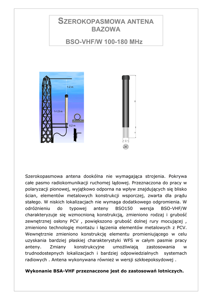 SZEROKOPASMOWA ANTENA BAZOWA BSO-VHF/W 100-180 MHz Szerokopasmowa antena dookólna nie wymagająca strojenia. Pokrywa całe pasmo radiokomunikacji ruchomej lądowej. Przeznaczona do pracy w polaryzacji pionowej, wyjątkowo odporna na wpływ znajdujących się blisko ścian, elementów metalowych konstrukcji wsporczej, zwarta dla prądu stałego. W niskich lokalizacjach nie wymaga dodatkowego odgromienia. W odróżnieniu do typowej anteny BSO150 wersja BSO-VHF/W charakteryzuje się wzmocnioną konstrukcją, zmieniono rodzaj i grubość zewnętrznej osłony PCV , powiększono grubość dolnej rury mocującej , zmieniono technologię montażu i łączenia elementów metalowych z PCV. Wewnętrznie zmieniono konstrukcję elementu promieniującego w celu uzyskania bardziej płaskiej charakterystyki WFS w całym pasmie pracy anteny. Zmiany konstrukcyjne umożliwiają zastosowania w trudnodostepnych lokalizacjach i bardziej odpowiedzialnych systemach radiowych . Antena wykonywana również w wersji szkłoepoksydowej . Wykonanie BSA-VHF przeznaczone jest do zastosowań lotniczych. Właściwości elektryczne C z ę st o t l i w o ś c i pr a c y 116-140 MHz długość 2300,00 mm ( BSA-VHF) 135-174 MHz długość 1400,00 mm ( BSO VHF/W) Zysk energetyczny w z g lę d e m d i p o l a λ / 2 0 dBd (2,15 dBi) Charakterystyka promieniowania Dookólna Impedancja 50 Ω Typ anteny dipol λ/2 Dopasowanie WFS <1,6 Maksymalna moc doprowadzona 100 W Pasmo pracy Średnio 10 MHz K o d p o z i o me j c ha r a k t e r y s ty k i p r o mi e ni o w a ni a a nte ny ( w p ła sz c z y ź ni e w e k to r a H ) 000ND00 (według Zalecenia CEPT T/R 25-08) K o d p i o no w e j c h a r a k te r y s ty k i p r o mi e ni o w a ni a a nte ny ( w p ła sz c z y ź ni e w e k to r a E ) 039DE00 (według Zalecenia CEPT T/R 25-08) Cechy mechaniczne Rodzaj złącza UC1, N Materiał Aluminium, PCV/ szkłoepox Polaryzacja pionowa Charakterystyk WFS dla zakresu częstotliwości 116 – 136 MHz VSWR BSO 150 M1: 1,874 @ 145,10 MHzM2: 1,331 @ 152,10 MHz M3: 1,06 @ 157,90 MHz M4: 1,439 @ 169,50 MHz 2,50 2,25 VSWR 2,00 1,75 1,50 1,25 M1 M2 M3 M4 1,00 140 145 150 155 160 Frequency (140,0 - 170,0 MHz) Resolution: 130 Date: Model: S331A 165 CAL:ON(COAX) Time: Serial #: 00036029 170 CW: ON Smoothing: 0 Charakterystyk WFS dla zakresu częstotliwości 140-170 MHz 90 120 60 30 -40 -50 -30 -20 -10 -3dB 150 0 180 210 330 300 240 270 Pionowa charakterystyka promieniowania dla częstotliwości 150,0 MHz