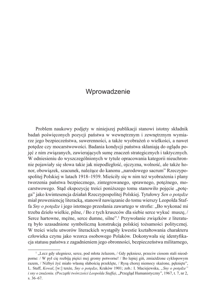 Wprowadzenie Problem naukowy podjęty w niniejszej publikacji stanowi istotny składnik badań poświęconych pozycji państwa w wewnętrznym i zewnętrznym wymiarze jego bezpieczeństwa, suwerenności, a także wyobrażeń o wielkości, a nawet potędze czy mocarstwowości. Badania kondycji państwa skłaniają do oglądu pojęć z nim związanych, zawierających sumę znaczeń strategicznych i taktycznych. W odniesieniu do wyszczególnionych w tytule opracowania kategorii nieuchronnie pojawiały się słowa takie jak niepodległość, ojczyzna, wolność, ale także honor, obowiązek, szacunek, należące do kanonu „narodowego sacrum” Rzeczypospolitej Polskiej w latach 1918–1939. Mieściły się w nim też wyobrażenia i plany tworzenia państwa bezpiecznego, zintegrowanego, sprawnego, potężnego, mocarstwowego. Stąd ekspozycję treści poniższego tomu stanowiło pojęcie „potęga” jako kwintesencja działań Rzeczypospolitej Polskiej. Tytułowy Sen o potędze miał proweniencję literacką, stanowił nawiązanie do tomu wierszy Leopolda Staffa Sny o potędze i jego istotnego przesłania zawartego w strofie: „Bo wykonać mi trzeba dzieło wielkie, pilne, / Bo z tych kruszców dla siebie serce wykuć muszę, / Serce hartowne, mężne, serce dumne, silne”.1 Przywołanie związków z literaturą było uzasadnione symboliczną konstrukcją polskiej tożsamości politycznej. W treści wielu utworów literackich wystąpiły kwestie kształtowania charakteru człowieka czynu jako wzorca osobowego Polaków. Dokonywała się identyfikacja statusu państwa z zagadnieniem jego obronności, bezpieczeństwa militarnego, 1 „Lecz gdy ulegniesz, serce, pod młota żelazem, / Gdy pękniesz, przeciw ciosom stali nieodporne: / W pył cię rozbiją pięści mej gromy potworne! / Bo lepiej giń, zmiażdżone cyklopowym razem, / Niżbyś żyć miało własną słabością przeklęte, / Rysą chorej niemocy skażone, pęknięte”, L. Staff, Kowal, [w:] tenże, Sny o potędze, Kraków 1901; zob.: I. Maciejewska, „Sny o potędze” i sny o znużeniu. (Początki twórczości Leopolda Staffa), „Przegląd Humanistyczny”, 1967, t. 7, nr 2, s. 36–67. 10 Wprowadzenie istnienia wojska narodowego, walki o niepodległość, historii męczeństwa Polaków, dziejów kombatanctwa powstańczego i wojennego, którego znaczenie skłaniało do wykorzystania literackiego motywu „snu o potędze”.2 Wysoko sytuowano kwestie wolności odzyskanej przez Polskę, zgodnie z maksymą Liwiusza, że libertatis restitutae dulce auditu nomen („słodkie do słyszenia słowo odzyskanej wolności”). Niepodległa Polska była budowana w warunkach systematycznego likwidowania pozostałości po czasach zaborów i okupacji, a następnie wypracowania i wdrażania własnego porządku prawno-politycznego. W jej konstrukcji znajdowały się elementy kultury łacińskiej, tradycji romantycznej, myśli szlacheckointeligenckiej. Pielęgnowała pamięć o heroizmie walki niepodległościowej, o historii narodu polskiego i narodów ościennych, o poczuciu misji cywilizacyjnej w Europie. Szukała inspiracji w tradycji europejskiego demokratyzmu politycznego i ekonomicznego, korzystając z dorobku Francji, Szwajcarii, Wielkiej Brytanii. Przeżyła okresy konwersji ustrojowej, budowania zrębów konstytucjonalizmu i parlamentaryzmu, następnie jego redefiniowania, kształtowania systemu wartości i przekonań na temat prawomocności władzy politycznej, podziału dóbr materialnych i duchowych, odpowiedzialności za sprawy publiczne i prywatne. W strategii interesów państwowych znalazły się zagadnienia diagnozowania oraz prognozowania stanu stałości i zmienności środowiska bezpieczeństwa wewnętrznego i zewnętrznego. W trakcie przygotowania tomu Sen o potędze: bezpieczeństwo, suwerenność, mocarstwowość. Rzeczpospolita Polska 1918–1939 niezbędne było zwrócenie uwagi na „pamięć społeczną” związaną z rekonstrukcją przeszłości i wyobrażeń o niej.3 W zasobach pamięci zawarte były informacje o społeczeństwie i państwie, o osobach i wydarzeniach oraz ich transformacjach. Potyczki o ocenę dziejów Polski 1918–1939, nazywanej Polską międzywojenną, trwały jeszcze w czasie jej istnienia. O odniesieniach do niej decydowały czynniki obiektywne i subiektywne, sprawiające, że niemal od razu po klęsce wrześniowej rozpoczęły się działania rozliczeniowe, szczególnie z systemem politycznym kształtowanym i utrwalanym w latach 1926–1935. Wyraźnie uwidoczniona była chęć wzięcia odwetu za działalność obozu rządowego. Stąd wywodziły się motywy historiografii tworzonej na emigracji politycznej, zawierającej wątki moralnej i społecznej dezaprobaty dla dawnego modelu zarządzania państwem.4 Krytyczna ocena przeszłości mię2 M. Jabłonowski, Sen o potędze Polski. Z dziejów ruchu byłych wojskowych w II Rzeczypospolitej 1918–1939, Olsztyn 1998. 3 M. Halbwachs, Społeczne ramy pamięci, tłum i wstęp M. Król, Warszawa 2008, s. 7 i n. 4 L. Ciołkoszowa, Spojrzenie wstecz, Paris 1995; M. Kukiel, Generał Sikorski: żołnierz i mąż stanu Polski walczącej, London 1970; S. Mackiewicz, Historia Polski od 11 listopada 1918 r. do 17 września 1939 r., London 1970; W. Witos, Moja tułaczka w Czechosłowacji, Warszawa 1995; zob. Wprowadzenie 11 dzywojennej była także składnikiem propagandy Polski Ludowej. Prowadzono politykę unieważniania ideologicznej konstrukcji Rzeczypospolitej Polskiej z lat 1918–1939. Działania cenzury skupiały się między innymi na zagadnieniu negacji stanu Polski w wymiarze społeczno-gospodarczym, politycznym, militarnym.5 Negatywnej ekspozycji podlegała przedwrześniowa sytuacja Polski w relacjach międzynarodowych, a także usytuowanie społeczeństwa pod względem stopnia rozwoju cywilizacyjno-kulturowego. Pokazywano zacofanie gospodarcze Polski, przedkładano opinię o dysfunkcji ustroju prawno-politycznego państwa. Próbowano dyskredy