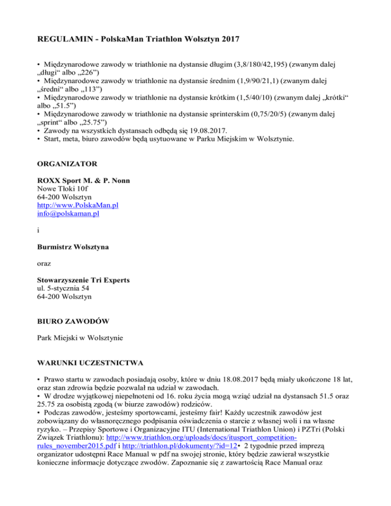 REGULAMIN - PolskaMan Triathlon Wolsztyn 2017 • Międzynarodowe zawody w triathlonie na dystansie długim (3,8/180/42,195) (zwanym dalej „długi“ albo „226”) • Międzynarodowe zawody w triathlonie na dystansie średnim (1,9/90/21,1) (zwanym dalej „średni“ albo „113”) • Międzynarodowe zawody w triathlonie na dystansie krótkim (1,5/40/10) (zwanym dalej „krótki“ albo „51.5”) • Międzynarodowe zawody w triathlonie na dystansie sprinterskim (0,75/20/5) (zwanym dalej „sprint“ albo „25.75”) • Zawody na wszystkich dystansach odbędą się 19.08.2017. • Start, meta, biuro zawodów będą usytuowane w Parku Miejskim w Wolsztynie. ORGANIZATOR ROXX Sport M. & P. Nonn Nowe Tłoki 10f 64-200 Wolsztyn http://www.PolskaMan.pl [email protected] i Burmistrz Wolsztyna oraz Stowarzyszenie Tri Experts ul. 5-stycznia 54 64-200 Wolsztyn BIURO ZAWODÓW Park Miejski w Wolsztynie WARUNKI UCZESTNICTWA • Prawo startu w zawodach posiadają osoby, które w dniu 18.08.2017 będą miały ukończone 18 lat, oraz stan zdrowia będzie pozwalał na udział w zawodach. • W drodze wyjątkowej niepełnoteni od 16. roku życia mogą wziąć udział na dystansach 51.5 oraz 25.75 za osobistą zgodą (w biurze zawodów) rodziców. • Podczas zawodów, jesteśmy sportowcami, jesteśmy fair! Każdy uczestnik zawodów jest zobowiązany do własnoręcznego podpisania oświadczenia o starcie z własnej woli i na własne ryzyko. – Przepisy Sportowe i Organizacyjne ITU (International Triathlon Union) i PZTri (Polski Związek Triathlonu): http://www.triathlon.org/uploads/docs/itusport_competitionrules_november2015.pdf i http://triathlon.pl/dokumenty/?id=12• 2 tygodnie przed imprezą organizator udostępni Race Manual w pdf na swojej stronie, który będzie zawierał wszystkie konieczne informacje dotyczące zwodów. Zapoznanie się z zawartością Race Manual oraz obecność na odprawie technicznej jest obowiązkowa). • Jazda na kole (drafting) na dystansie długim i średnim jest zabroniona; na dystansie krótkim i sprincie jazda w grupie jest dozwolona. Przepisy ITU Competition Rules 5.2. d.) i. (będą zastosowane we wszystkich kategoriach wiekowych!). Dlatego do startu na dystansie krótkim i sprint będą dopuszczone tylko tradycyjne kierownice oraz krótkie lemondki. • Trasa rowerowa jest zamknięta dla ruchu drogowego. Organizator nie może zagwarantować obecności pojedyńczych przypadków. Podczas konkurencji kolarskiej obowiązuje zakaz używania słuchawek do odbioru sygnałów dźwiękowych. Każdy z uczestników obowiązany jest do zastosowania się do przepisów o ruchu drogowym oraz zachowania należytej ostrożoności podczas etapu kolarskiego. • Rowerzyści poruszają się z zachowaniem zasad Ustawy Prawa o ruchu Drogowym. • Trasa biegowa nie jest zamknięta. • W przypadku awarii roweru w trakcie przejazdu należy usunąć się na pobocze drogi w sposób, aby nie zakłócić przebiegu wyścigu. • Udział w odprawie technicznej jest obowiązkowy (obecność będzie sprawdzona). Protesty i odwołania, które wynikają z nieobecności na odprawie technicznej lub nieznajomości regulaminu będą odrzucone. ODPOWIEDZIALNOŚĆ Każdy zawodnik jest odpowiedzialny za siebie i niniejszym deklaruje, że posiada ubezpieczenie OC o wysokości sumy ubezpieczeniowej adekwatnej do tego rodzaju zawodów oraz ubezpieczenie zdrowotne ważne na terenie Polski. Organizator nie odpowiada za rzeczy zgubione podczas imprezy. REZYGNACJA PODCZAS ZAWODÓW Uczestnicy, którzy zrezygnowali z kontynuacji wyścigu, bez względu na powód, muszą natychmiast poinformować o tym fakcie organizatora lub sędziego oraz oddać chip pomiaru czasu w biurze zawodów. Ewentualne koszty (akcja poszukiwawcza, koszty chipa itd.) za niezgłoszone opuszczenie zawodów ponosi zawodnik. LIMIT CZASOWY dystans długi: - pływanie maks. 2,5 godz. - rower maks. 8 godz. - całość maks. 17 godz. dystans średni: - pływanie maks. 1,5 godz. - rower maks. 3,5 godz. - całość maks. 8 godz. dystans krótki: - pływanie maks. 1 godz. - rower maks. 1,5 godz. - całość maks. 4 godz. dystans sprint: - pływanie maks. 0,5 godz. - rower maks. 0,75 godz. - całość maks. 2 godz. Przekroczenie limitu czasowego (cut-off-limit) prowadzi do nie ujęcia w klasyfikacji (DNF). KATEGORIE WIEKOWE K,M 16-17 (tylko 51.5 oraz 25.75); 18-29; K,M 30-39; K,M 40-49; K,M 50-59; K,M 60+ (K...kobiety, M...mężczyźni) ZGŁOSZENIA • Po wypełnieniu formularza zgłoszeniowego (REJESTRACJA http://www.polskaman.polskaman.pl/rejestracja_102.html) i opłaceniu wpisowego zawodnik będzie umieszczony na liście startowej. O terminie zgłoszenia decyduje data dokonania wpłaty wpisowego, przez którą rozumie się datę wpływu kwoty wpisowego na rachunek bankowy Organizatora. Wszystkie koszty wpłaty wpisowego pokrywa osoba wpłacająca. • Na życzenie zawodnika wysłane mailem na adres [email protected], organizator wystawia fakturę Vat. Faktury za udział w imprezie wystawiane są do 14 dni roboczych po wpływie opłaty na konto. • Obowiązuje limit uczestników – 450 osób razem na wszystkich dystansach. • Termin przyjmowania zgłoszeń 04.08.2017 lub wcześniej do wyczerpania limitu. • Warunkiem znalezienia się na oficjalnej liście startowej jest wcześniejsze uregulowanie opłaty startowej. • Za przepisanie numeru startowego na inną osobę, będzie pobrana opłata o wysokości PLN 50,-. Dokonanie tych zmian, jest możliwe tylko do 04.08.2017. Wszelkie zmiany mogą być dokonywane tylko i wyłącznie mailem na adres [email protected]. Osoba zastępująca melduje się do startu w zawodach przez portal DomTel. OPŁATY STARTOWE Opłatę startową należy wpłacać na konto: ROXX Sport Maria Nonn Nr 24 1090 1607 0000 0001 0829 7379 Bank Zachodni WBK SA 1 O. w Wolsztynie IBAN: PL24 1090 1607 0000 0001 0829 7379 BIC: WBKPPLPP Dystans sprint/krótki/średni/długi • PLN 100,-/150,-/250,-/350,- do 31.12.2016 • PLN 
