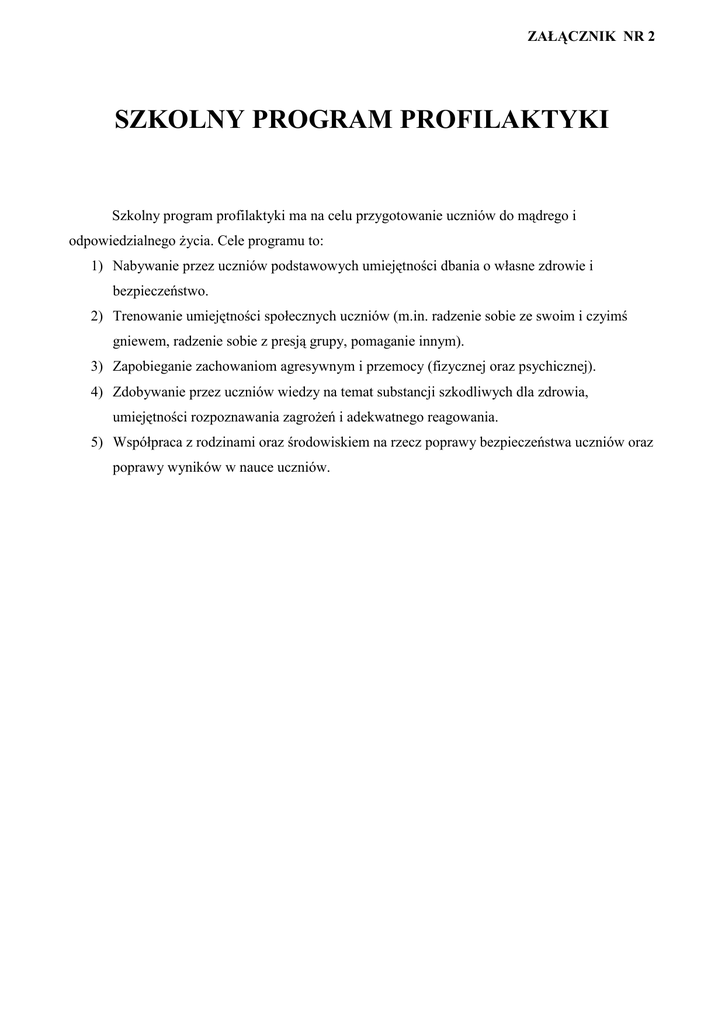 ZAŁĄCZNIK NR 2 SZKOLNY PROGRAM PROFILAKTYKI Szkolny program profilaktyki ma na celu przygotowanie uczniów do mądrego i odpowiedzialnego życia. Cele programu to: 1) Nabywanie przez uczniów podstawowych umiejętności dbania o własne zdrowie i bezpieczeństwo. 2) Trenowanie umiejętności społecznych uczniów (m.in. radzenie sobie ze swoim i czyimś gniewem, radzenie sobie z presją grupy, pomaganie innym). 3) Zapobieganie zachowaniom agresywnym i przemocy (fizycznej oraz psychicznej). 4) Zdobywanie przez uczniów wiedzy na temat substancji szkodliwych dla zdrowia, umiejętności rozpoznawania zagrożeń i adekwatnego reagowania. 5) Współpraca z rodzinami oraz środowiskiem na rzecz poprawy bezpieczeństwa uczniów oraz poprawy wyników w nauce uczniów. Zadania Formy i metody pracy I. Promocja 1.Organizowanie pogadanek, konkursów, akcji dotyczących higieny osobistej, higieny zdrowego stylu wieku dojrzewania, higieny jamy ustnej zdrowego odżywiania, pierwszej pomocy, walki życia i z hałasem (szczegóły w planie pracy Zespołu Zdrowia, samorządu kl. 1-3 i 4-6, bezpiecznego pedagoga). funkcjonowania 2.„Wolność oddechu – zapobiegaj astmie” – profilaktyka astmy dla kl.1 (logopeda). 3. Zorganizowanie szkolnych klubów i kół zainteresowań rozwijających zdolności uczniów ( wynikających z zapotrzebowania uczniów). 4. Zorganizowanie wspólnie z Radą Rodziców Rodzinnego Dnia Sportu (plan pracy Zespołu Zdrowia). 5.Udział w profilaktycznych zajęciach oferowanych przez Straż Miejską, policję, instytucje pozarządowe ( plan pracy pedagoga). 6. Zajęcia warsztatowe dla klas 1 ,,Dobry i zły dotyk”( plan pracy pedagoga, psychologa). 7.Tworzenie i weryfikowanie w ciągu roku szkolnego klasowych kodeksów praw i obowiązków ucznia (plany wychowawcze klas). 8. Wdrażanie uczniów do przestrzegania szkolnych procedur bezpieczeństwa (ruch prawostronny na schodach, sprowadzanie dzieci do szatni druga klatką schodową, zapoznanie uczniów z drogą ewakuacyjną i dzwonkami alarmowymi, bezpieczne zachowanie podczas przerw). 9. Realizacja zewnętrznych programów dotyczących zdrowego odżywiania( plany wychowawcze kl. 1-3 ). II. Zapobieganie 1. Lekcje wychowawcze dotyczące różnych form agresji.(plany wychowawcze klas). agresji 2. Skrzynka dla uczniów „Podziel się swoim problemem” znajdująca się na korytarzu. rówieśniczej 3. Badania socjometryczne w klasach- poznawanie relacji rówieśniczych – kl. 1-6. 4. Organizowanie szkoleń dla nauczycieli dotyczących przeciwdziałaniu agresji (plan pracy pedagoga i psychologa). 5. Realizacja programu ,,Spójrz inaczej” kl. 1-6. 6. Podpisywanie kontraktów i umów z uczniami i klasami.(plan pracy pedagoga i psychologa). 7. Promocja idei mediacji rówieśniczej w szkole poprzez plakaty, zdjęcia, audycje, apele (plan pracy pedagoga i psychologa). 8. Prowadzenie codziennych dyżurów mediacyjnych (plan pracy psychologa). 9. Wdrażanie procedury „Mediacja zamiast kary” oraz „Każdy może pomóc”.(plan pracy psychologa). 10. Prowadzenie koła superwizyjnego dla mediatorów (plan pracy psychologa). 11. Akcje charytatywne na terenie szkoły (plan pracy samorządu kl 13 i 4-6). Praca szkolnego klubu „Ośmiu Wspaniałych”. 12. Współpraca z patrolem szkolnym, policją, sądem, kuratorami, Ośrodkiem Pomocy Społecznej, pedagogami szkół w dzielnicy. 13. Współpraca z rodzicami - kontakt telefoniczny i osobisty, zebrania, wywiadówki partnerskie, konsultacje dla rodziców, podejmowanie wspólnych ustaleń (m.in. podpisywanie umów i kontaktów). 14. Postępowanie wg procedury interwencyjnej – wg zasad szkolnego zachowania bezpieczeństwa (interwencje indywidualne, grupowe, klasowe). 15. Warsztaty , szkolenia nauczycieli dotyczące wpływania na pozytywne relacje rówieśnicze . 16. Praca z uczniem poszkodowanym przez rówieśników i jego rodzicami. 17. Współpraca z Centrum Mediacji. 18.Diagnoza skali agresji wśród uczniów – anonimowa ankieta w kl.2-6 „Moje relacje w szkole” min. raz w roku. III. Zapobieganie 1. Konkurs plastyczny i literacki „Jestem przeciwko paleniu papierosów” – kl.4c. używaniu przez 2. ,,Nikotyna – legalny narkotyk”.- zajęcia warsztatowe dla ucz. kl.4.( plan pracy dzieci środków pedagoga i psychologa). psychoaktywnych 3. „Alkohol kradnie wolność” – zajęcia warsztatowe dla klas 5.( plan pracy pedagoga i psychologa). 4. „O czym nie mówią dilerzy narkotyków”- zajęcia warsztatowe dla uczniów kl.6.( plan pracy pedagoga i psychologa). 5. Współpraca ze szkolnym patrolem Straży Miejskiej. 6. Współpraca z Ośrodkiem Pomocy Społecznej, klubami osiedlowymi, policją, kuratorami sądowymi. IV. Zapobieganie 1. „Ruch Rozwijający Weroniki Sherborne”- zajęcia dla uczniów z problemami niepowodzeniom emocjonalnymi i społecznymi z kl.0-1( plan pracy psychologa i reedukatora) szkolnym 2. Zajęcia terapii pedagogicznej dla uczniów kl.1-3 z opiniami psychologicznymi (dysleksja, dysortografia i dysgrafia). 3. Koła Ortograficzne dla uczniów kl. 4-6. 4. Zajęcia wyrównawcze dla uczniów z trudnościami w nauce. 5. Zajęcia terapii logopedycznej. 6. Zajęcia ortofoniczne dla ucz.kl.0. 7. Spotkanie informacyjne dla rodziców kl.0-1 prowadzone przez Psychologa z PPP nr 10 (oferta poradni i badanie przesiewowe kl. 0). 8. Kierowanie uczniów z problemami w nauce na diagnozę psychologiczną do PPP. 9. Respektowanie zaleceń poradni pedagogiczno-psychologicznych na wszystkich przedmiotach szkolnych ( karta: Dostosowanie wymagań edukacyjnych do potrzeb psychofizycznych uczniów). 10. Współpraca z rodzicami i stała wymiana informacji na temat osiągnięć szkolnych (zebrania, wywiadówki partnerskie, konsultacje dzienniczek elektroniczny). 11. Zorganizowanie dla uczniów z trudnościami w nauce dodatkowej pomocy wolontariuszy. 12.Badanie przesiewowe dojrzałości szkolnej – kl. 0. 13. Przesiewowe badania logopedyczne kl. 0-1. 14. Zebranie dla rodzic