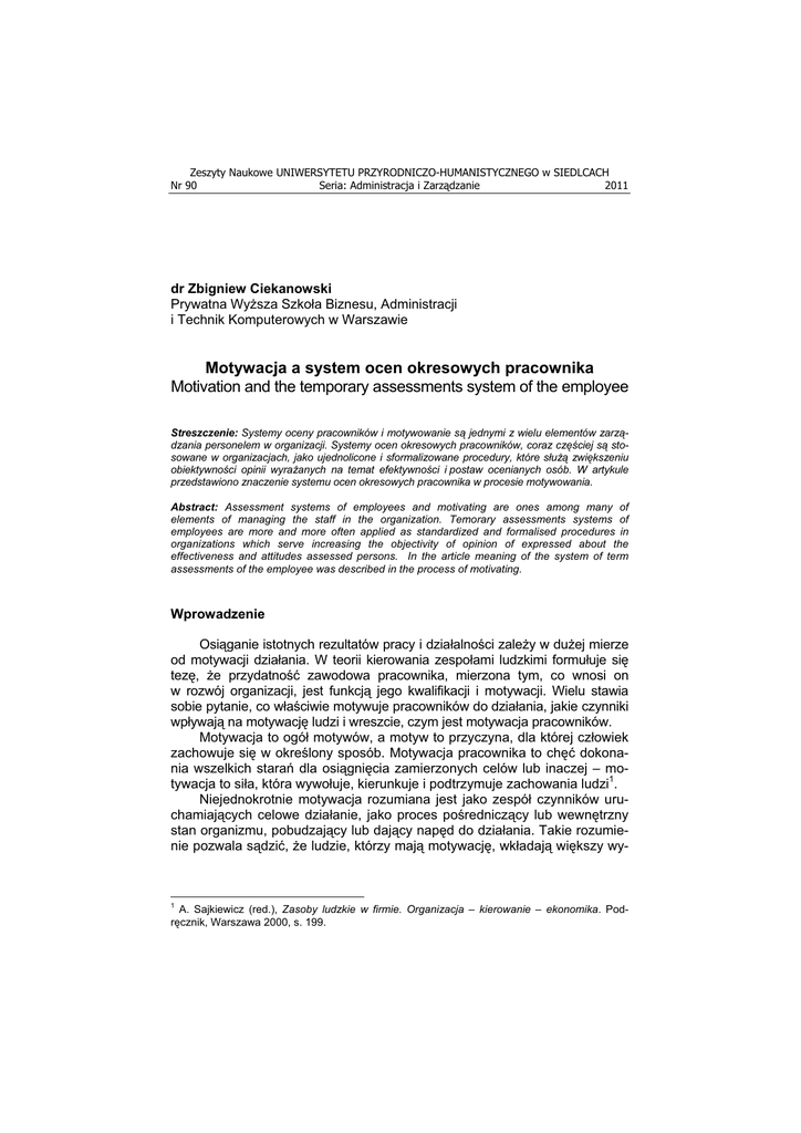 Zeszyty Naukowe UNIWERSYTETU PRZYRODNICZO-HUMANISTYCZNEGO w SIEDLCACH Nr 90 Seria: Administracja i Zarządzanie 2011 dr Zbigniew Ciekanowski Prywatna WyĪsza Szkoáa Biznesu, Administracji i Technik Komputerowych w Warszawie Motywacja a system ocen okresowych pracownika Motivation and the temporary assessments system of the employee Streszczenie: Systemy oceny pracowników i motywowanie są jednymi z wielu elementów zarządzania personelem w organizacji. Systemy ocen okresowych pracowników, coraz czĊĞciej są stosowane w organizacjach, jako ujednolicone i sformalizowane procedury, które sáuĪą zwiĊkszeniu obiektywnoĞci opinii wyraĪanych na temat efektywnoĞci i postaw ocenianych osób. W artykule przedstawiono znaczenie systemu ocen okresowych pracownika w procesie motywowania. Abstract: Assessment systems of employees and motivating are ones among many of elements of managing the staff in the organization. Temorary assessments systems of employees are more and more often applied as standardized and formalised procedures in organizations which serve increasing the objectivity of opinion of expressed about the effectiveness and attitudes assessed persons. In the article meaning of the system of term assessments of the employee was described in the process of motivating. Wprowadzenie Osiąganie istotnych rezultatów pracy i dziaáalnoĞci zaleĪy w duĪej mierze od motywacji dziaáania. W teorii kierowania zespoáami ludzkimi formuáuje siĊ tezĊ, Īe przydatnoĞü zawodowa pracownika, mierzona tym, co wnosi on w rozwój organizacji, jest funkcją jego kwalifikacji i motywacji. Wielu stawia sobie pytanie, co wáaĞciwie motywuje pracowników do dziaáania, jakie czynniki wpáywają na motywacjĊ ludzi i wreszcie, czym jest motywacja pracowników. Motywacja to ogóá motywów, a motyw to przyczyna, dla której czáowiek zachowuje siĊ w okreĞlony sposób. Motywacja pracownika to chĊü dokonania wszelkich staraĔ dla osiągniĊcia zamierzonych celów lub inaczej – motywacja to siáa, która wywoáuje, kierunkuje i podtrzymuje zachowania ludzi1. Niejednokrotnie motywacja rozumiana jest jako zespóá czynników uruchamiających celowe dziaáanie, jako proces poĞredniczący lub wewnĊtrzny stan organizmu, pobudzający lub dający napĊd do dziaáania. Takie rozumienie pozwala sądziü, Īe ludzie, którzy mają motywacjĊ, wkáadają wiĊkszy wy- 1 A. Sajkiewicz (red.), Zasoby ludzkie w firmie. Organizacja – kierowanie – ekonomika. PodrĊcznik, Warszawa 2000, s. 199. 128 Z. Ciekanowski siáek w osiąganie czegoĞ, niĪ ci, którym jej brakuje. Zatem moĪna stwierdziü, Īe motywacja jest to chĊü zrobienia czegoĞ2. Motywacja związana jest z postawą pracownika. Pracownik, który bĊdzie miaá silną motywacjĊ, bĊdzie równieĪ miaá okreĞlony system wartoĞci, co chciaáby osiągnąü, czyli okreĞliü sobie cel, do którego chciaáby dąĪyü. A wiĊc proces motywacji rozpoczyna siĊ z chwilą uĞwiadomienia sobie poczucia niespeánienia. MotywacjĊ moĪna pobudzaü poprzez tworzenie warunków umoĪliwiających urzeczywistnienie celów pracownika lub zagraĪając temu, co czáowiek osiągnąá. WyróĪniamy dwa rodzaje motywacji3: x motywacjĊ negatywną – opiera siĊ na obawie (lĊku), która pobudza do pracy przez stwarzanie poczucia zagroĪenia jak np. groĨba utraty czĊĞci zarobków w razie gorszego wykonania zadaĔ, zagroĪenia naganą, obniĪeniem uznania, przesuniĊciem do pracy mniej páatnej czy o mniejszym prestiĪu; x motywacja pozytywna natomiast polega na stwarzaniu pracownikowi perspektyw coraz lepszego urzeczywistnienia jego celów w miarĊ speániania oczekiwaĔ pracodawcy, jak np. osiągniĊcie wyĪszych zarobków, stanowiska, wiĊkszej samodzielnoĞci, wyjazd do pracy za granicĊ itp. Celem oddziaáywania motywacyjnego, jest nie tylko zachĊcanie pracowników do podejmowania wáaĞciwych zachowaĔ oraz unikania zachowaĔ niekorzystnych dla organizacji, ale i wyzwalanie twórczego potencjaáu pracowników. Celu tego nie da siĊ osiągnąü oddziaáując na ludzi za pomocą poleceĔ, limitów. Oddziaáywanie poprzez stwarzanie zagroĪenia (kary, groĨba zwolnienia) lub poprzez proste bodĨce ekonomiczne np. jednokwotowa podwyĪka stawek páac, na pewno bĊdzie nieskuteczne. Istotą systemu motywacyjnego jest inspirowanie pracowników do osiągniĊü w przeciwieĔstwie do tradycyjnie podejmowanego motywowania, jako pobudzania pracowników do efektywnego wykonywania zadaĔ4. A motywowanie jest procesem Ğwiadomego i celowego oddziaáywania na motywy postĊpowania ludzi, przez stwarzanie odpowiednich Ğrodków i moĪliwoĞci realizacji ich systemów i oczekiwaĔ dla osiągniĊcia celów motywacyjnych. Czynniki i instrumenty ksztaátujące motywacjĊ MenadĪerowie dysponują licznymi Ğrodkami wpáywania na zaangaĪowanie pracownika, czyli pobudzania i utrwalania indywidualnych motywacji. Ogólnie moĪna je podzieliü na trzy grupy5: x Ğrodki przymusu; x Ğrodki zachĊty; x Ğrodki perswazji. Zbigniew ĝciborek, Ludzie cenny kapitaá organizacji, Wydawnictwo Adam Marszaáek, ToruĔ 2004, s. 118. 3 Józef Penc, Motywowanie w zarządzaniu, Wydawnictwo Profesjonalnej Szkoáy Biznesu, Kraków 2000, s. 141. 4 A. Sajkiewicz (red.), Zasoby ludzkie w Firmie. Organizacja – kierowanie – ekonomika. PodrĊcznik, Warszawa 2000, s. 213. 5 TamĪe, s. 215. 2 Seria: Administracja i Zarządzanie (17)2011 ZN nr 90 Motywacja a system ocen okresowych pracownika 129 MotywacjĊ ksztaátuje wiele czynników, które rozdzielono na czynniki zewnĊtrzne i wewnĊtrzne. Czynniki zewnĊtrzne mogą wywieraü natychmiastowy wpáyw na zachowanie pracownika np. podwyĪka páac czy awans, poczucie bezpieczeĔstwa, jednak nie muszą byü dáugotrwaáe. Natomiast czynniki wewnĊtrzne, np. zwiĊkszona samodzielnoĞü, moĪliwoĞü rozwoju, uznanie, są bardziej dáugotrwaáe. Czynnikom pobudzającym i utrwalającym motywacjĊ w toku pracy odpowiadają róĪnorodne instrumenty motywacy