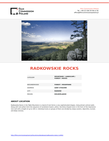 Film Commission Poland Tel. +48 22 556 54 90 or 92 office@filmcommissionpoland.pl RADKOWSKIE ROCKS CATEGORY MOUNTAINS / LANDSCAPE / FOREST / ROCKS NEIGHBORHOOD FOREST / MOUNTAINS ADDRESS GÓRY STOŁOWE CITY RADKÓW REGION DOLNOŚLĄSKIE ABOUT LOCATION Radkowskie Rocks in the Table Mountains is a band of rock forms a very sophisticated shapes, rising almost vertical walls. Along with rock pillars form the sequence of sandstone towers, pillars, fancifully shaped rocks in the form of the impressive rock wall with a height of up to 100 m. Individual rocks or groups of them are divided by steep couloirs, labyrinths, tunnels and deep crevices. http://filmcommissionpoland.pl/locations/database/radkowskie-skaly-LvkWzt