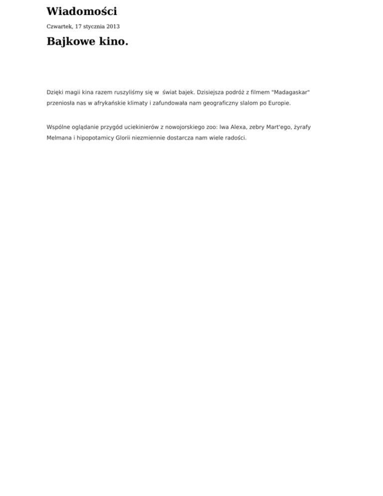 Wiadomości Czwartek, 17 stycznia 2013 Bajkowe kino. Dzięki magii kina razem ruszyliśmy się w świat bajek. Dzisiejsza podróż z filmem "Madagaskar" przeniosła nas w afrykańskie klimaty i zafundowała nam geograficzny slalom po Europie. Wspólne oglądanie przygód uciekinierów z nowojorskiego zoo: lwa Alexa, zebry Mart'ego, żyrafy Melmana i hipopotamicy Glorii niezmiennie dostarcza nam wiele radości.