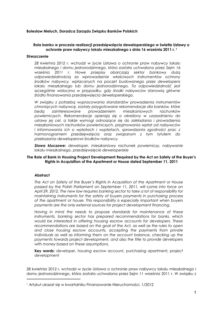 Bolesław Meluch, Doradca Zarządu Związku Banków Polskich Rola banku w procesie realizacji przedsięwzięcia deweloperskiego w świetle Ustawy o ochronie praw nabywcy lokalu mieszkalnego z dnia 16 września 2011 r. 1 Streszczenie 28 kwietnia 2012 r. wchodzi w życie Ustawa o ochronie praw nabywcy lokalu mieszkalnego i domu jednorodzinnego, która została uchwalona przez Sejm 16 września 2011 r. Nowe przepisy obarczają sektor bankowy dużą odpowiedzialnością za wprowadzenie właściwych instrumentów ochrony środków nabywcy, wpłacanych na poczet budowanego przez dewelopera lokalu mieszkalnego lub domu jednorodzinnego. Ta odpowiedzialność jest szczególnie widoczna w przypadku, gdy środki nabywców stanowią główne źródło finansowania przedsięwzięcia deweloperskiego. W związku z potrzebą wypracowania standardów prowadzenia instrumentów chroniących nabywcę, zostały przygotowane rekomendacje dla banków, które będą zainteresowane prowadzeniem mieszkaniowych rachunków powierniczych. Rekomendacje opierają się o określony w uzasadnieniu do ustawy jej cel, a także wymogi odnoszące się do zakładania i prowadzenia mieszkaniowych rachunków powierniczych, przyjmowania wpłat od nabywców i informowania ich o wpłatach i wypłatach, sprawdzania zgodności prac z harmonogramem przedsięwzięcia oraz związanym z tym tytułem do przekazania deweloperowi środków nabywcy. Słowa kluczowe: deweloper, mieszkaniowy rachunek powierniczy, nabywanie lokalu mieszkalnego, przedsięwzięcie deweloperskie The Role of Bank in Housing Project Development Required by the Act on Safety of the Buyer’s Rights in Acquisition of the Apartment or House dated September 11, 2011 Abstract The Act on Safety of the Buyer’s Rights in Acquisition of the Apartment or House passed by the Polish Parliament on September 11, 2011, will come into force on April 29, 2012. The new law requires banking sector to take a lot of responsibility for maintaining instruments for the safety of buyers payments in purchasing process of the apartment or house. This responsibility is especially important when buyers payments are the only external sources for project development financing. Having in mind the needs to propose standards for maintenance of these instruments, banking sector has prepared recommendations for banks, which would be interested in offering housing escrow accounts for developers. These recommendations are based on the goal of the Act, as well as the rules to open and close housing escrow accounts, accepting the payments from private individuals as well as informing them on the account balance, checking up the payments towards project development, and also the title to provide developers with money based on these assumptions. Key words: developer, housing escrow account, purchasing apartment, project development 28 kwietnia 2012 r. wchodzi w życie Ustawa o ochronie praw nabywcy lokalu mieszkalnego i domu jednorodzinnego, która została uchwalona przez Sejm 11 września 2011 r. W związku z 1 Artykuł ukazał się w kwartalniku Finansowanie Nieruchomości, 1/2012 1 potrzebą wypracowania standardów prowadzenia instrumentów chroniących nabywcę, zostały przygotowane rekomendacje dla banków, które będą zainteresowane prowadzeniem mieszkaniowych rachunków powierniczych. Przygotowując rekomendacje, uwzględniono następujące okoliczności i wymogi dotyczące prowadzenia mieszkaniowych rachunków powierniczych: 1. Nabywanie mieszkania w określonej fazie realizacji przedsięwzięcia deweloperskiego. Należy wziąć pod uwagę, iż zgodnie z zapisami Ustawy, bank nie ma obowiązku badać zdolności kredytowej dewelopera, dla którego otwiera otwarty mieszkaniowy rachunek powierniczy, ani badać jego finansowej zdolności do realizacji przedsięwzięcia deweloperskiego. Tym samym bank nie powinien gwarantować ukończenia przedsięwzięcia deweloperskiego z sukcesem ani wobec nabywcy, ani dewelopera. Jednakże w celu ograniczenia ryzyka nabywcy dokonującego wpłaty na poczet ceny mieszkania w fazie wstępnej przedsięwzięcia deweloperskiego, a także biorąc pod uwagę potencjalne ryzyko reputacji banku oferującego mieszkaniowy rachunek powierniczy dla przedsięwzięcia deweloperskiego finansowanego wyłącznie środkami nabywców, bank powinien przeprowadzić analizę tego przedsięwzięcia pod kątem jego wykonalności. W istniejących warunkach rynkowych można oczekiwać, iż trudno będzie deweloperom ograniczyć finansowanie zewnętrzne wyłącznie do wpłat nabywców. Tym samym, bank prowadzący rachunek powinien uwzględnić w swojej ofercie dla dewelopera uzupełniające wsparcie kredytowe. W pierwszej kolejności ocena przedsięwzięcia deweloperskiego przez bank będzie odnosić się do stwierdzenia, czy takie dokumenty, jak pozwolenie na budowę i jej harmonogram, są zgodne z przepisami Ustawy, co stanowi podstawę do otwarcia mieszkaniowego rachunku powierniczego. Czy deweloper ma pozostałe pozwolenia oraz podpisaną umowę z wykonawcą, czy wszystkie wymagane Ustawą informacje zostały zawarte we wzorze umowy deweloperskiej i prospekcie informacyjnym? Na etapie podejmowania przez bank decyzji o udzieleniu kredytu nabywcy nieruchomości dopuszczalne jest rozpatrzenie wniosku na podstawie dostarczonego przez niego jednostronnego zobowiązania dewelopera do zawarcia umowy deweloperskiej przed upływem konkretnego terminu, na określonych warunkach lub na podstawie prospektu informacyjnego, z wypełnioną częścią indywidualną. 2. Warunki otwierania instrumentów ochrony środków nabywcy. Ustawa nakazuje deweloperowi wskazanie jednego z czterech instrumentów ochrony środków nabywców. Tym samym wymagane jest, aby w umowie deweloperskiej wskazywać mieszkaniowy rachunek powierniczy jako rachunek wpłat należności za lokal. Bank prowadzący taki rachunek musi także uwzględniać fakt, iż środki nabywcy mogą pochodzić z kredytu hipotecznego, a więc, w