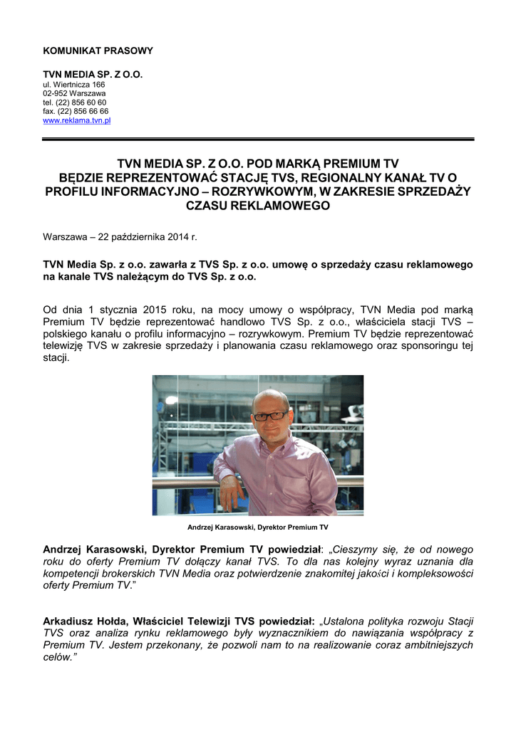 KOMUNIKAT PRASOWY TVN MEDIA SP. Z O.O. ul. Wiertnicza 166 02-952 Warszawa tel. (22) 856 60 60 fax. (22) 856 66 66 www.reklama.tvn.pl TVN MEDIA SP. Z O.O. POD MARKĄ PREMIUM TV BĘDZIE REPREZENTOWAĆ STACJĘ TVS, REGIONALNY KANAŁ TV O PROFILU INFORMACYJNO – ROZRYWKOWYM, W ZAKRESIE SPRZEDAŻY CZASU REKLAMOWEGO Warszawa – 22 października 2014 r. TVN Media Sp. z o.o. zawarła z TVS Sp. z o.o. umowę o sprzedaży czasu reklamowego na kanale TVS należącym do TVS Sp. z o.o. Od dnia 1 stycznia 2015 roku, na mocy umowy o współpracy, TVN Media pod marką Premium TV będzie reprezentować handlowo TVS Sp. z o.o., właściciela stacji TVS – polskiego kanału o profilu informacyjno – rozrywkowym. Premium TV będzie reprezentować telewizję TVS w zakresie sprzedaży i planowania czasu reklamowego oraz sponsoringu tej stacji. Andrzej Karasowski, Dyrektor Premium TV Andrzej Karasowski, Dyrektor Premium TV powiedział: „Cieszymy się, że od nowego roku do oferty Premium TV dołączy kanał TVS. To dla nas kolejny wyraz uznania dla kompetencji brokerskich TVN Media oraz potwierdzenie znakomitej jakości i kompleksowości oferty Premium TV.” Arkadiusz Hołda, Właściciel Telewizji TVS powiedział: „Ustalona polityka rozwoju Stacji TVS oraz analiza rynku reklamowego były wyznacznikiem do nawiązania współpracy z Premium TV. Jestem przekonany, że pozwoli nam to na realizowanie coraz ambitniejszych celów.” Arkadiusz Hołda, Właściciel, Prezes Telewizji TVS Telewizja TVS to telewizja o charakterze uniwersalnym skierowana przede wszystkim do mieszkańców Śląska i Zagłębia. Mimo regionalnego charakteru stacja oglądana jest w całej Polsce; obejmuje zasięgiem technicznym 61% kraju (dane za sierpień 2014 roku). TVS to telewizja wielopokoleniowa, oferująca szeroki wachlarz różnorodnych programów o charakterze informacyjnym i rozrywkowym; począwszy od codziennego serwisu informacyjnego, prognozy pogody, przez programy rozrywkowe i life stylowe, aż po programy sportowe, gospodarcze i biznesowe. Stacja TVS osiąga bardzo dobre wyniki oglądalności. W okresie od stycznia do września 2014 roku jej udział w rynku oglądalności telewizyjnej wyniósł 0,19% w komercyjnej grupie celowej (obejmującej osoby w wieku 16-49 lat). Premium TV jest częścią biura reklamy TVN Media. Oferta Premium TV przeznaczona dla reklamodawców obejmuje różnorodne kanały tematyczne i nowe ogólnokrajowe kanały naziemnej telewizji cyfrowej. W celu uzyskania dalszych informacji proszę kontaktować się z: Emilia Ordon Dyrektor Public Relations i Komunikacji Korporacyjnej TVN S.A. tel. (+48 22) 856 67 97 e-mail: [email protected] 2/2