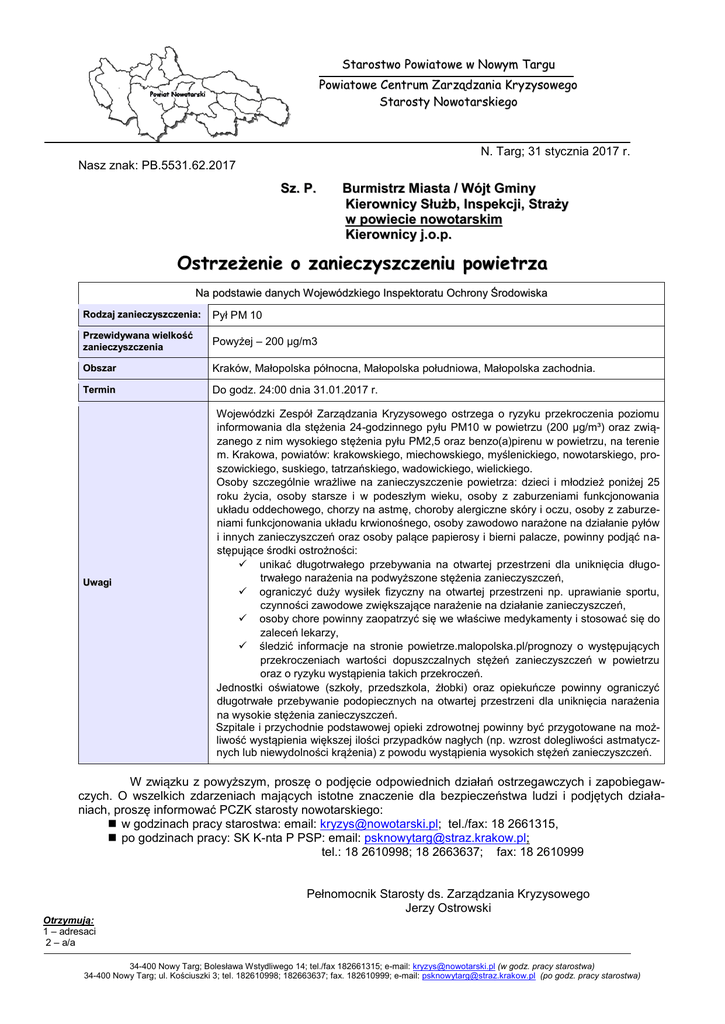 Starostwo Powiatowe w Nowym Targu Powiatowe Centrum Zarządzania Kryzysowego Starosty Nowotarskiego N. Targ; 31 stycznia 2017 r. Nasz znak: PB.5531.62.2017 Sz. P. Burmistrz Miasta / Wójt Gminy Kierownicy Służb, Inspekcji, Straży w powiecie nowotarskim Kierownicy j.o.p. Ostrzeżenie o zanieczyszczeniu powietrza Na podstawie danych W ojewódzkiego Inspektoratu Ochrony Środowiska Rodzaj zanieczyszczenia: Pył PM 10 Przewidywana wielkość zanieczyszczenia Powyżej – 200 μg/m3 Obszar Kraków, Małopolska północna, Małopolska południowa, Małopolska zachodnia. Termin Do godz. 24:00 dnia 31.01.2017 r. Uwagi Wojewódzki Zespół Zarządzania Kryzysowego ostrzega o ryzyku przekroczenia poziomu informowania dla stężenia 24-godzinnego pyłu PM10 w powietrzu (200 µg/m³) oraz związanego z nim wysokiego stężenia pyłu PM2,5 oraz benzo(a)pirenu w powietrzu, na terenie m. Krakowa, powiatów: krakowskiego, miechowskiego, myślenickiego, nowotarskiego, proszowickiego, suskiego, tatrzańskiego, wadowickiego, wielickiego. Osoby szczególnie wrażliwe na zanieczyszczenie powietrza: dzieci i młodzież poniżej 25 roku życia, osoby starsze i w podeszłym wieku, osoby z zaburzeniami funkcjonowania układu oddechowego, chorzy na astmę, choroby alergiczne skóry i oczu, osoby z zaburzeniami funkcjonowania układu krwionośnego, osoby zawodowo narażone na działanie pyłów i innych zanieczyszczeń oraz osoby palące papierosy i bierni palacze, powinny podjąć następujące środki ostrożności: unikać długotrwałego przebywania na otwartej przestrzeni dla uniknięcia długotrwałego narażenia na podwyższone stężenia zanieczyszczeń, ograniczyć duży wysiłek fizyczny na otwartej przestrzeni np. uprawianie sportu, czynności zawodowe zwiększające narażenie na działanie zanieczyszczeń, osoby chore powinny zaopatrzyć się we właściwe medykamenty i stosować się do zaleceń lekarzy, śledzić informacje na stronie powietrze.malopolska.pl/prognozy o występujących przekroczeniach wartości dopuszczalnych stężeń zanieczyszczeń w powietrzu oraz o ryzyku wystąpienia takich przekroczeń. Jednostki oświatowe (szkoły, przedszkola, żłobki) oraz opiekuńcze powinny ograniczyć długotrwałe przebywanie podopiecznych na otwartej przestrzeni dla uniknięcia narażenia na wysokie stężenia zanieczyszczeń. Szpitale i przychodnie podstawowej opieki zdrowotnej powinny być przygotowane na możliwość wystąpienia większej ilości przypadków nagłych (np. wzrost dolegliwości astmatycznych lub niewydolności krążenia) z powodu wystąpienia wysokich stężeń zanieczyszczeń. W związku z powyższym, proszę o podjęcie odpowiednich działań ostrzegawczych i zapobiegawczych. O wszelkich zdarzeniach mających istotne znaczenie dla bezpieczeństwa ludzi i podjętych działaniach, proszę informować PCZK starosty nowotarskiego: w godzinach pracy starostwa: email: [email protected]; tel./fax: 18 2661315, po godzinach pracy: SK K-nta P PSP: email: [email protected]; tel.: 18 2610998; 18 2663637; fax: 18 2610999 Pełnomocnik Starosty ds. Zarządzania Kryzysowego Jerzy Ostrowski Otrzymują: 1 – adresaci 2 – a/a 34-400 Nowy Targ; Bolesława Wstydliwego 14; tel./fax 182661315; e-mail: [email protected] (w godz. pracy starostwa) 34-400 Nowy Targ; ul. Kościuszki 3; tel. 182610998; 182663637; fax. 182610999; e-mail: [email protected] (po godz. pracy starostwa)