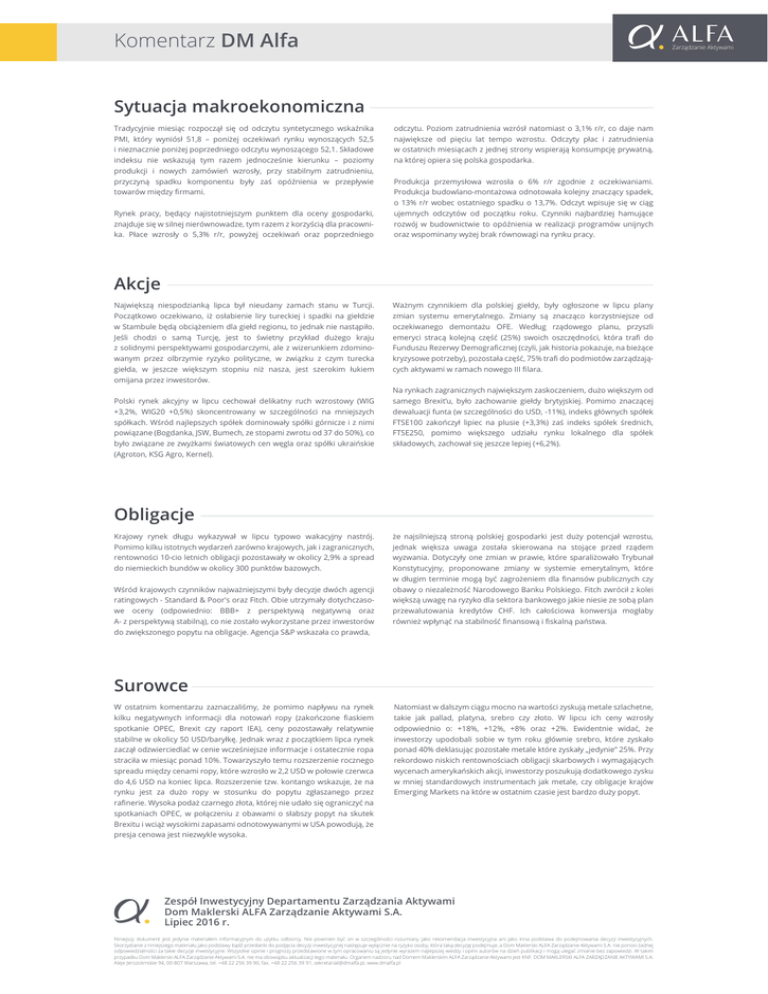 Komentarz DM Alfa Zarządzanie Aktywami Sytuacja makroekonomiczna Tradycyjnie miesiąc rozpoczął się od odczytu syntetycznego wskaźnika PMI, który wyniósł 51,8 – poniżej oczekiwań rynku wynoszących 52,5 i nieznacznie poniżej poprzedniego odczytu wynoszącego 52,1. Składowe indeksu nie wskazują tym razem jednocześnie kierunku – poziomy produkcji i nowych zamówień wzrosły, przy stabilnym zatrudnieniu, przyczyną spadku komponentu były zaś opóźnienia w przepływie towarów między firmami. Rynek pracy, będący najistotniejszym punktem dla oceny gospodarki, znajduje się w silnej nierównowadze, tym razem z korzyścią dla pracownika. Płace wzrosły o 5,3% r/r, powyżej oczekiwań oraz poprzedniego odczytu. Poziom zatrudnienia wzrósł natomiast o 3,1% r/r, co daje nam największe od pięciu lat tempo wzrostu. Odczyty płac i zatrudnienia w ostatnich miesiącach z jednej strony wspierają konsumpcję prywatną, na której opiera się polska gospodarka. Produkcja przemysłowa wzrosła o 6% r/r zgodnie z oczekiwaniami. Produkcja budowlano-montażowa odnotowała kolejny znaczący spadek, o 13% r/r wobec ostatniego spadku o 13,7%. Odczyt wpisuje się w ciąg ujemnych odczytów od początku roku. Czynniki najbardziej hamujące rozwój w budownictwie to opóźnienia w realizacji programów unijnych oraz wspominany wyżej brak równowagi na rynku pracy. Akcje Największą niespodzianką lipca był nieudany zamach stanu w Turcji. Początkowo oczekiwano, iż osłabienie liry tureckiej i spadki na giełdzie w Stambule będą obciążeniem dla giełd regionu, to jednak nie nastąpiło. Jeśli chodzi o samą Turcję, jest to świetny przykład dużego kraju z solidnymi perspektywami gospodarczymi, ale z wizerunkiem zdominowanym przez olbrzymie ryzyko polityczne, w związku z czym turecka giełda, w jeszcze większym stopniu niż nasza, jest szerokim łukiem omijana przez inwestorów. Polski rynek akcyjny w lipcu cechował delikatny ruch wzrostowy (WIG +3,2%, WIG20 +0,5%) skoncentrowany w szczególności na mniejszych spółkach. Wśród najlepszych spółek dominowały spółki górnicze i z nimi powiązane (Bogdanka, JSW, Bumech, ze stopami zwrotu od 37 do 50%), co było związane ze zwyżkami światowych cen węgla oraz spółki ukraińskie (Agroton, KSG Agro, Kernel). Ważnym czynnikiem dla polskiej giełdy, były ogłoszone w lipcu plany zmian systemu emerytalnego. Zmiany są znacząco korzystniejsze od oczekiwanego demontażu OFE. Według rządowego planu, przyszli emeryci stracą kolejną część (25%) swoich oszczędności, która trafi do Funduszu Rezerwy Demograficznej (czyli, jak historia pokazuje, na bieżące kryzysowe potrzeby), pozostała część, 75% trafi do podmiotów zarządzających aktywami w ramach nowego III filara. Na rynkach zagranicznych największym zaskoczeniem, dużo większym od samego Brexit’u, było zachowanie giełdy brytyjskiej. Pomimo znaczącej dewaluacji funta (w szczególności do USD, -11%), indeks głównych spółek FTSE100 zakończył lipiec na plusie (+3,3%) zaś indeks spółek średnich, FTSE250, pomimo większego udziału rynku lokalnego dla spółek składowych, zachował się jeszcze lepiej (+6,2%). Obligacje Krajowy rynek długu wykazywał w lipcu typowo wakacyjny nastrój. Pomimo kilku istotnych wydarzeń zarówno krajowych, jak i zagranicznych, rentowności 10-cio letnich obligacji pozostawały w okolicy 2,9% a spread do niemieckich bundów w okolicy 300 punktów bazowych. Wśród krajowych czynników najważniejszymi były decyzje dwóch agencji ratingowych - Standard & Poor's oraz Fitch. Obie utrzymały dotychczasowe oceny (odpowiednio: BBB+ z perspektywą negatywną oraz A- z perspektywą stabilną), co nie zostało wykorzystane przez inwestorów do zwiększonego popytu na obligacje. Agencja S&P wskazała co prawda, że najsilniejszą stroną polskiej gospodarki jest duży potencjał wzrostu, jednak większa uwaga została skierowana na stojące przed rządem wyzwania. Dotyczyły one zmian w prawie, które sparaliżowało Trybunał Konstytucyjny, proponowane zmiany w systemie emerytalnym, które w długim terminie mogą być zagrożeniem dla finansów publicznych czy obawy o niezależność Narodowego Banku Polskiego. Fitch zwrócił z kolei większą uwagę na ryzyko dla sektora bankowego jakie niesie ze sobą plan przewalutowania kredytów CHF. Ich całościowa konwersja mogłaby również wpłynąć na stabilność finansową i fiskalną państwa. Surowce W ostatnim komentarzu zaznaczaliśmy, że pomimo napływu na rynek kilku negatywnych informacji dla notowań ropy (zakończone fiaskiem spotkanie OPEC, Brexit czy raport IEA), ceny pozostawały relatywnie stabilne w okolicy 50 USD/baryłkę. Jednak wraz z początkiem lipca rynek zaczął odzwierciedlać w cenie wcześniejsze informacje i ostatecznie ropa straciła w miesiąc ponad 10%. Towarzyszyło temu rozszerzenie rocznego spreadu między cenami ropy, które wzrosło w 2,2 USD w połowie czerwca do 4,6 USD na koniec lipca. Rozszerzenie tzw. kontango wskazuje, że na rynku jest za dużo ropy w stosunku do popytu zgłaszanego przez rafinerie. Wysoka podaż czarnego złota, której nie udało się ograniczyć na spotkaniach OPEC, w połączeniu z obawami o słabszy popyt na skutek Brexitu i wciąż wysokimi zapasami odnotowywanymi w USA powodują, że presja cenowa jest niezwykle wysoka. Natomiast w dalszym ciągu mocno na wartości zyskują metale szlachetne, takie jak pallad, platyna, srebro czy złoto. W lipcu ich ceny wzrosły odpowiednio o: +18%, +12%, +8% oraz +2%. Ewidentnie widać, że inwestorzy upodobali sobie w tym roku głównie srebro, które zyskało ponad 40% deklasując pozostałe metale które zyskały „jedynie” 25%. Przy rekordowo niskich rentownościach obligacji skarbowych i wymagających wycenach amerykańskich akcji, inwestorzy poszukują dodatkowego zysku w mniej standardowych instrumentach jak metale, czy obligacje krajów Emerging Markets