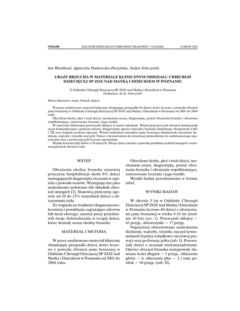 FOLIUM Urazy brzucha w ROCZNIK CHIRURGII URAZOWEJ 9 (XXXIII) LUBLIN 2005 materialeDZIECIĘCEJ klinicznym Oddziału Chirurgii Dziecięcej SP ZOZ ... w Poznaniu 83 Jan Wendland, Agnieszka Pankowska-Paszyńska, Stefan Sobczyński URAZY BRZUCHA W MATERIALE KLINICZNYM ODDZIAŁU CHIRURGII DZIECIĘCEJ SP ZOZ NAD MATKĄ I DZIECKIEM W POZNANIU Z Oddziału Chirurgii Dziecięcej SP ZOZ nad Matką i Dzieckiem w Poznaniu Ordynator: dr St. Sobczyński Słowa kluczowe: urazy, brzuch, dzieci. W pracy analizowano materiał kliniczny obejmujący przypadki 60 dzieci, które leczono z powodu obrażeń jamy brzusznej w Oddziale Chirurgii Dziecięcej SP ZOZ nad Matką i Dzieckiem w Poznaniu od 2001 do 2004 roku. Określono liczbę, płeć i wiek dzieci, mechanizm urazu, diagnostykę, postać obrażenia brzucha i obrażenia współistniejące, zastosowane leczenie i jego wyniki. W materiale klinicznym przeważali chłopcy w wieku szkolnym. Wśród przyczyn tych obrażeń dominowały urazy komunikacyjne i podczas zabawy. Diagnostyka oprócz wywiadu i badania fizykalnego obejmowała USG i TK oraz badanie podczas operacji. Wśród uszkodzeń narządów jamy brzusznej dominowały obrażenia śledziony, wątroby i trzustki oraz jelit. Dzieci z krwawieniem do otrzewnej niemożliwym do zachowawczego opanowania oraz z perforacją jelit leczono operacyjnie. Wyniki leczenia były dobre u 58 chorych. Dwoje dzieci zmarło z powodu powikłań ciężkich mnogich i wielonarządowych obrażeń ciała. WSTĘP Obrażenia okolicy brzucha stanowią przyczynę hospitalizacji około 8% dzieci wymagających diagnostyki i leczenia w szpitalu z powodu urazów. Występują one jako uszkodzenia izolowane lub składnik obrażeń mnogich [1]. Stanowią przyczynę zgonów od 10 do 15% wszystkich dzieci z obrażeniami ciała. Ze względu na trudności diagnostycznolecznicze i powikłania zagrażające zdrowiu lub życiu chorego, autorzy pracy przedstawili swoje doświadczenia w terapii dzieci, które doznały urazu okolicy brzucha. MATERIAŁ I METODA W pracy analizowano materiał kliniczny obejmujący przypadki dzieci, które leczono z powodu obrażeń jamy brzusznej w Oddziale Chirurgii Dziecięcej SP ZOZ nad Matką i Dzieckiem w Poznaniu od 2001 do 2004 roku. Określono liczbę, płeć i wiek dzieci, mechanizm urazu, diagnostykę, postać obrażenia brzucha i obrażenia współistniejące, zastosowane leczenie i jego wyniki. Wyniki badań przedstawiono w formie tabel. WYNIKI BADAŃ W okresie 5 lat w Oddziale Chirurgii Dziecięcej SP ZOZ nad Matką i Dzieckiem w Poznaniu leczono 60 dzieci z obrażeniami jamy brzusznej w wieku 4-16 lat (średnia 10 lat) (ryc. 1). Przeważali chłopcy − 43 przyp., dziewczynki − 17 przyp. Najczęściej obserwowano uszkodzenia śledziony, wątroby, trzustki, naczyń krwionośnych (tętnicy żołądkowo-sieciowej prawej) oraz perforacje jelita (tab. I). Przeważały dzieci z urazami wielonarządowymi. Oprócz obrażeń brzucha występowały złamania kości długich − 5 przyp., stłuczenia głowy − 6, stłuczenia płuc − 2 i rany powłok − 10 przyp. (tab. II). 84 J. Wendland, A. Pankowska-Paszyńska, S. Sobczyński U większości dzieci − 39 przyp. głównym źródłem krwawienia była śledziona. Dwunastu pacjentów wymagało laparotomii z powodu silnego krwawienia do jamy otrzewnej i wykonania splenektomii. Przebieg kliniczny monitorowano przy pomocy badania klinicznego, USG i badań laboratoryjnych. U jednego dziecka wykonano punkcję zwiadowczą jamy otrzewnej. U dzieci z towarzyszącymi uszkodzeniami OUN 3-krotnie wykonano TK głowy. Zachowawczo leczono urazy wątroby − 7 przyp. Stłuczenia trzustki − 4 dzieci wy- (girls) (children) (boys) Ryc. 1. Płeć dzieci z obrażeniami jamy brzusznej Fig. 1. Sex of children with abdominal injuries Tabela II. Urazy Table II. Injuries Uraz izolowany – 42 Isolated injury Najczęściej śledziona i wątroba Most often spleen and liver Uraz wielonarządowy – 18 Multiorgan injury Najczęściej ze złamaniami kości długich – 5 Most often with long bones’ fractures Urazy czaszkowomózgowe – 6 Craino-cerebral injuries Stłuczenie płuca – 2 Lung contusion Rany powłoki brzucha – 10 Wounds of abdominal wall wołane były przez uderzenie kierownicą roweru, bezpośrednie uderzenie lub przez ucisk pasów bezpieczeństwa. U 3 dzieci przebieg był łagodny. U czwartego pacjenta rozwinęło się po urazie ostre zapalenie trzustki o ciężkim przebiegu klinicznym. Tabela I. Uszkodzone narządy jamy brzusznej Table I. Injured abdominal organs Narząd Organ Liczba przyp. Number of cases Śledziona Spleen Wątroba Liver Trzustka Pancreas Perforacja jelita Intestinal perforation Uszkodzenie t. Ŝołądkowosieciowej prawej Injury of right gastro-epiploic artery Inne Others 39 7 4 1 1 8 Tabela III. Przyczyny urazów Table III. Causes of traumas Przyczyna urazu Cause of trauma Upadek z roweru Fall from a bicycle Upadek z wysokości Fall from height Pasy bezpieczeństwa Seat belts Tępy uraz Blunt trauma Uderzenie kijem Hit with a stick Liczba przyp. Number of cases 20 15 7 9 9 Urazy brzucha w materiale klinicznym Oddziału Chirurgii Dziecięcej SP ZOZ ... w Poznaniu Nie obserwowano wytworzenia się torbieli pourazowej. W przypadku urazowego uszkodzenia tętnicy żołądkowo-sieciowej prawej (tępy uraz metalowym prętem w brzuch) wykonano doraźnie zabieg chirurgiczny z powodu silnego krwawienia. U dzieci z urazami brzucha powodującymi perforacje jelit wykonywano doraźnie laparotomie. W urazach wielonarządowych obserwowano poza urazami brzucha rozległe rany, złamania kości długich, stłuczenia płuc i nerek, urazy OUN, urazy miednicy. Wyniki leczenia znaczącej większości dzieci były dobre. Dwoje dzieci zmarło z powodu ciężkich obrażeń wielomiejscowych i wielonarządowych. Pobyt dziecka w oddziale trwał średnio 8 dni (tab. III). OMÓWIENIE Jednym z najczęstszych następstw tępych urazów narządów brzucha jest pęknięcie śledziony [2