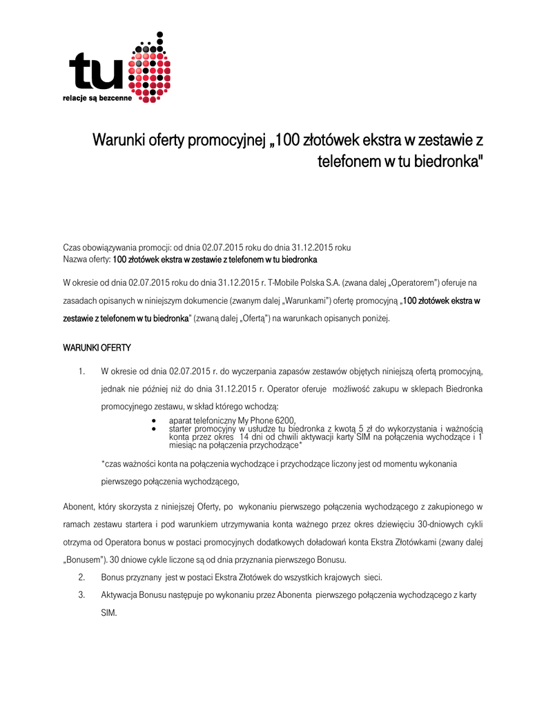 Warunki oferty promocyjnej „100 złotówek ekstra w zestawie z telefonem w tu biedronka" Czas obowiązywania promocji: od dnia 02.07.2015 roku do dnia 31.12.2015 roku Nazwa oferty: 100 złotówek ekstra w zestawie z telefonem w tu biedronka W okresie od dnia 02.07.2015 roku do dnia 31.12.2015 r. T-Mobile Polska S.A. (zwana dalej „Operatorem”) oferuje na zasadach opisanych w niniejszym dokumencie (zwanym dalej „Warunkami”) ofertę promocyjną „100 złotówek ekstra w zestawie z telefonem w tu biedronka” (zwaną dalej „Ofertą”) na warunkach opisanych poniżej. WARUNKI OFERTY 1. W okresie od dnia 02.07.2015 r. do wyczerpania zapasów zestawów objętych niniejszą ofertą promocyjną, jednak nie później niż do dnia 31.12.2015 r. Operator oferuje możliwość zakupu w sklepach Biedronka promocyjnego zestawu, w skład którego wchodzą: aparat telefoniczny My Phone 6200, starter promocyjny w usłudze tu biedronka z kwotą 5 zł do wykorzystania i ważnością konta przez okres 14 dni od chwili aktywacji karty SIM na połączenia wychodzące i 1 miesiąc na połączenia przychodzące* *czas ważności konta na połączenia wychodzące i przychodzące liczony jest od momentu wykonania pierwszego połączenia wychodzącego, Abonent, który skorzysta z niniejszej Oferty, po wykonaniu pierwszego połączenia wychodzącego z zakupionego w ramach zestawu startera i pod warunkiem utrzymywania konta ważnego przez okres dziewięciu 30-dniowych cykli otrzyma od Operatora bonus w postaci promocyjnych dodatkowych doładowań konta Ekstra Złotówkami (zwany dalej „Bonusem”). 30 dniowe cykle liczone są od dnia przyznania pierwszego Bonusu. 2. Bonus przyznany jest w postaci Ekstra Złotówek do wszystkich krajowych sieci. 3. Aktywacja Bonusu następuje po wykonaniu przez Abonenta pierwszego połączenia wychodzącego z karty SIM. 4. Pierwsze promocyjne doładowanie Bonusem zostanie przyznane Abonentowi w terminie do 72 godzin po wykonaniu pierwszego połączenia. 5. Kolejne promocyjne doładowania Bonusem będą przyznawane Abonentowi cyklicznie co 30 dni. Warunkiem otrzymania doładowania jest konto ważne na połączenia wychodzące w ciągu całego dnia w którym ma być przyznany Bonus. Jednostki przyznane w ramach Bonusu są ważne przez 30 dni licząc od momentu przyznania Bonusu potwierdzonego SMS-em, po tym okresie przepadają, z uwzględnieniem zapisu w pkt 10.c. 6. Kolejne promocyjne doładowania Bonusem będą przyznawane w równej kwocie 10 Ekstra Złotówek. 7. Abonent może otrzymać maksymalnie 10 Bonusów - Abonent w ramach Oferty może otrzymać łącznie maksymalnie 100 Ekstra Złotówek. 8. Przyznanie doładowania Bonusem zostanie potwierdzone przez Operatora komunikatem SMS. 9. Brak posiadania konta ważnego na połączenia wychodzące w danym dniu przyznania Bonusu nie spowoduje wykluczenia Abonenta z promocji. Promocyjne doładowanie nie zostanie przyznane w danym cyklu, zostanie przyznane w kolejnym cyklu, w którym konto będzie ważne na połączenia wychodzące w sposób określony powyżej. 10. Bonus w postaci promocyjnych doładowań, o których mowa w pkt 2 będzie przyznawany na niżej określonych warunkach: a. Ekstra Złotówki przyznane w ramach niniejszej oferty są rozliczane w pierwszej kolejności przed zgromadzoną na koncie kwotą złotych (PLN), o ile warunki ofert, z których korzysta Abonent nie stanowią inaczej. b. Ekstra Złotówki można wykorzystać na krajowe połączenia głosowe i wideo do wszystkich sieci komórkowych i stacjonarnych w Polsce, SMS-y i MMS-y. Ekstra Złotówki nie mogą być wykorzystane na Numery premium, Numery usługowe i specjalne, Roaming, pakietową transmisję danych, Przeniesienie połączenia oraz zakup innych ofert dostępnych w tu biedronka. c. W przypadku posiadania przez Abonenta Ekstra Złotówek przyznanych w ramach innych ofert, środki te sumują się z Ekstra Złotówkami przyznanymi w ramach niniejszej oferty, a termin ważności takiej sumy: pozostaje bez zmian, jeśli ważność nowo nabytych Ekstra Złotówek jest krótsza niż tych, które były już zgromadzone na koncie; jest naliczana od nowa, zgodnie z datą ważności nowo nabytych Ekstra Złotówek, jeśli data ważności nowo nabytych Ekstra Złotówek jest późniejsza niż tych, które już były zgromadzone na koncie. 11. Nie ma możliwości rezygnacji z przyznanego Bonusu. 12. Kwotę pozostałych do wykorzystania Ekstra Złotówek można sprawdzić poprzez wysłanie ekspresowego kodu *101# (po wybraniu opcji 1) POZOSTAŁE WARUNKI 13. Korzystając z warunków niniejszej promocji, Abonent nie może używać Karty SIM do: 13.1. maszynowego (ruch typu „maszyna do maszyny” lub „maszyna do użytkownika”) generowania połączeń, w tym wysyłania wiadomości SMS lub MMS, 13.2. przesyłania znacznej liczby informacji o tożsamej lub podobnej treści, przeznaczonych do promowania towarów, usług czy wizerunku 14. Naruszenie któregokolwiek z zakazów, o których mowa powyżej, stanowi dla Operatora podstawę do rozwiązania umowy o świadczenie usług telekomunikacyjnych ze skutkiem natychmiastowym. 15. W sprawach nieuregulowanych w niniejszych warunkach, zastosowanie mają postanowienia Regulaminu Świadczenia Usług Telekomunikacyjnych przedpłaconych w tu biedronka, który jest podany do publicznej wiadomości na stronie www.tubiedronka.pl. 16. Operator zastrzega sobie prawo do odwołania Oferty w każdym czasie bez podawania przyczyn, co nie będzie naruszać praw nabytych Abonenta . 17. O każdej zmianie Operator będzie informował poprzez stronę http://www.tubiedronka.pl. 18. Podane ceny jednostkowe zawierają podatek VAT wyliczony według stawki 23 %. Zgodnie z obowiązującymi przepisami, obowiązek podatkowy w podatku VAT powstaje w chwili sprzedaży kuponu lub innej formy doładowania konta. Stan konta oraz wartość poszczególnych połączeń, SMS-ów i usług będą wyliczane w oparciu o ceny netto. Przy informowani