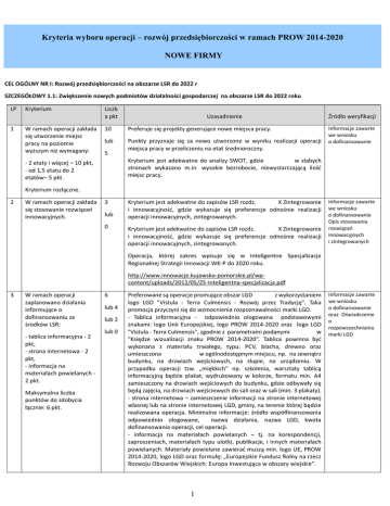 Kryteria wyboru operacji – rozwój przedsiębiorczości w ramach PROW 2014-2020 NOWE FIRMY CEL OGÓLNY NR I: Rozwój przedsiębiorczości na obszarze LSR do 2022 r SZCZEGÓŁOWY 1.1: Zwiększenie nowych podmiotów działalności gospodarczej na obszarze LSR do 2022 roku LP 1 Kryterium W ramach operacji zakłada się utworzenie miejsc pracy na poziomie wyższym niż wymagany: Liczb a pkt Uzasadnienie 10 Preferuje się projekty generujące nowe miejsca pracy. lub Punkty przyznaje się za nowo utworzone w wyniku realizacji operacji miejsca pracy w przeliczeniu na etat średnioroczny. 5 Źródło weryfikacji Informacje zawarte we wniosku o dofinansowanie Kryterium jest adekwatne do analizy SWOT, gdzie w słabych stronach wykazano m.in. wysokie bezrobocie, niewystarczającą ilość miejsc pracy. - 2 etaty i więcej – 10 pkt, - od 1,5 etatu do 2 etatów– 5 pkt. Kryterium rozłączne. 2 W ramach operacji zakłada się stosowanie rozwiązań innowacyjnych. 3 lub 0 Kryterium jest adekwatne do zapisów LSR rozdz. X Zintegrowanie i innowacyjność, gdzie wykazuje się preferencje odnośnie realizacji operacji innowacyjnych, zintegrowanych. Kryterium jest adekwatne do zapisów LSR rozdz. X Zintegrowanie i innowacyjność, gdzie wykazuje się preferencje odnośnie realizacji operacji innowacyjnych, zintegrowanych. Informacje zawarte we wniosku o dofinansowanie Opis stosowania rozwiązań innowacyjnych i zintegrowanych Operacja, której zakres wpisuje się w Inteligentne Specjalizacje Regionalnej Strategii Innowacji WK-P do 2020 roku. http://www.innowacje.kujawsko-pomorskie.pl/wpcontent/uploads/2012/05/Z5-Inteligentna-specjalizacja.pdf 3 W ramach operacji zaplanowano działania informujące o dofinansowaniu ze środków LSR: - tablica informacyjna - 2 pkt, - strona internetowa - 2 pkt, - informacja na materiałach powielanych 2 pkt. Maksymalna liczba punktów do zdobycia łącznie: 6 pkt. 6 lub 4 lub 2 lub 0 Preferowane są operacje promujące obszar LGD z wykorzystaniem logo LGD "Vistula - Terra Culmensis - Rozwój przez Tradycję". Taka promocja przyczyni się do wzmocnienia rozpoznawalności marki LGD. - Tablica informacyjna - odpowiednio ologowana podstawowymi znakami: logo Unii Europejskiej, logo PROW 2014-2020 oraz logo LGD "Vistula - Terra Culmensis", zgodnie z parametrami podanymi w "Księdze wizualizacji znaku PROW 2014-2020”. Tablica powinna być wykonana z materiału trwałego, typu: PCV, blacha, drewno oraz umieszczona w ogólnodostępnym miejscu, np. na zewnątrz budynku, na drzwiach wejściowych, na słupie, na urządzeniu. W przypadku operacji tzw. „miękkich” np. szkolenia, warsztaty tablicą informacyjną będzie plakat, wydrukowany w kolorze, formatu min. A4 zamieszczony na drzwiach wejściowych do budynku, gdzie odbywały się będą zajęcia, na drzwiach wejściowych do sali oraz w sali (min. 3 plakaty). - strona internetowa – zamieszczenie informacji na stronie internetowej własnej lub na stronie internetowej LGD, gminy, na terenie której będzie realizowana operacja. Minimalne informacje: źródło współfinansowania odpowiednio ologowane, nazwa działania, nazwa LGD, kwota dofinansowania operacji, cel operacji. - informacja na materiałach powielanych – tj. na korespondencji, zaproszeniach, materiałach typu ulotki, publikacje, i innych materiałach powielanych. Materiały powielane zawierać muszą min. logo UE, PROW 2014-2020, logo LGD oraz formułę: „Europejskie Fundusz Rolny na rzecz Rozwoju Obszarów Wiejskich: Europa Inwestująca w obszary wiejskie”. 1 Informacje zawarte we wniosku o dofinansowanie oraz Oświadczenie o rozpowszechnianiu marki LGD 4 W ramach operacji zaplanowano uruchomienie działalności gospodarczej, której podstawę będą stanowiły lokalne produkty rolne. 2 lub 0 Lokalny produkt rolny to produkt wytwarzany, pozyskiwany na obszarze gmin wchodzących w skład LGD „Vistula”. Preferuje się wspieranie lokalnego rynku, sieciowanie przedsiębiorców, producentów, pozyskiwanie partnerów a tym samym wspieranie finansowo dostawców produktów z obszaru LGD „Vistula”. Informacje zawarte we wniosku o dofinansowanie oraz Opis wykorzystania produktów lokalnych Analiza SWOT wskazuje na: zbyt niską świadomość ekologiczną, w tym zbyt niski poziom wykorzystania zasobów przyrodniczych, na zbyt niski poziom współpracy międzysektorowej i dialogu społecznego, na niską aktywność gospodarczą mieszkańców, na niewystarczająco rozwinięty sektor przetwórstwa lokalnego. W mocnych stronach wskazuje się na: rozwinięte rolnictwo, a w szansach na: rosnące zainteresowanie produktami lokalnymi, tradycyjnymi i ekologicznymi; stworzenie sprawnych łańcuchów sprzedaży i rynków zbytu dla lokalnych produktów. 5 Wnioskowana kwota pomocy: - nie przekracza 60 tys. zł 15 pkt, - jest wyższa niż 60 tys. i nie przekracza 80 tys. zł 10 pkt. 15 lub 10 lub 0 Kryterium rozłączne. 6 Planowany czas realizacji operacji: - jest mniejszy lub równy 3 miesiące- 15 pkt, - jest wyższy niż 3 miesiące i nie przekracza 6 miesięcy - 8 pkt. Preferuje się operacje o niższej wartości wnioskowanej pomocy, co gwarantuje otrzymanie dotacji przez większą liczbę osób z obszaru, a tym samym stworzenie większej liczby miejsc pracy i zmniejszeniu bezrobocia. Informacje zawarte we wniosku o dofinansowanie Kryterium jest adekwatne do analizy SWOT, gdzie w słabych stronach wykazano m.in.: małą liczbę przedsiębiorstw, wysokie bezrobocie, niewystarczająca ilość miejsc pracy. Uwaga: zapis „nie przekracza” oznacza, iż kwota jest niższa lub równa 60 tys. w pierwszym przypadku i 80 tys. w drugim przypadku 15 lub 8 lub 0 Preferowane są operacje realizowane w krótszym terminie ze względu na konieczność płynnego rozliczenia środków. Operacje zrealizowane w terminie szybszym, pozwalają w przypadku powstania oszczędności, ogłosić kolejny konkurs, tym samym dać szansę innym Wnioskodawcom ubiegać się o środki. Informacje zaw